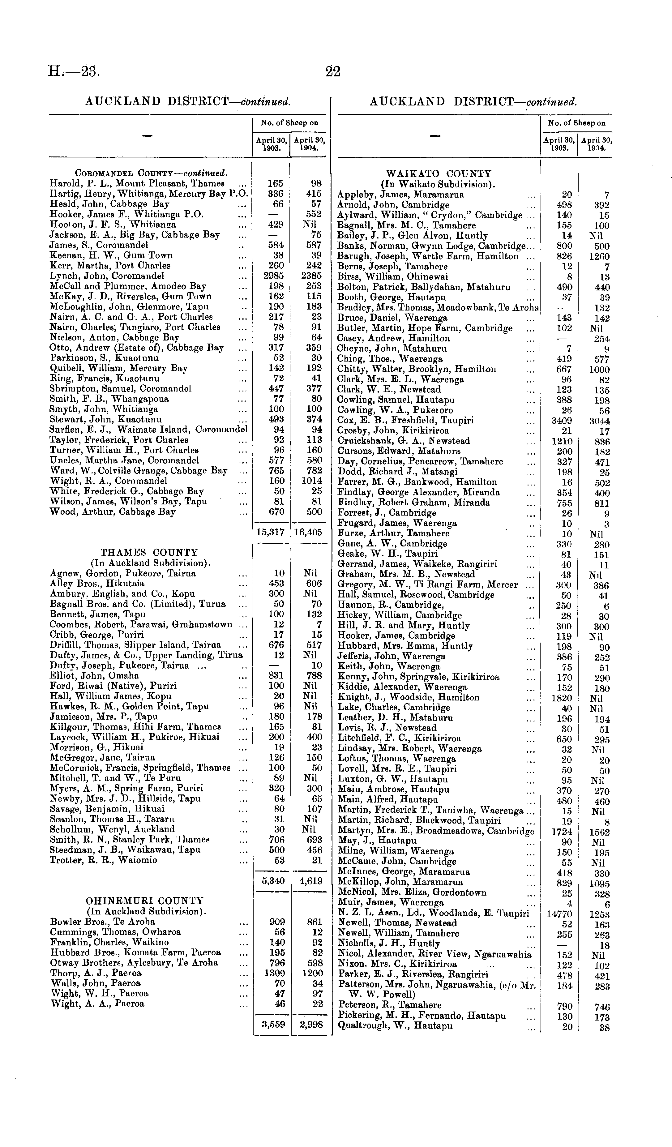 No. of Sheep on April 30, 1903. April 30, 1904. Coromandel County— continued. Harold, P. L., Mount Pleasant, Thames Hartig, Henry, Whitianga, Mercury Bay P.O. Heald, John, Cabbage Bay Hooker, James F., Whitianga P.O. Hooion, J. F. S., Whitianga Jackson, E. A., Big Bay, Cabbage Bay James, S., Coromandel Keenan, H. W., Gum Town Kerr, Martha, Port Charles Lynch, John, Coromandel McCall and Plummer, Amodeo Bay McKay, J. D., Riverslea, Gum Town McLoughlin, John, Glenmore, Tapu Nairn, A. C. and G. A., Port Charles Nairn, Charles, Tangiaro, Port Charles Nielson, Anton, Cabbage Bay Otto, Andrew (Estate of), Cabbage Bay Parkinson, S., Kuaotunu Quibell, William, Mercury Bay Ring, Francis, Kuaotunu Shrimpton, Samuel, Coromandel Smith, F. B., Whangapoua Smyth, John, Whitianga Stewart, John, Kuaotunu Surflen, E. J., Waimate Island, Coromandel Taylor, Frederick, Port Charles Turner, William H., Port Charles Uncles, Martha Jane, Coromandel Ward, W., Colville Grange, Cabbage Bay ... Wight, R. A., Coromandel White, Frederick G., Cabbage Bay Wilson, James, Wilson's Bay, Tapu Wood, Arthur, Cabbage Bay 165 336 66 429 584 38 260 2985 198 162 190 217 78 99 317 52 142 72 447 77 100 493 94 92 96 577 765 160 50 81 670 98 415 57 552 Nil 75 587 39 242 2385 253 115 183 23 91 64 359 30 192 41 377 80 100 374 94 113 160 580 782 1014 25 81 500 15,317 16,405 THAMES COUNTY (In Auckland Subdivision). Agnew, Gordon, Pukeore, Tairua Alley Bros., Hikutaia Ambury, English, and Co., Kopu Bagnall Bros, and Co. (Limited), Turua Bennett, James, Tapu Coombes, Robert, Parawai, Grahamstown ... Cribb, George, Puriri Driffill, Thomas, Slipper Island, Tairua Dufty, James, & Co., Upper Landing, Tirua Dufty, Joseph, Pukeore, Tairua ... Elliot, John, Omaha Ford, Riwai (Native), Puriri Hall, William James, Kopu HawkeB, R. M., Golden Point, Tapu Jamieson, Mrs. P., Tapu Killgour, Thomas, Hilii Farm, Thames Laycock, William H., Pukiroe, Hikuai Morrison, G., Hikuai McGregor, Jane, Tairua McCormick, Francis, Springfield, Thames ... Mitchell, T. and W., Te Puru Myers, A. M., Spring Farm, Puriri Newby, Mrs. J. D., Hillside, Tapu Savage, Benjamin, Hikuai Scanlon, Thomas H., Tararu Scholium, Wenyl, Auckland Smith, R. N., Stanley Park, I hames Steedman, J. B., Waikawau, Tapu Trotter, R. R., Waiomio 10 453 300 50 100 12 17 676 12 831 100 20 96 180 165 200 19 126 100 89 320 64 80 31 30 706 500 53 Nil 606 Nil 70 132 7 15 517 Nil 10 788 Nil Nil Nil 178 31 400 23 150 50 Nil 300 65 107 Nil Nil 693 456 21 OHINEMURI COUNTY (In Auckland Subdivision). Bowler Bros., Te Aroha Cummings, Thomas, Owharoa Franklin, Charles, Waikino Hubbard Bros., Komata Farm, Paeroa Otway Brothers, Aylesbury, Te Aroha Thorp, A. J., Paeroa Walls, John, Paeroa Wight, W. H., Paeroa Wight, A. A., Paeroa 5,340 4,619 909 56 140 195 796 1300 70 47 46 861 12 92 82 598 1200 34 97 22 3,559 2,998