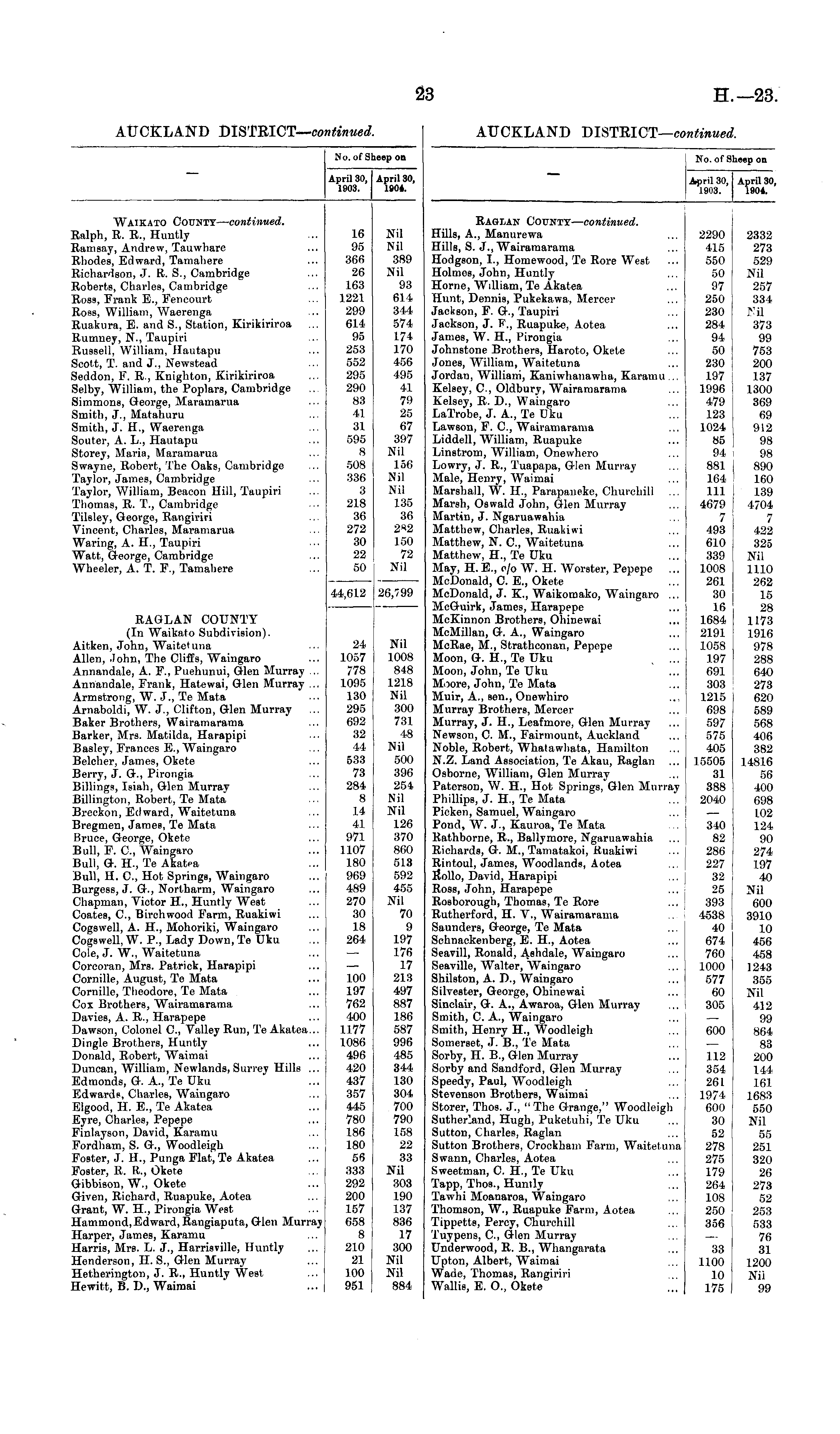 No. of Sheep on April 30, 1803. April 30, 1804. Ragian County— continued. Hills, A., Manurewa Hills, S. J., Wairamarama Hodgson, I., Homewood, Te Rore West Holmes, John, Huntly Home, William, Te Akatea Hunt, Dennis, Pukekawa, Mercer Jackson, F. G., Taupiri Jackson, J. F., Ruapuke, Aotea James, W. H., Pirongia Johnstone Brothers, Haroto, Okete Jones, William, Waitetuna Jordan, William, Kaniwhanawha, Karamu ... Kelsey, C, Oldbury, Wairamarama Kelsey, R. D., Waingaro LaTrobe, J. A., Te Uku Lawson, F. C, Wairamarama Liddell, William, Ruapuke Linstrom, William, Onewhero Lowry, J. R., Tuapapa, Glen Murray Male, Henry, Waimai Marshall, W. H., Parapaneke, Churchill ... Marsh, Oswald John, Glen Murray Martin, J. Ngaruawahia Matthew, Charles, Ruakiwi Matthew, N. O, Waitetuna Matthew, H., Te Uku May, H.E., o/o W. H. Worster, Pepepe ... McDonald, C. E., Okete McDonald, J. K., Waikomako, Waingaro ... MeGuirk, James, Harapepe McKinnon Brothers, Ohinewai McMillan, G. A., Waingaro McRae, M., Strathconan, Pepepe Moon, G. H., Te Uku Moon, John, Te Uku Moore, John, Te Mata Muir, A., sen., Onewhiro Murray Brothers, Mercer Murray, J. H., Leafmore, Glen Murray Newson, C. M., Fairmount, Auckland Noble, Robert, Whatawhata, Hamilton N.Z. Land Association, Te Akau, Raglan ... Osborne, William, Glen Murray Paterson, W. H., Hot Springs, Glen Murray Phillips, J. H., Te Mata Picken, Samuel, Waingaro Pond, W. J., Kauroa, Te Mata Rathborne, R., Ballymore, Ngaruawahia Richards, G. M., Tamatakoi, Ruakiwi Rintoul, James, Woodlands, Aotea Rollo, David, Harapipi Ross, John, Harapepe Rosborough, Thomas, Te Rore Rutherford, H. V., Wairamarama Saunders, George, Te Mata Schnackenberg, E. H., Aotea Seavill, Ronald, Ashdale, Waingaro Seaville, Walter, Waingaro Shilston, A. D., Waingaro Silvester, George, Ohinewai Sinclair, G. A., Awaroa, Glen Murray Smith, C. A., Waingaro Smith, Henry H., Woodleigh Somerset, J. B., Te Mata Sorby, H. B., Glen Murray Sorby and Sandford, Glen Murray Speedy, Paul, Woodleigh Stevenson Brothers, Waimai Storer, Thos. J., " The Grange," Woodleigh Sutherland, Hugh, Puketuhi, Te Uku Sutton, Charles, Raglan Sutton Brothers, Crockham Farm, Waitetuna Swann, Charles, Aotea Sweetman, C. H., Te Uku Tapp, Thos., Huntly Tawhi Moanaroa, Waingaro Thomson, W., Ruapuke Farm, Aotea Tippetts, Percy, Churchill Tuypens, C, Glen Murray Underwood, R. B., Whangarata Upton, Albert, Waimai Wade, Thomas, Rangiriri Wallis, E. O., Okete 2290 415 550 50 97 250 230 284 94 50 230 197 1996 479 123 1024 85 94 881 164 111 4679 7 493 610 339 1008 261 30 16 1684 2191 1058 197 691 303 1215 698 597 575 405 15505 31 388 2040 2332 273 529 Nil 257 334 Nil 373 99 753 200 137 1300 369 69 912 98 98 890 160 139 4704 7 422 325 Nil 1110 262 15 28 1173 1916 978 288 640 273 620 589 568 406 382 14816 56 400 698 102 124 90 274 197 40 Nil 600 3910 10 456 458 1243 355 Nil 412 99 864 83 200 144 161 1683 550 Nil 55 251 320 26 273 52 253 533 76 31 1200 Nii 99 340 82 286 227 32 25 393 4538 40 674 760 1000 577 60 305 600 112 354 261 1974 600 30 52 278 275 179 264 108 250 356 33 1100 10 175