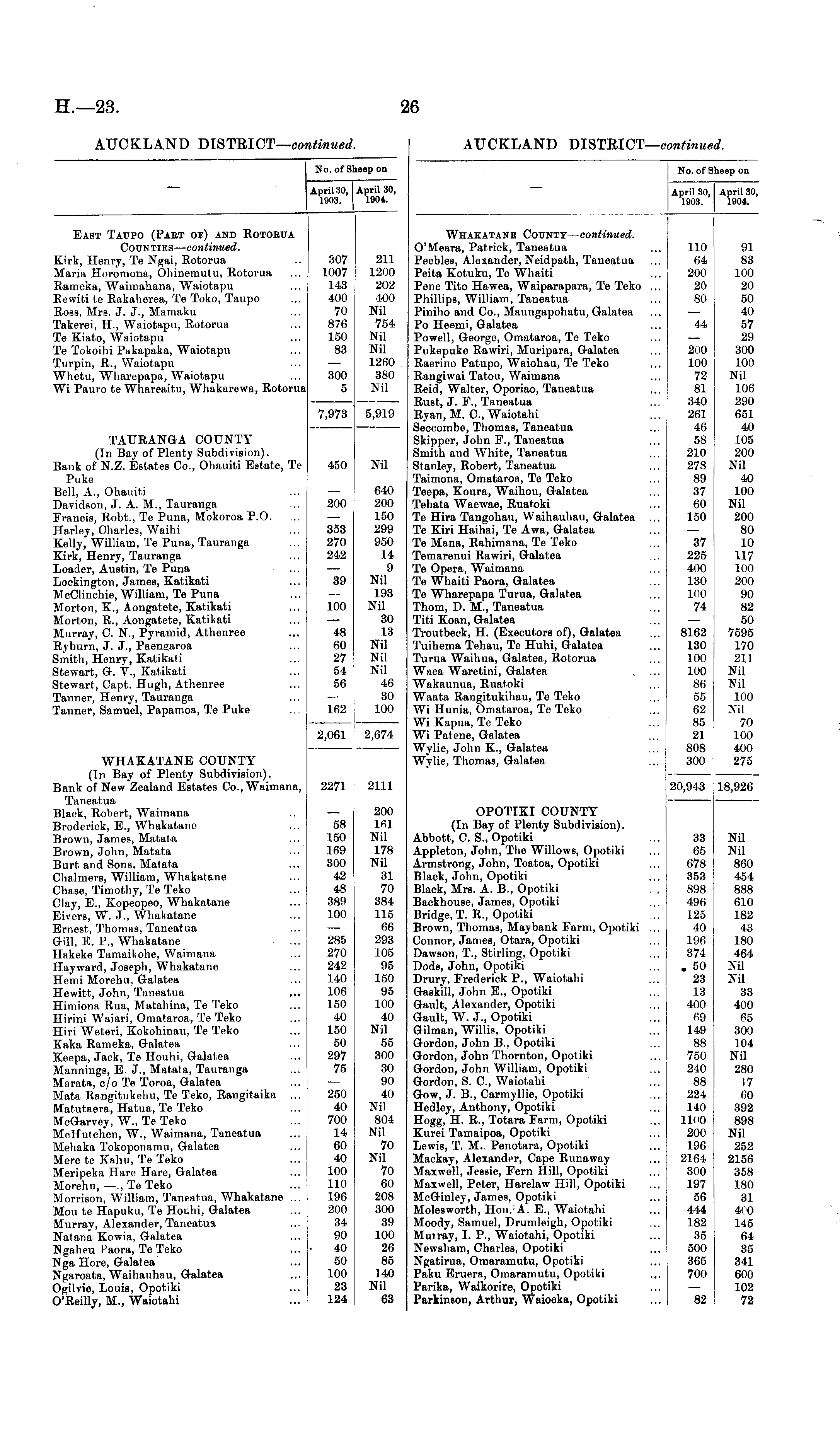 No. of Sheep on April 30, April 30, 1903. 1904. Whakatane County— continued. O'Meara, Patrick, Taneatua Peebles, Alexander, Neidpath, Taneatua Peita Kotuku, Te Whaiti Pene Tito Hawea, Waiparapara, Te Teko ... Phillips, William, Taneatua Piniho and Co., Maungapohatu, Galatea Po Heemi, Galatea Powell, George, Omataroa, Te Teko Pukepuke Rawiri, Muripara, Galatea Raerino Patupo, Waiohau, Te Teko Rangiwai Tatou, Waimana Reid, Walter, Oporiao, Taneatua Rust, J. F., Taneatua Ryan, M. C, Waiotahi Seccombe, Thomas, Taneatua Skipper, John F., Taneatua Smith and White, Taneatua Stanley, Robert, Taneatua Taimona, Omataroa, Te Teko Teepa, Koura, Waihou, Galatea Tehata Waewae, Ruatoki Te Hira Tangohau, Waihauhau, Galatea Te Kiri Haihai, Te Awa, Galatea Te Mana, Rahimana, Te Teko Temarenui Rawiri, Galatea Te Opera, Waimana Te Whaiti Paora, Galatea Te Wharepapa Turua, Galatea Thorn, D. M., Taneatua Titi Koan, Galatea Troutbeck, H. (Executors of), Galatea Tuihema Tehau, Te Huhi, Galatea Turua Waihua, Galatea, Rotorua Waea Waretini, Galatea Wakaunua, Ruatoki Waata Rangitukihau, Te Teko Wi Hunia, Omataroa, Te Teko Wi Kapua, Te Teko Wi Patene, Galatea Wylie, John K., Galatea Wylie, Thomas, Galatea 110 64 200 20 80 44 200 100 72 81 340 261 46 58 210 278 89 37 60 150 91 83 100 20 50 40 57 29 300 100 Nil 106 290 651 40 105 200 Nil 40 100 Nil 200 80 10 117 100 200 90 82 50 7595 170 211 Nil Nil 100 Nil 70 100 400 275 37 225 400 130 100 74 8162 130 100 100 86 55 62 85 21 808 300 20,943 18,926 OPOTIKI COUNTY (In Bay of Plenty Subdivision). Abbott, C. S., Opotiki Appleton, John, The Willows, Opotiki Armstrong, John, Toatoa, Opotiki Black, John, Opotiki Black, Mrs. A. B., Opotiki Backhouse, James, Opotiki Bridge, T. R., Opotiki Brown, Thomas, Maybank Farm, Opotiki ... Connor, James, Otara, Opotiki Dawson, T., Stirling, Opotiki Dods, John, Opotiki Drury, Frederick P., Waiotahi Gaskill, John E., Opotiki Gault, Alexander, Opotiki Gault, W. J., Opotiki Gilman, Willis, Opotiki Gordon, John B., Opotiki Gordon, John Thornton, Opotiki Gordon, John William, Opotiki Gordon, S. C, Waiotahi Gow, J. B., Carmyllie, Opotiki Hedley, Anthony, Opotiki Hogg, H. R., Totara Farm, Opotiki Kurei Tamaipoa, Opotiki Lewis, T. M.. Penotara, Opotiki Mackay, Alexander, Cape Runaway Maxwell, Jessie, Fern Hill, Opotiki Maxwell, Peter, Harelaw Hill, Opotiki McGinley, James, Opotiki Molesworth, Hon.'A. E., Waiotahi Moody, Samuel, Drumleigh, Opotiki Muiray, I. P., Waiotahi, Opotiki Newsham, Charles, Opotiki Ngatirua, Omaramutu, Opotiki Paku Eruera, Omaramutu, Opotiki Parika, Waikorire, Opotiki Parkinson, Arthur, Waioeka, Opotiki 33 65 678 353 898 496 125 40 196 374 . 50 23 13 400 69 149 88 750 240 88 224 140 1100 200 196 2164 300 197 56 444 182 35 500 365 700 Nil Nil 860 454 888 610 182 43 180 464 Nil Nil 33 400 65 300 104 Nil 280 17 60 392 898 Nil 252 2156 358 180 31 400 145 64 35 341 600 102 72 82