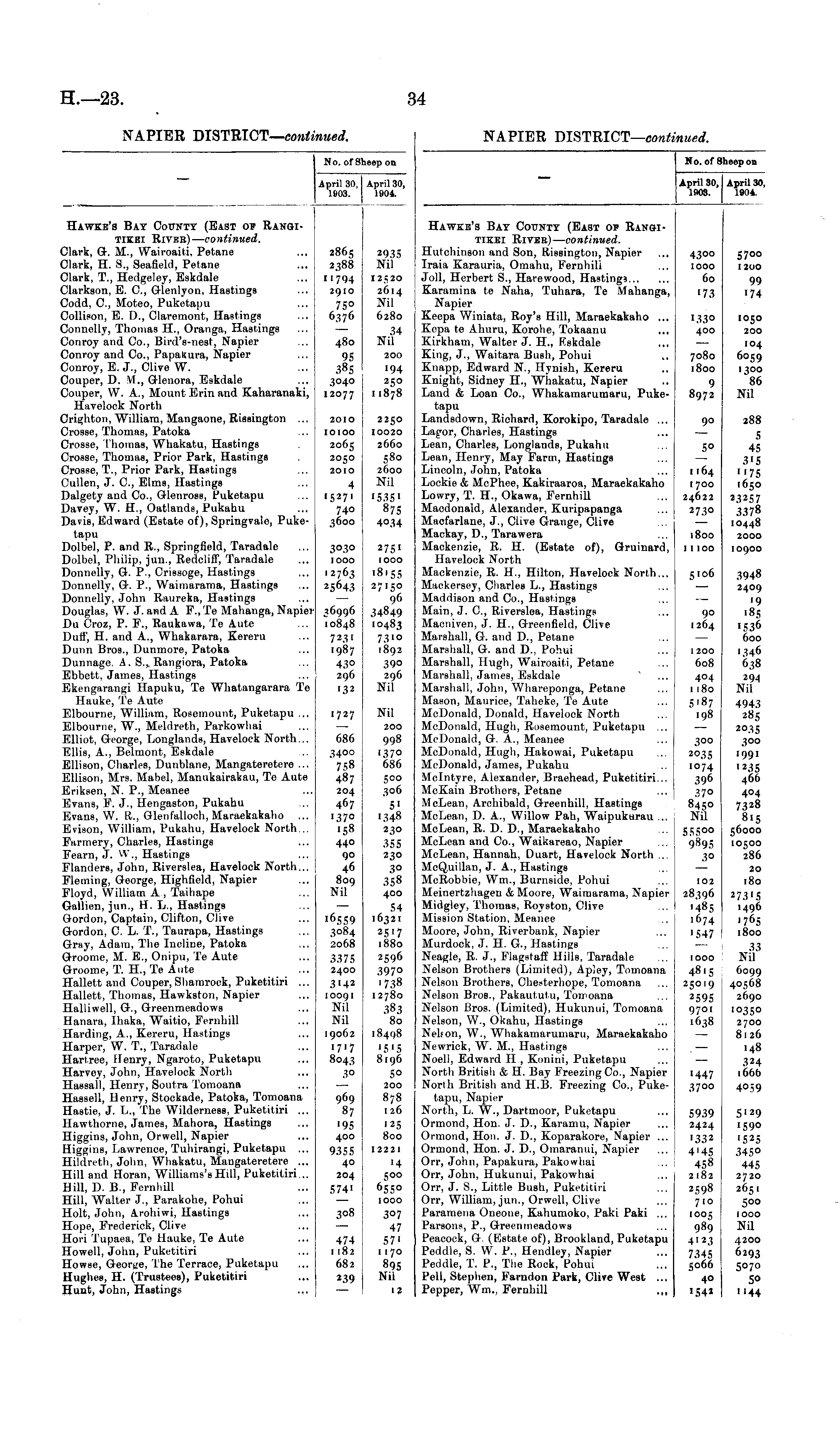 No. of Sheep on April 30, 1903. April 30, 1804. Hawke's Bay County (East of Rangitikei River) — continued. Hutchinson and Son, Rissington, Napier Iraia Karauria, Omahu, Fernhill Joll, Herbert S., Harewood, Hastings Karamina te Naha, Tuhara, Te Mahanga, Napier Keepa Winiata, Roy's Hill, Maraekakaho ... Kepa te Ahuru, Korohe, Tokaanu Kirkham, Walter J. H., Eskdale King, J., Waitara Bush, Pohui Knapp, Edward N., Hynish, Kereru Knight, Sidney H., Whakatu, Napier Land & Loan Co., Whakamarumaru, Puketapu Landsdown, Richard, Korokipo, Taradale ... Lagor, Charles, Hastings Lean, Charles, Longlands, Pukahu Lean, Henry, May Farm, Hastings Lincoln, John, Patoka Lockie & McPhee, Kakiraaroa, Maraekakaho Lowry, T. H., Okawa, Fernhill Macdonald, Alexander, Kuripapanga Maefarlane, J., Clive Grange, Clive Mackay, D., Tarawera Mackenzie, R. H. (Estate of), Gruinard, Havelock North Mackenzie, R. H., Hilton, Havelock North.., Mackersey, Charles L., Hastings Maddison and Co., Hastings Main, J. C, Riverslea, Hastings Macniven, J. H., Greenfield, Clive Marshall, G. and D., Petane Marshall, G. and D., Pohui Marshall, Hugh, Wairoaiti, Petane Marshall, James, Eskdale Marshall, John, Whareponga, Petane Mason, Maurice, Taheke, Te Aute McDonald, Donald, Havelock North McDonald, Hugh, Rosemount, Puketapu ... McDonald, G. A, Meanee McDonald, Hugh, Hakowai, Puketapu McDonald, James, Pukahu Mclntyre, Alexander, Braehead, Puketitiri... McKain Brothers, Petane McLean, Archibald, Greenhill, Hastings McLean, D. A., Willow Pah, Waipukurau ... McLean, R. D. D., Maraekakaho McLean and Co., Waikareao, Napier McLean, Hannah, Duart, Havelock North ... McQuillan, J. A., Hastings McRobbie, Wm., Burnside, Pohui Meinertzhagen & Moore, Waimarama, Napier Midgley, Thomas, Royston, Clive Mission Station, Meanee Moore, John, Riverbank, Napier Murdock, J. H. G., Hastings Neagle, R. J., Flagstaff Hills, Taradale Nelson Brothers (Limited), Apley, Tomoana Nelson Brothers, Chesterhope, Tomoana Nelson Bros., Pakaut.utu, Tomoana Nelson Bros. (Limited), Hukunui, Tomoana Nelson, W., Okahu, Hastings Nehon, W., Whakamarumaru, Maraekakaho Newrick, W. M., Hastings Noell, Edward H , Konini, Puketapu North British & H. Bay Freezing Co., Napier North British and H.B. Freezing Co., Puketapu, Napier North, L. W., Dartmoor, Puketapu Ormond, Hon. J. D., Karamu, Napier Ormond, Hon. J. I)., Koparakore, Napier ... Ormond, Hon. J. D., Omaranui, Napier Orr, John, Papakura, Pakowhai Orr, John, Hukunui, Pakowhai Orr, J. 8., Little Bush, Puketitiri Orr, William, jun., Orwell, Clive Paramena Oneone, Kahumoko, Paki Paki ... Parsons, P., Greenmeadows Peacock, G (Estate of), Brookland, Puketapu Peddle, S. W. P., Hendley, Napier Peddle, T. P., The Rock, Pohui Pell, Stephen, Farndon Park, Clive West ... Pepper, Win, Fernhill .,, 43°° IOOO 60 '73 '33° 400 7080 1800 9 8972 90 5° 1164 1700 24622 273° 1800 11100 5106 90 1264 1200 608 404 1180 5'87 198 300 2°35 1074 396 37° 845° Nil 57°° 1200 99 '74 1050 200 104 6059 1300 86 Nil 288 5 45 3'5 "75 1650 23257 3378 10448 2000 10900 3948 2409 '9 '85 'S3 6 600 '346 638 294 Nil 4943 285 2°35 300 1991 1235 466 404 7328 8'5 56000 10500 286 20 180 555°° 9895 3° 102 282,96 '485 1674 '547 273'5 1496 '765 1800 IOOO 4815 25019 2595 97°' 1638 33 Nil 6099 40568 2690 '°35° 2700 8126 .48 324 166b '447 37°° 4059 5939 2424 '332 4'45 458 2182 2598 710 1005 989 4123 7345 5066 5'29 '59° '525 345° 445 2720 2651 5°° IOOO Nil 4200 6293 5070 5° "44 40 '54»