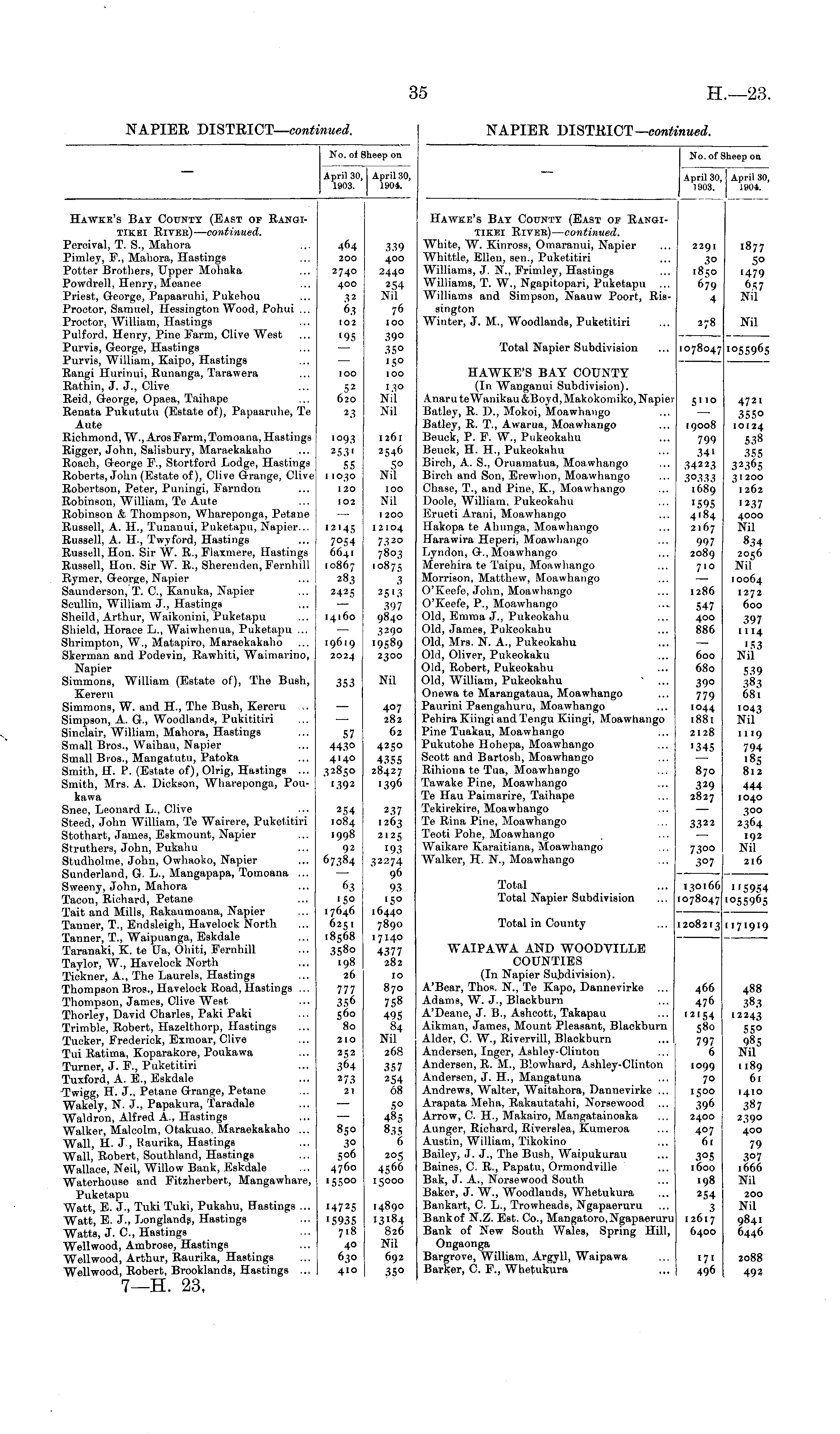 No. of Sheep on April 30, April 30, 1903. 1904. Hawke's Bay County (East op Rangitikei River) — continued. White, W. Kinross, Omaranui, Napier Whittle, Ellen, sen., Puketitiri Williams, J. N., Frimley, Hastings Williams, T. W., Ngapitopari, Puketapu ... Williams and Simpson, Naauw Poort, Rissington Winter, J. M., Woodlands, Puketitiri 2291 3° 1850 679 4 2291 1877 3° 5° 1850 1479 679 657 4 Nil 278 278 Nil Total Napier Subdivision 1078047 10780471055965 HAWKE'S BAY COUNTY (In Wanganui Subdivision). Anaru teWanikau &Boyd, Makokomiko, Napier Batley, R. D., Mokoi, Moawhango Batley, R. T., Awarua, Moawhango Beuck, P. F. W., Pukeokahu Beuck, H. H., Pukeokahu Birch, A. S., Oruamatua, Moawhango Birch and Son, Erewhon, Moawhango Chase, T., and Pine, K., Moawhango Doole, William, Pukeokahu Erueti Arani, Moawhango Hakopa te Ahunga, Moawhango Harawira Heperi, Moawhango Lyndon, G., Moawhango Merehira te Taipu, Moawhango Morrison, Matthew, Moawhango O'Keefe, John, Moawhango O'Keefe, P., Moawhango Old, Emma J., Pukeokahu Old, James, Pukeokahu Old, Mrs. N. A., Pukeokahu Old, Oliver, Pukeokaku Old, Robert, Pukeokahu Old, William, Pukeokahu Onewa te Marangataua, Moawhango Paurini Paengahuru, Moawhango Pehira Kiingi and Tengu Kiingi, Moawhango Pine Tuakau, Moawhango Pukutohe Hohepa, Moawhango Scott and Bartosh, Moawhango Rihiona te Tua, Moawhango Tawake Pine, Moawhango Te Hau Paimarire, Taihape Tekirekire, Moawhango Te Rina Pine, Moawhango Teoti Pohe, Moawhango Waikare Karaitiana, Moawhango Walker, H. N., Moawhango 51 10 19008 799 34' 34223 3°333 1689 '595 4184 2167 997 2089 710 1286 547 400 886 5110 4721 — 355° 19008 10124 799 5.38 34' 355 342 2.3 32365 30333 3 1200 1689 1262 '595 '2.37 4184 4000 2167 Nil 997 834 2089 2056 71 o Nil — 10064 1286 1272 547 600 400 397 886 1114 — '53 600 Nil 600 680 39° 779 1044 1881 2128 '345 680 539 39° 383 779 681 1044 1043 1881 Nil 870 329 2827 2128 1119 '345 794 '85 870 812 329 444 2827 1040 — 300 3322 2364 — 192 7300 Nil 307 216 3322 Total Total Napier Subdivision 73°° 3°7 130 166 1078047 130 166 115954 078047 1055965 Total in County 1208213 208213 1171919 WAIPAWA AND WOODVILLE COUNTIES (In Napier Subdivision). A'Bear, Thos. N., Te Kapo, Dannevirke Adams, W. J., Blackburn A'Deane, J. B., Ashcott, Takapau Aikman, James, Mount Pleasant, Blackburn Alder, C. W., Rivervill, Blackburn Andersen, Inger, Ashley-Clinton Andersen, R. M., Blowhard, Ashley-Clinton Andersen, J. H., Mangatuna Andrews, Walter, Waitahora, Dannevirke ... Arapata Meha, Rakautatahi, Norsewood Arrow, C. H., Makairo, Mangatainoaka Aunger, Richard, Riverslea, Kumeroa Austin, William, Tikokino Bailey, J. J., The Bush, Waipukurau Baines, C. R., Papatu, Ormondville Bak, J. A., Norsewood South Baker, J. W., Woodlands, Whetukura Bankart, C. L., Trowheads, Ngapaeruru Bank of N.Z. Est. Co., Mangatoro, Ngapaeruru Bank of New South Wales, Spring Hill, Ongaonga Bargrove, William, Argyll, Waipawa Barker, C. F., Whetukura 466 476 12154 580 , 797 6 1099 70 1500 396 2400 407 61 466 488 476 383 12154 12243 580 550 797 985 6 Nil 1099 1189 70 61 1500 1410 396 387 2400 2390 407 400 61 79 3°5 3°7 1600 1666 198 Nil 3°5 1600 198 254 3 12617 6400 254 200 3 Nil 12617 9841 6400 6446 171 496 17 1 2088 496 492