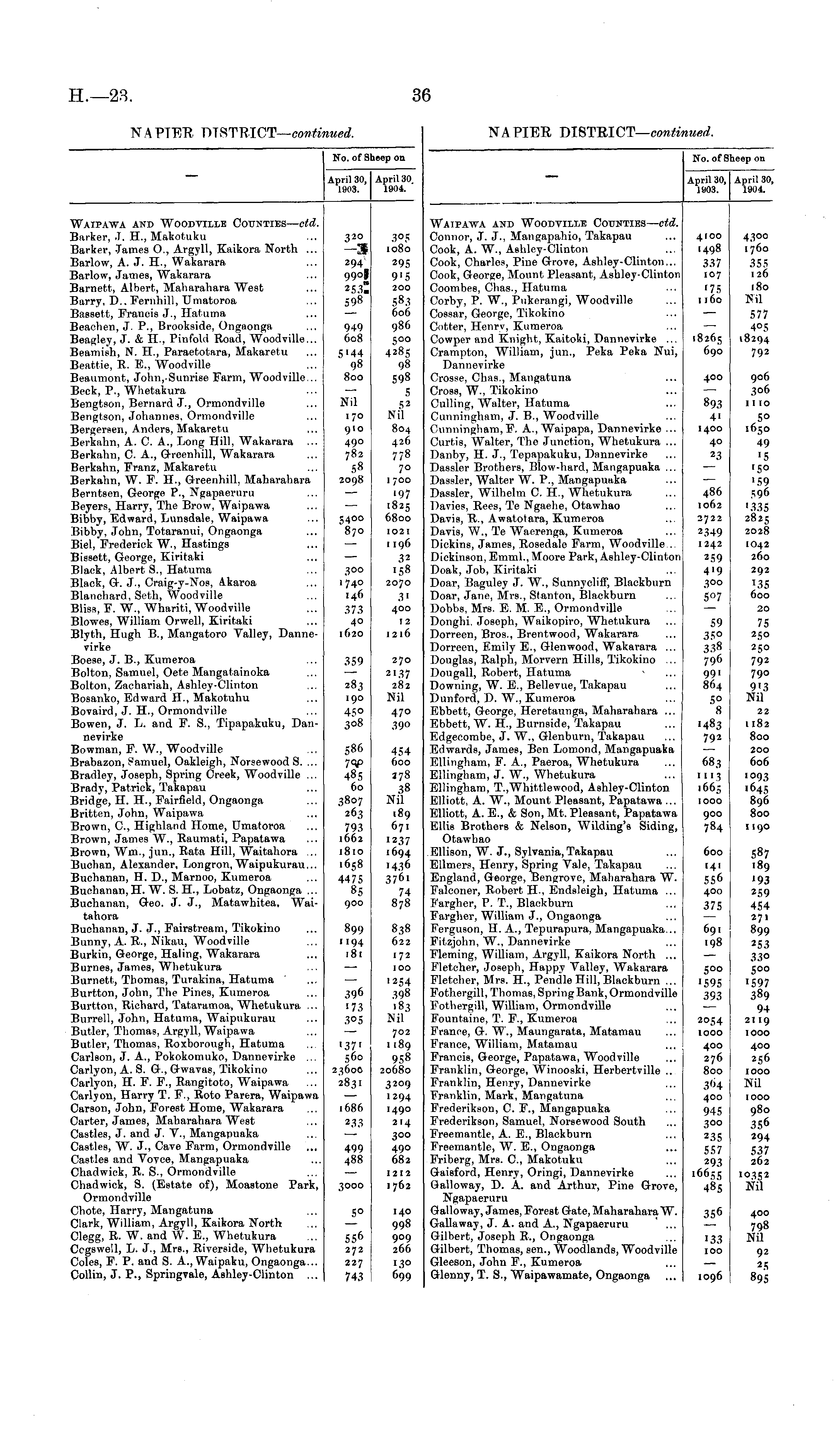No. of Sheep on April 30, 1903. April 30 1904. Waipawa and Woodviile Counties — ctd. Barker, J. H., Makotuku Barker, James O., Argyll, Kaikora North ... Barlow, A. J. H., Wakarara Barlow, James, Wakarara Barnett, Albert, Maharahara West Barry, D.. Fernhill, Umatoroa Bassett, Francis J., Hatuma Beachen, J. P., Brookside, Ongaonga Beagley, J. & H., Pinfold Road, Woodville... Beamish, N. II., Paraetotara, Makaretu Beattie, R. E., Woodville Beaumont, John,.Sunrise Farm, Woodville... Beck, P., Whetakura Bengtson, Bernard J., Ormondville Bengtson, Johannes, Ormondville Bergersen, Anders, Makaretu Berkahn, A. C. A., Long Hill, Wakarara Berkahn, C. A., Greenhill, Wakarara Berkahn, Franz, Makaretu Berkahn, W. F. H., Greenhill, Maharahara Berntsen, George P., Ngapaeruru Beyers, Harry, The Brow, Waipawa Bibby, Edward, Lunsdale, Waipawa Bibby, John, Totaranui, Ongaonga Biel, Frederick W., Hastings Bissett, George, Kiritaki Black, Albert S., Hatuma Black, G. J., Craig-y-Nos, Akaroa Blanchard. Seth, Woodville Bliss, F. W., Whariti, Woodville Blowes, William Orwell, Kiritaki Blyth, Hugh B., Mangatoro Valley, Dannevirke Boese, J. B., Kumeroa Bolton, Samuel, Oete Mangatainoka Bolton, Zachariah, Ashley-Clinton Bosanko, Edward H., Makotuhu Bovaird, J. H., Ormondville Bowen, J. L. and F. S., Tipapakuku, Dannevirke Bowman, F. W., Woodville Brabazon, Pamuel, Oakleigh, Norsewood S. ... Bradley, Joseph, Spring Creek, Woodville ... Brady, Patrick, Takapau Bridge, H. H., Fairfield, Ongaonga Britten, John, Waipawa Brown, C, Highland Home, Umatoroa Brown, James W., Raumati, Papatawa Brown, Wm., jun., Rata Hill, Waitahora ... Buchan, Alexander, Longron, Waipukurau... Buchanan, H. D., Marnoo, Kumeroa Buchanan,H. W. S. H., Lobatz, Ongaonga ... Buchanan, Geo. J. J., Matawhitea. Waitahora Buchanan, J. J., Fairstream, Tikokino Bunny, A. R., Nikau, Woodville Burkin, George, Haling, Wakarara Burnes, James, Whetukura Burnett, Thomas, Turakina, Hatuma Burtton, John, The Pines, Kumeroa Burtton, Richard, Tataramoa, Whetukura ... Burrell, John, Hatuma, Waipukurau Butler, Thomas, Argyll, Waipawa Butler, Thomas, Roxborough, Hatuma Carlson, J. A., Pokokomuko, Dannevirke ... Carlyon, A. S. G., Gwavas, Tikokino Carlyon, H. F. F., Rangitoto, Waipawa Carlyon, Harry T. F., Roto Parera, Waipawa Carson, John, Forest Home, Wakarara Carter, James, Maharahara West Castles, J. and J. V., Mangapuaka Castles, W. J., Cave Farm, Ormondville Castles and Vovce, Mangapuaka Chadwick, R. S-, Ormondville Chadwick, S. (Estate of), Moastone Park, Ormondville Chote, Harry, Mangatuna Clark, William, Argyll, Kaikora North Clegg, R. W. and W. E., Whetukura Cogswell, L. J., Mrs., Riverside, Whetukura Coles, F. P. and S. A., Waipaku, Ongaonga... Collin, J. P., Springvale, Ashley-Clinton ... 320 -m 294 99°J 253: 598 949 608 5'44 98 800 Nil 170 910 49° 782 58 2098 54°° 870 300 1740 146 373 40 1620 359 283 190 45° 308 586 7 qp 485 60 38°7 263 793 1662 1810 1658 4475 85 900 3°S 1080 295 9'5 200 58.3 606 986 500 4285 98 598 5 52 Nil 804 426 778 70 1700 '97 1825 6800 1021 1196 32 '58 2070 3' 400 12 1216 270 21.37 282 Nil 47° 39° 454 600 278 38 Nil 189 671 1237 1694 14.36 376i 74 878 899 "94 181 838 622 172 100 396 '73 3°5 '254 398 '8.3 Nil 702 1189 958 20680 '37' 560 2360O 2831 1686 2.33 3209 1294 '49° 214 300 49° 682 499 488 3000 1212 1762 5° 556 272 227 743 140 998 909 266 '3° 699