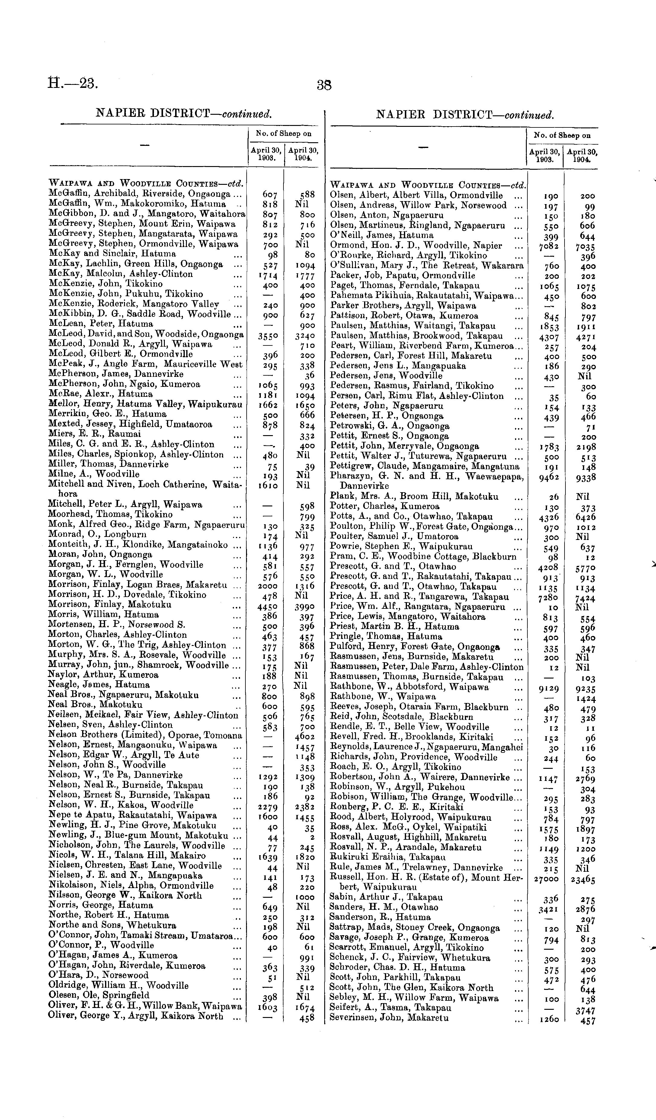 No. of Sheep on April 30, April 30, 1903. 1904. Waipawa and Woodville Counties — ctd. Olsen, Albert, Albert Villa, Ormondville Olsen, Andreas, Willow Park, Norsewood ... Olsen, Anton, Ngapaeruru Olsen, Martineus, Ringland, Ngapaeruru ... O'Neill, James, Hatuma Ormond, Hon. J. D., Woodville, Napier O'Rourke, Richard, Argyll, Tikokino O'Sullivan, Mary J., The Retreat, Wakarara Packer, Job, Papatu, Ormondville Paget, Thomas, Ferndale, Takapau Pahemata Pikihuia, Rakautatahi, Waipawa... Parker Brothers, Argyll, Waipawa Pattison, Robert, Otawa, Kumeroa Paulsen, Matthias, Waitangi, Takapau Paulsen, Matthias, Brookwood, Takapau Peart, William, Riverbend Farm, Kumeroa... Pedersen, Carl, Forest Hill, Makaretu Pedersen, Jens L., Mangapuaka Pedersen, Jens, Woodville Pedersen, Rasmus, Fairland, Tikokino Persen, Carl, Rimu Flat, Ashley-Clinton ... Peters, John, Ngapaeruru Petersen, H. P., Ongaonga Petrowski, G. A., Ongaonga Pettit, Ernest S., Ongaonga Pettit, John, Merry vale, Ongaonga Pettit, Walter J., Tuturewa, Ngapaeruru ... Pettigrew, Claude, Mangamaire, Mangatuna Pharazyn, G. N. and H. H., Waewaepapa, Dannevirke Plank, Mrs. A., Broom Hill, Makotuku Potter, Charles, Kumeroa Potts, A., and Co., Otawhao, Takapau Poulton, Philip W.,Forest Gate, Ongaonga... Poulter, Samuel J., Umatoroa Powrie, Stephen E., Waipukurau Pram, C. E., Woodbine Cottage, Blackburn Prescott, G. and T., Otawhao Prescott, G. and T., Rakautatahi, Takapau ... Prescott, G. and T., Otawhao, Takapau Price, A. H. and R., Tangarewa, Takapau Price, Wm. Alf., Rangatara, Ngapaeruru ... Price, Lewis, Mangatoro, Waitahora Priest, Martin B. H., Hatuma Pringle, Thomas, Hatuma Pulford, Henry, Forest Gate, Ongaonga Rasmussen, Jens, Burnside, Makaretu Rasmussen, Peter, Dale Farm, Ashley-Clinton Rasmussen, Thomas, Burnside, Takapau Rathbone, W., Abbotsford, Waipawa Rathbone, W., Waipawa Reeves, Joseph, Otaraia Farm, Blackburn .. Reid, John, Scotsdale, Blackburn Rendle, E. T., Belle View, Woodville Revell, Fred. H., Brooklands, Kiritaki Reynolds, Laurence J., Ngapaeruru, Mangahei Richards, John, Providence, Woodville Roach, E. O., Argyll, Tikokino Robertson, John A., Wairere, Dannevirke ... Robinson, W., Argyll, Pukehou Robison, William, The Grange, Woodville... Ronberg, P. C. E. E., Kiritaki Rood, Albert, Holyrood, Waipukurau Ross, Alex. McG., Oykel, Waipatiki Rosvall, August, Highhill, Makaretu Rosvall, N. P., Arandale, Makaretu Rukiruki Eraihia, Takapau Rule, James M., Trelawncy, Dannevirke Russell, Hon. H. R. (Estate of), Mount Herbert, Waipukurau Sabin, Arthur J., Takapau Sanders, H. M., Otawhao Sanderson, R., Hatuma Sattrap, Mads, Stoney Creek, Ongaonga Savage, Joseph P., Grange, Kumeroa Scarrott, Emanuel, Argyll, Tikokino Schenck, J. C, Fairview, Whetukura Schroder, Chas. D. H., Hatuma Scott, John, Parkhill, Takapau Scott, John, The Glen, Kaikora North Sebley, M. H., Willow I'arm, Waipawa Seifert, A., TaBma, Takapau Severinsen, John, Makaretu '9° 197 '5° 55° 399 7082 760 200 1065 45° 845 1853 43°7 257 400 186 43° 35 '54 439 "78.3 500 191 9462 26 '3° 4326 97° 300 549 98 4208 91.3 "35 7280 10 8'3 597 400 335 200 200 99 i So 606 644 7°35 396 400 202 '°75 600 802 797 1911 4271 204 500 290 Nil 300 60 '33 466 7' 200 2198 5'3 148 9338 Nil 373 6426 1012 Nil 637 12 577° 9'3 "34 7424 Nil 554 596 460 347 Nil Nil 103 92.35 1424 479 328 9° 116 60 '53 2769 3°4 283 93 797 1897 '73 1200 346 Nil 23465 12 9129 480 3'7 12 152 3° 244 "47 295 '53 784 '575 180 "49 335 2'5 27000 336 3421 120 794 3°° 575 472 275 2876 297 Nil 8'3 200 293 400 476 644 138 3747 457 100 1260