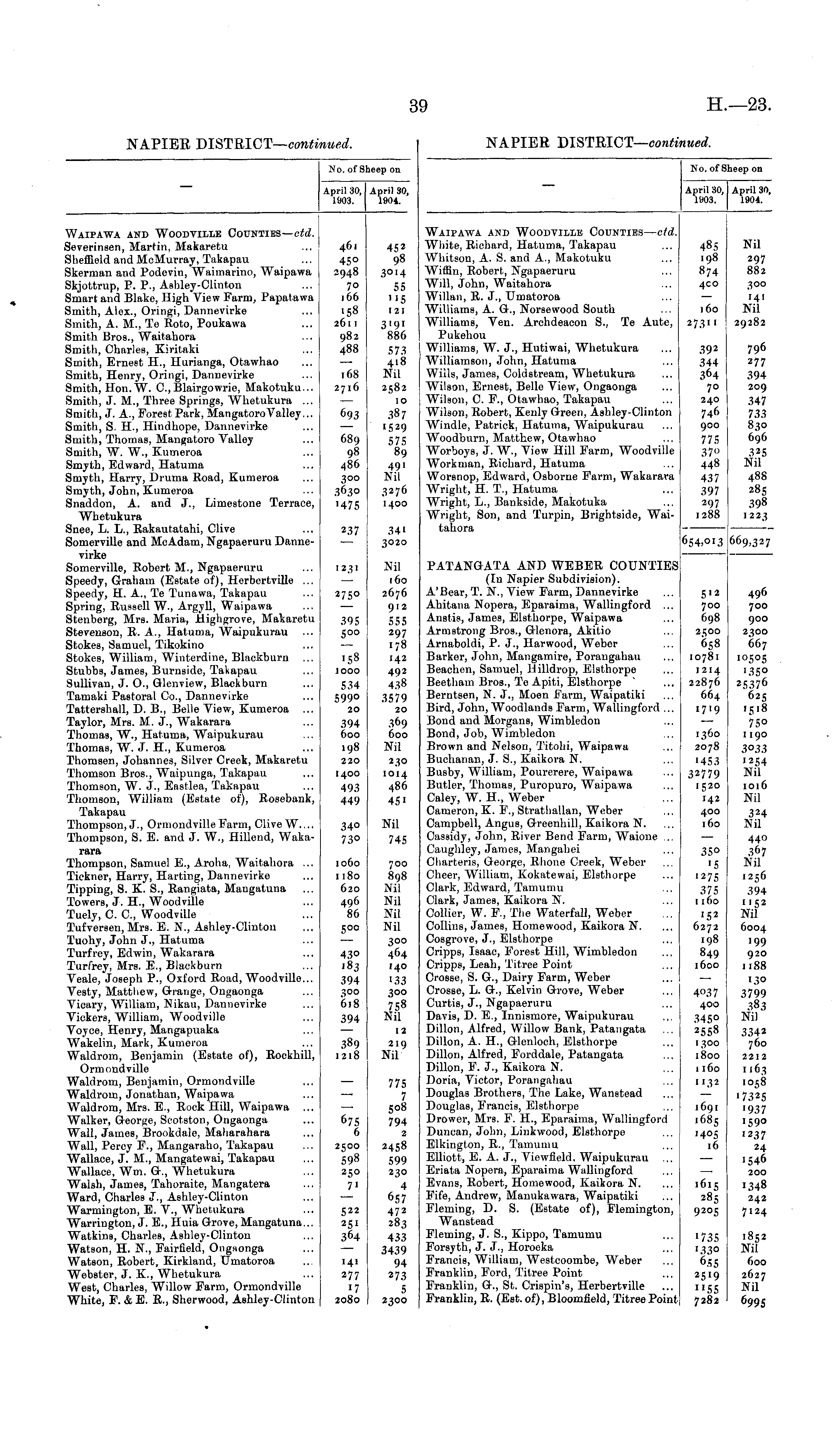 No. of Sheep on April 30, 1903. April 30, 1904. Waipawa and Woodville Counties — ctd. White, Richard, Hatuma, Takapau Whitson, A. S. and A., Makotuku Willin, Robert, Ngapaeruru Will, John, Waitahora Willan, R. J., Umatoroa Williams, A. G., Norsewood South Williams, Ven. Archdeacon S., Te Aute, Pukehou Williams, W. J., Hutiwai, Whetukura Williamson, John, Hatuma Wills, James, Coldstream, Whetukura Wilson, Ernest, Belle View, Ongaonga Wilson, C. F., Otawhao, Takapau Wilson, Robert, Kenly Green, Ashley-Clinton Windle, Patrick, Hatuma, Waipukurau Woodburn, Matthew, Otawhao Worboys, J. W., View Hill Farm, Woodville Workman, Richard, Hatuma Worsnop, Edward, Osborne Farm, Wakarara Wright, H. T., Hatuma Wright, L., Bankside, Makotuka Wright, Son, and Turpin, Brightside, Waitahora 485 .98 874 4CO 160 2731 I 392 344 364 70 240 746 900 775 37° 448 437 397 297 1288 Nil 297 882 300 141 Nil 29282 796 277 394 209 347 733 830 696 325 Nil 48S 285 398 1223 654.°i.3 669,327 PATANGATA AND WEBER COUNTIES (In Napier Subdivision). A'Bear, T. N., View Farm, Dannevirke Ahitana Nopera, Eparaima, Wallingford ... Anstis, James, Elsthorpe, Waipawa Armstrong Bros., Glenora, Akitio Arnaboldi, P. J., Harwood, Weber Barker, John, Mangamire, Porangahau Beachen, Samuel, llilldrop, Elsthorpe Beetham Bros., Te Apiti, Elsthorpe Berntsen, N. J., Moen Farm, Waipatiki Bird, John, Woodlands Farm, Wallingford ... Bond and Morgans, Wimbledon Bond, Job, Wimbledon Brown and Nelson, Titohi, Waipawa Buchanan, J. S., Kaikora N. Busby, William, Pourerere, Waipawa Butler, Thomas, Puropuro, Waipawa Caley, W. H., Weber Cameron, K. F., Strathallan, Weber Campbell, Angus, Greenhill, Kaikora N. Cassidy, John, River Bend Farm, Waione ... Caughley, James, Mangahei Charteris, George, Rhone Creek, Weber Cheer, William, Kokatewai, Elsthorpe Clark, Edward, Tamumu Clark, James, Kaikora N. Collier, W. F., The Waterfall, Weber Collins, James, Homewood, Kaikora N. Cosgrove, J., Elsthorpe Cripps, Isaac, Forest Hill, Wimbledon Cripps, Leah, Titree Point Crosse, S. G., Dairy Farm, Weber Crosse, L. G., Kelvin Grove, Weber Curtis, J., Ngapaeruru Davis, D. E., Innismore, Waipukurau Dillon, Alfred, Willow Bank, Patangata Dillon, A. H., Glenloch, Elsthorpe Dillon, Alfred, Forddale, Patangata Dillon, F. J., Kaikora N. Doria, Victor, Porangahau Douglas Brothers, The Lake, Wanstead Douglas, Francis, Elsthorpe Drawer, Mrs. F. H., Eparaima, Wallingford Duncan, John, Linkwood, Elsthorpe Elkington, R., Tamumu Elliott, E. A. J., Viewfield. Waipukurau ... Eriata Nopera, Eparaima Wallingford Evans, Robert, Homewood, Kaikora N. Fife, Andrew, Manukawara, Waipatiki Fleming, D. S. (Estate of), Flemington, Wanstead Fleming, J. S., Kippo, Tamumu Forsyth, J. J., Horoeka Francis, William, Westcoombe, Weber Franklin, Ford, Titree Point Franklin, G., St. Crispin's, Herbertville Franklin, R. (Est. of), Bloomfield, Titree Point 5'2 700 698 2500 658 10781 1214 22876 664 1719 1360 2078 '453 32779 152° 142 400 160 35° '5 '275 375 1160 '52 6272 198 849 1600 496 700 900 2300 667 '°5°5 '35° 25376 625 1518 75° 1190 3°33 '254 Nil 1016 Nil 324 Nil 44° 367 Nil 1256 394 "52 Nil 6004 199 920 1188 4°37 400 345° 2558 1300 1800 1160 '3° 3799 383 Nil 1132 1691 1685 '4°S 16 3342 760 2212 1163 1058 '7325 '937 '59° 1237 24 '546 200 1348 242 7124 ,6.5 285 9205 '735 '33° 655 2519 "55 7282 1852 Nil 600 2627 Nil 6995