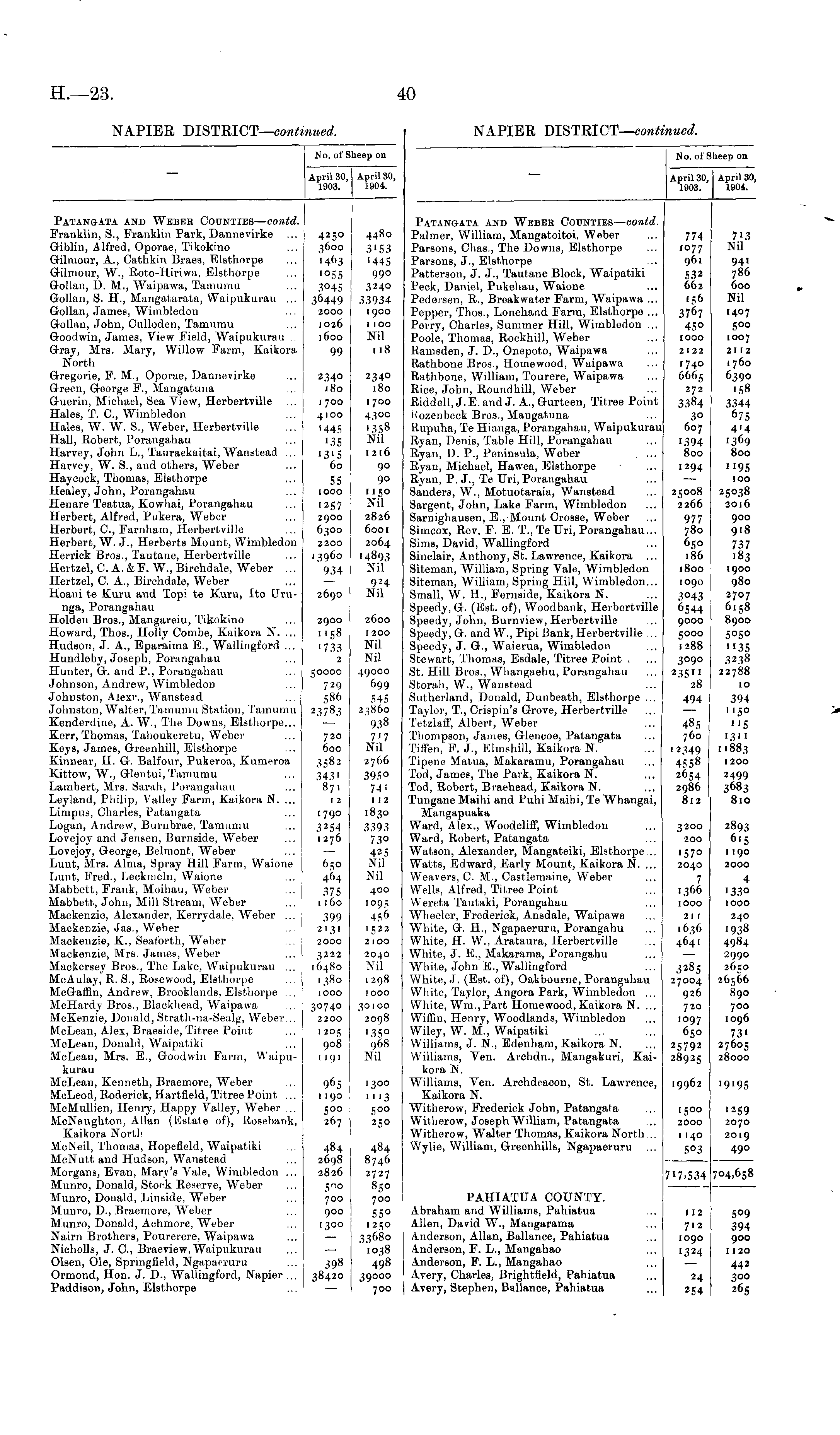 No. of Sheep on April 30, April 30, 1903. 1904. Patangata and Weber Counties — contd. Franklin, S., FVanklin Park, Dannevirke Giblin, Alfred, Oporae, Tikokino Gilmour, A., Cathkin Braes, Elsthorpe Gilmour, W., Roto-Hiriwa, F]lsthorpe Gollan, D. M., Waipawa, Tamumu Gollan, S. H., Mangatarata, Waipukurau ... Gollan, James, Wimbledon Gollan, John, Culloden, Tamumu Goodwin, James, View Waipukurau ,. Gray, Mrs. Mary, Willow Farm, Kaikora North Gregorie, F. M., Oporae, Dannevirke Green, George F., Mangatuna Guerin, Michael, Sea View, Herbertville Hales, T. C, Wimbledon Hales, W. W. S., Weber, Herbertville Hall, Robert, Porangahau Harvey, John L., Tauraekaitai, Wanstead ... Harvey, W. S., and others, Weber Haycock, Thomas, Elsthorpe Healey, John, Porangahau Henare Teatua, Kowhai, Porangahau Herbert, Alfred, Pukera, Weber Herbert, C, Farnhain, Herbertville Herbert, W. J., Herberts Mount, Wimbledon Herrick Bros., Tautane, Herbertville Hertzel, C. A. & F. W., Birchdale, Weber ... Hertzel, C. A., Birchdale, Weber Hoani te Kuru and Topi te Kuru, Ito Urunga, Porangahau Holden Bros., Mangareiu, Tikokino Howard, Thos., Holly Combe, Kaikora N. ... Hudson, J. A., Eparaima E., Wallingford ... Hundleby, Joseph, Porangahau Hunter, G. and P., Porangahau Johnson, Andrew, Wimbledon Johnston, Alexr., Wanstead Johnston, Walter, Tamumu Station, Tamumu Kenderdine, A. W., The Downs, Elsthorpe... Kerr, Thomas, Tahoukeretu, Weber Keys, James, Greenhill, Elsthorpe Kinuear, H. G. Balfour, Pukeroa, Kumeroa Kittow, W., Glentui, Tamumu Lambert, Mrs. Sarah, Porangahau Leyland, Philip, Valley Farm, Kaikora N. ... Limpus, Charles, Patangata Logan, Andrew, Burnbrae, Tamumu Lovejoy and Jensen, Burnside, Weber Lovejoy, George, Belmont, Weber Lunt, Mrs. Alma, Spray Hill Farm, Waione Lunt, Fred., Leckmeln, Waione Mabbett, Frank, Moihau, Weber Mabbett, John, Mill Stream, Weber Mackenzie, Alexander, Kerrydale, Weber ... Mackenzie, Jas., Weber Mackenzie, K., Seaforth, Weber Mackenzie, Mrs. James, Weber Mackersey Bros., The Lake, Waipukurau ... McAulay, R. S., Rosewood, Elsthorpe McGaffin, Andrew, Brooklands, Elsthorpe ... McHardy Bros., Blackhead, Waipawa McKenzie, Donald, Strath-na-Sealg, Weber... McLean, Alex, Braeside, Titree Point McLean, Donald, Waipatiki McLean, Mrs. E., Goodwin Farm, Waipukurau McLean, Kenneth, Braemore, Weber McLeod, Roderick, Hartfield, Titree Point ... McMullien, Henry, Happy Valley, Weber ... McNaughton, Allan (Estate of), Rosebank, Kaikora North McNeil, Thomas, Hopefield, Waipatiki McNutt and Hudson, Wanstead Morgans, Evan, Mary's Vale, Wimbledon ... Munro, Donald, Stock Reserve, Weber Munro, Donald, Linside, Weber Munro, D., Braemore, Weber Munro, Donald, Achmore, Weber Nairn Brothers, Pourerere, Waipawa Nicholls, J. C, Braeview, Waipukurau Olsen, Ole, Springfield, Ngapaeruru Ormond, Hon. J. D., Wallingford, Napier ... Paddison, John, Elsthorpe 4250 3600 1463 '°55 3°45 36449 2000 1026 1600 99 2340 180 1700 4100 '445 '35 '3'5 60 55 IOOO '257 2900 6300 2200 I3960 934 2690 2900 "58 '733 2 50000 729 586 23783 720 600 3582 343' 87, 1 2 '79° 3254 1276 4480 3153 '445 99° 324° 33934 1900 1 IOO Nil 118 2340 180 1700 43°° '358 Nil 1216 90 90 1150 Nil 2826 6001 2064 14893 Nil 924 Nil 2600 1200 Nil Nil 49000 699 545 23860 '938 717 Nil 2766 395° 74' 112 1830 3393 7.3° 425 Nil Nil 650 464 375 1160 399 2131 2000 3222 16480 1380 1000 400 '°95 456 1522 2100 2040 Nil 1 298 IOOO 3°74° 2200 1205 908 1 191 30 IOO 2098 '35° 968 Nil 965 1190 500 267 1300 1113 500 25° 484 2698 2826 500 700 900 1300 484 8746 2727 850 700 55° 1250 3368o 1038 498 39000 700 I 398 38420