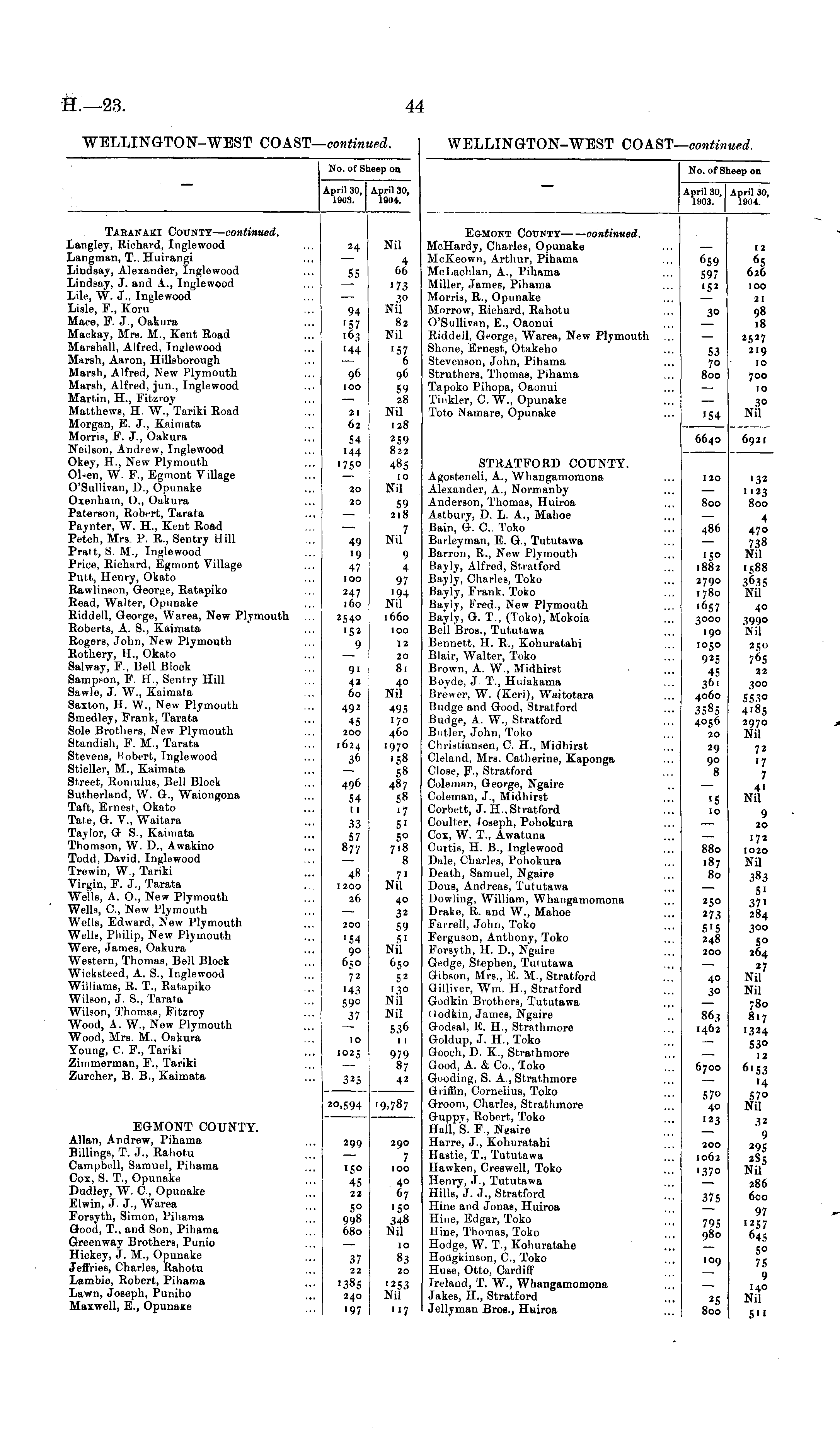 No. of Sheep on April 30, April 30, 1903. 1904. Egmont County continued. McHardy, Charles, Opunake McKeown, Arthur, Pihama McLachlan, A., Pihama Miller, James, Pihama Morris, R., Opunake Morrow, Richard, Rahotu O'Sullivan, E., Oaonui Riddell, George, Warea, New Plymouth Shone, Ernest, Otakeho Stevenson, John, Pihama Struthers, Thomas, Pihama Tapoko Pihopa, Oaonui Tinkler, C. W„ Opunake Toto Namare, Opunake 659 597 '52 3° 12 65 626 IOO 21 98 18 2527 219 10 700 53 7° 8oo IO 3° Nil '54 6640 6921 STRATFORD COUNTY. Agosteneli, A., Whangamomona Alexander, A., Normanby Anderson, Thomas, Huiroa Astbury, D. L. A., Mahoe Bain, G. C. Toko Barleyman, E. G., Tututawa Barron, R., New Plymouth Bayly, Alfred, Stratford Bayly, Charles, Toko Bayly, Frank. Toko Bayly, Fred., New Plymouth Bayly, G. T., (Toko), Mokoia Bell Bros., Tututawa Bennett, H. R., Kohuratahi Blair, Walter, Toko Brown, A. W., Midhirst Boyde, J. T., Huiakama Brewer, W. (Keri), Waitotara Budge and Good, Stratford Budge, A. W., Stratford Butler, John, Toko Christiansen, C. H., Midhirst Cleland, Mrs. Catherine, Kaponga Close, F-, Stratford Coleman, George, Ngaire Coleman, J., Midhirst Corbett, J. H., Stratford Coulter, loseph, Pohokura Cox, W. T., Awatuna Curtis, H. B., Inglewood Dale, Charles, Pohokura Death, Samuel, Ngaire Dous, Andreas, Tututawa Dowling, William, Whangamomona Drake, R. and W., Mahoe Farrell, John, Toko Ferguson, Anthony, Toko Forsyth, H. D., Ngaire Gedge, Stephen, Tuiutawa Gibson, Mrs., E. M., Stratford Gilliver, Wm. H., Stratford Godkin Brothers, Tututawa (lodkin, James, Ngaire Godsal, E. H., Strathmore Goldup, J. H., Toko Gooch, D. K., Strathmore Good, A. & Co., Toko Gooding, S. A., Strathmore Griffin, Cornelius, Toko Groom, Charles, Strathmore Guppv, Robert, Toko Hall, S. F , Ngaire Harre, J., Kohuratahi Hastie, T., Tututawa Hawken, Creswell, Toko Henry, J., Tututawa Hills, J. J., Stratford Hine and Jonas, Huiroa Hine, Edgar, Toko Hine, Thomas, Toko Hodge, W. T., Kohuratahe Hodgkinson, C, Toko Huse, Otto, Cardiff Ireland, T. W., Whangamomona Jakes, H., Stratford Jellyman Bros., Huiroa 120 800 486 '5° 1882 2790 1780 1657 3000 190 1050 925 45 361 4060 3585 4056 20 29 90 8 '5 10 880 187 80 132 1123 800 4 47° 738 Nil 1588 3°35 Nil 40 399° Nil 250 765 22 300 553° 4'85 2970 Nil 72 '7 7 4' Nil 9 20 172 1020 Nil 383 5' 37' 284 300 5° 264 27 Nil Nil 780 8.7 '324 53° 12 6i53 '4 57° Nil 250 273 5'5 248 200 40 3° 863 1462 6700 57° 40 123 200 1062 '37° 32 9 295 2S5 Nil 286 600 375 795 980 109 97 '257 645 5° 75 9 140 Nil 5" 25 800
