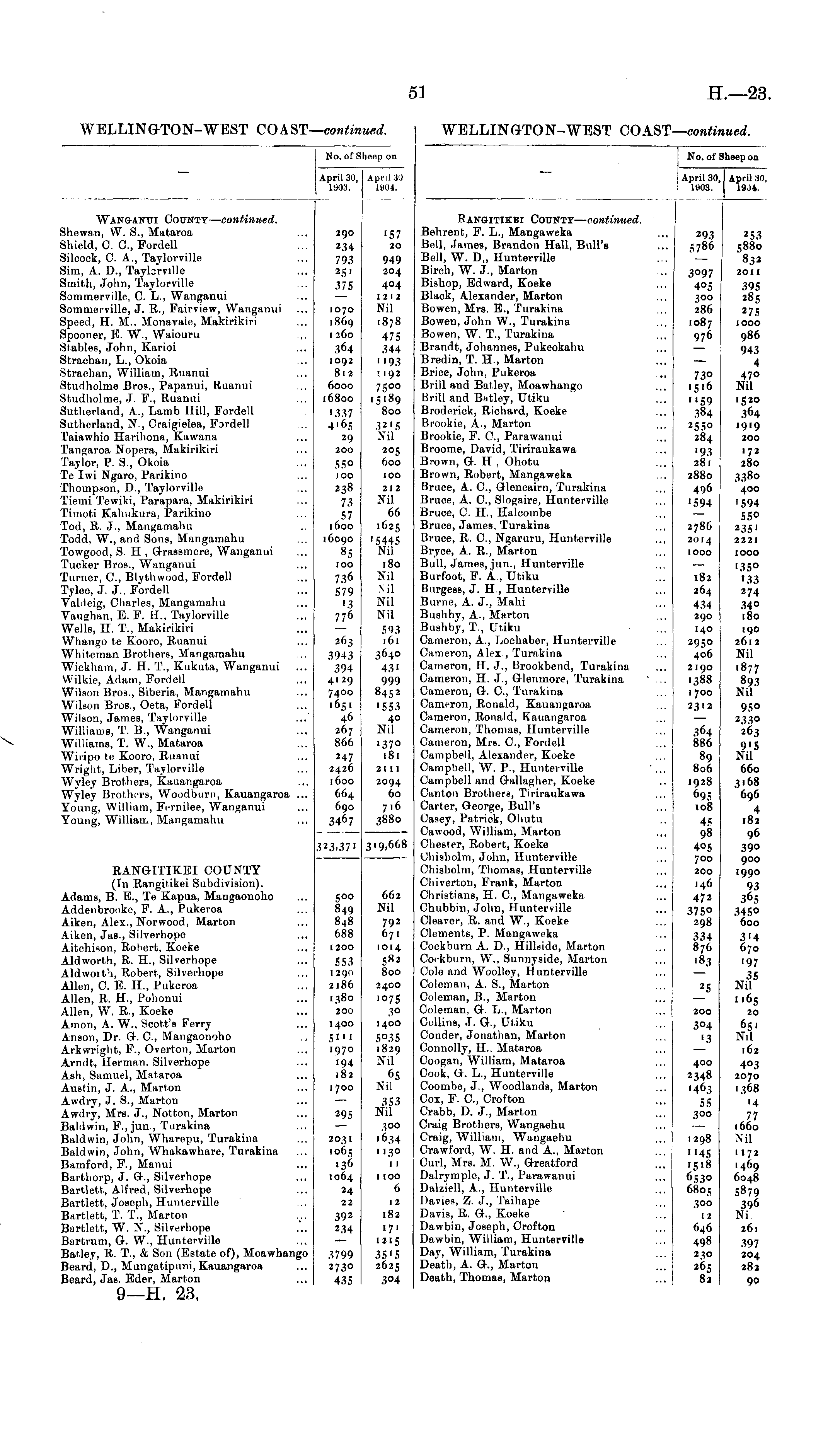 No. of Sheep on April 30, 1903. April 30 1904. Wanganui County— continued. Shewan, W. S., Mataroa Shield, C. C, Fordell Silcock, C. A., Taylorville Sim, A. D., Taylorville Smith, John, Taylorville Sommerville, C. L., Wanganui Sommerville, J. R., Fairview, Wanganui Speed, H. M., Monavale, Makirikiri Spooner, E. W., Waiouru Stables, John, Karioi Strachan, L., Okoia Strachan, William, Ruanui Studholme Bros., Papanui, Ruanui Studholme, J F., Ruanui Sutherland, A., Lamb Hill, Fordell Sutherland, N., Craigielea, Fordell Taiawhio Harihona, Kawana Tangaroa Nopera, Makirikiri Taylor, P. S , Okoia Te Iwi Ngaro, Parikino Thompson, D., Taylorville Tiemi Tewiki, Parapara, Makirikiri Timoti Kahukura, Parikino Tod, R. J., Mangamahu Todd, W., and Sons, Mangamahu Towgood, S. H , Grassmere, Wanganui Tucker Bros., Wanganui Turner, C, Blythwood, Fordell Tylee, J. J., Fordell Valdeig, Charles, Mangamahu Vaughan, E. F. II., Taylorville Wells, H. T., Makirikiri Whango te Kooro, Ruanui Whiteman Brothers, Mangamahu Wickham, J. H. T\, Kukuta, Wanganui Wilkie, Adam, Fordell Wilson Bros., Siberia, Mangamahu Wilson Bros., Oeta, Fordell Wilson, James, Taylorville Williams, T. B., Wanganui Williams, T. W., Mataroa Wiripo te Kooro, Ruanui Wright, Liber, Taylorville Wyley Brothers, Kauangaroa Wyley Brothers, Woodbtirn, Kauangaroa ... Young, William, Fernilee, Wanganui Young, William, Mangamahu 290 234 793 25' 375 1070 1869 1260 364 1092 812 6000 16800 '337 4'6.5 29 200 55° 100 238 7.3 57 1600 16090 85 100 7.36 579 '3 776 263 394.3 394 4129 74°° 1651 46 267 866 247 2426 1600 664 690 3467 '57 20 949 204 4°4 1212 Nil 1878 475 344 "93 [ 192 7500 15 189 800 3215 Nil 205 600 100 21 2 Nil 66 1625 '5445 Nil 180 Nil Nil Nil Nil 593 161 3640 4.3' 999 8452 '553 40 Nil '370 181 2111 2094 60 716 3880 319,668 RANGITIKEI COUNTY (In Rangitikei Subdivision). Adams, B. E., Te Kapua, Mangaonoho Addenbrooke, F. A., Pukeroa Aiken, Alex., Norwood, Marton Aiken, Jas., Silverhope Aitehison, Robert, Koeke Aldworth, R. H., Silverhope Aldwoith, Robert, Silverhope Allen, C. E. H., Pukeroa Allen, R. H., Pohonui Allen, W. R., Koeke Amon, A. W., Scott's Ferry Anson, Dr. G. C, Mangaonoho Arkwright, F., Overton, Marton Arndt, Herman. Silverhope Ash, Samuel, Mataroa Austin, J. A., Marlon Awdry, J. S., Marton Awdry, Mrs. J., Notion, Marton Baldwin, F., jun , Turakina Baldwin, John, Wharepu, Turakina Baldwin, John, Whakawhare, Turakina Bamford, F., Manui Barthorp, J. G., Silverhope Bartlett, Alfred, Silverhope Bartlett, Joseph, Hunterville Bartlett, T. T., Marton Bartlett, W. N., Silverhope Bartrum, G. W., Hunterville Batley, R. T., & Son (Estate of), Moawhango Beard, D., Mungatipuni, Kauangaroa Beard, Jas. Eder, Marton 323.37' 500 849 848 688 1200 553 1290 2186 1380 200 1400 5"' '97° 194 182 662 Nil 792 67. 1014 582 800 2400 '°75 30 1400 50.35 1829 Nil 65 Nil 1700 295 2031 1065 136 1064 24 22 392 2.34 353 Nil 3°o '6.34 1130 11 1100 6 12 182 171 1215 35' 5 2625 304 3799 2730 435