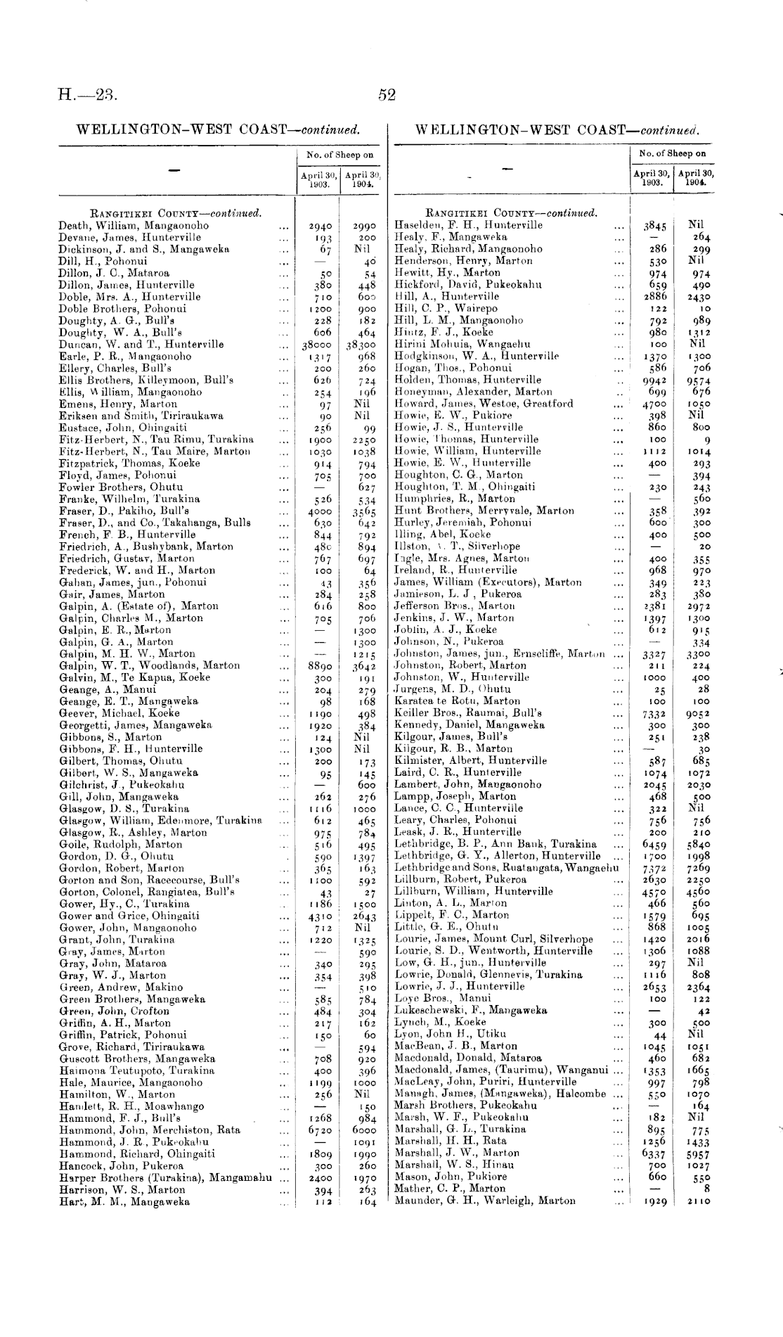 No. of Sheep on April 30, 1903. April 30, 1904. Rangitikei County— continued. Haselden, F. H., Hunterville ... 3845 Healy. F., Mangaweka ... — Healy, Richard, Mangaonoho ... 286 Henderson, Henry, Marton ... 530 Hewitt, Hy., Marton ... 974 Hickford, David, Pukeokahu ... 659 Hill, A., Hunterville ... 2886 Hill, C. P., Wairepo ... 122 Hill, L. M., Mangaonoho ... 792 Hintz, F. J., Koeke ... 980 Hirini Mohuia, Wangaehu ... 100 Hodgkinson, W. A., Hunterville ... 1370 Hogan, Thos., Pohonui ... 586 Holden, Thomas, Hunterville .. 9942 Honeyman, Alexander, Marton .. ' 699 Howard, James, Westoe, Greatford ... : 4700 Howie, E. W., Pukiore ... 398 Howie, J. S., Hunterville ... 860 Howie, Thomas, Hunterville ... 100 Howie, William, Hunterville ... 1112 Howie, E. W., Hunterville ... 400 Houghton, C. G, Marton ... — Houghton, T. M., Ohingaiti ... 230 Humphries, R., Marton ... — Hunt Brothers, Merryvale, Marton ... 358 Hurley, Jeremiah, Pohonui ... 600 llling, Abel, Koeke ... 400 Illston, v. T., Silverhope ... — Ingle, Mrs. Agnes, Marton ... 400 Ireland, R., Hunterville ... 968 James, William (Executors), Marton ... 349 Jamieson, L. J, Pukeroa ... 283 Jefferson Bros., Marton ... 2381 Jenkins, J. W., Marton ... 1397 Joblin, A. J., Koeke ... 612 Johnson, N., Pukeroa ... — Johnston, James, jun., Ernscliffe, Marton ... 3327 Johnston, Robert, Marton ... 211 Johnston, W., Hunterville ... 1000 Jurgens, M. D, Ohutu ... 25 Karatea te Rotu, Marton ... 100 Keiller Bros., Raumai, Bull's ... 7332 Kennedy, Daniel, Mangaweka ... 300 Kilgour, James, Bull's ... 251 Kilgour, R. B., Marton ... — Kilmister, Albert, Hunterville ... 587 Laird, C. R., Hunterville ... '°74 Lambert, John, Mangaonoho ... 2045 Lampp, Joseph, Marton ... 468 Lance, C. C, Hunterville ... 322 Leary, Charles, Pohonui ... 756 Leask, J. R., Hunterville ... 200 Lethbridge, B. P., Ann Bank, Turakina ... 6459 Lethbridge, G. Y., Allerton, Hunterville ... 1700 Lethbridge and Sons, Ruatangata, Wangaehu 7372 Lillburn, Robert, Pukeroa ... 2630 Lillburn, William, Hunterville ... 457° Linton, A. L., Marlon ... 466 Lippelt, F. C, Marton ... 1579 Little, G. E., Ohutu ... 868 Lourie, James, Mount Curl, Silverhope ... 1420 Lourie, S. D., Wentworth, Hunterville ... I 1306 Low, G. H., jun., Hunterville ... 297 Lowrie, Donald, Glennevis, Turakina ... 1116 Lowrie, J. J., Hunterville ... 2653 Love Bros., Manui ... 100 Lukeschewski, F., Mangaweka ... — Lynch, M., Koeke ... 300 Lyon, John H., Utiku ... 44 MacBean, J. B , Marton ... 1045 Macdonald, Donald, Mataroa ... 460 Macdonald, James, (Taurimu), Wanganui ... '353 MacLeay, John, Puriri, Hunterville ... 997 Managh, James, (Mangaweka), Halcombe ... 550 Marsh Brothers, Pukeokahu ... — Marsh, W. F., Pukeokahu ... 182 Marshall, G. L., Turakina ... 895 Marshall, H. H., Rata ... 1256 Marshall, J. W., Marton 6337 Marshall, W. S., Hinau ... 700 Mason, John, Pukiore ... 660 Mather, C. P., Marton ... — Maunder, G. H., Warleigh, Marton ... i 1929 Nil 264 299 Nil 974 49° 2430 10 989 1312 Nil 1300 706 9574 676 1050 Nil 800 9 1014 293 394 243 560 392 300 500 20 355 97° 223 380 2972 1300 9'5 334 3300 224 400 28 100 9052 300 238 30 685 1072 2030 500 Nil 756 210 5840 1998 7269 2250 4560 560 695 1005 2016 1088 Nil 808 2364 122 42 500 Nil 1051 682 1665 798 1070 164 Nil 775 '433 5957 1027 55° 8 2110