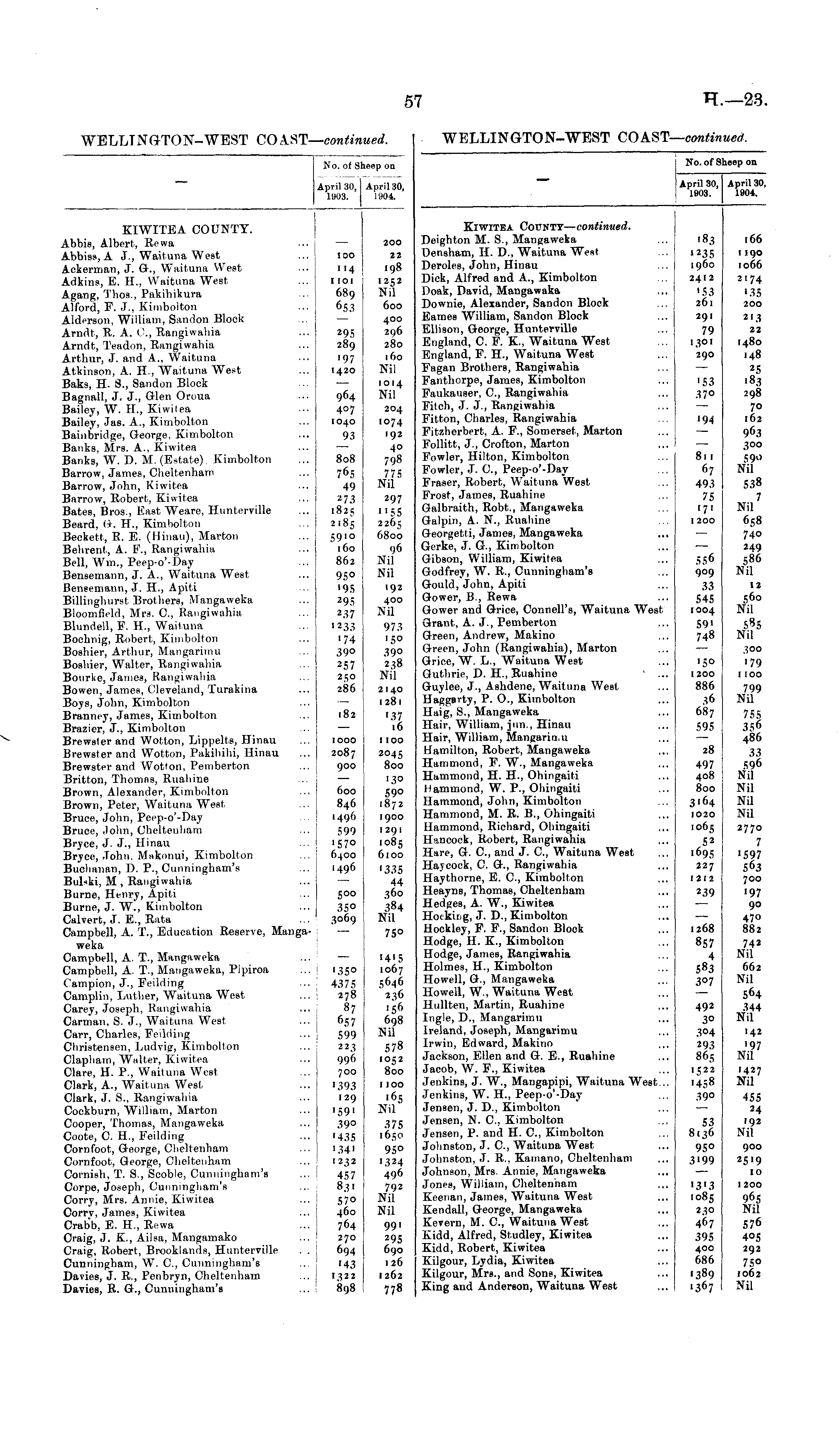 No. of g April 30, 1903. heep on I April 30, 1904. KIWITEA COUNTY. Abbis, Albert, Rewa ... Abbiss, A J., Waituna West Ackerman, J. G., Waituna West Adkins, E. H., Waituna West Agang, Thos., Pakihikura Alford, F. J., Kimbolton Alderson, William, Sandon Block Arndt, R. A. C, Rangiwahia Arndt, Teadon, Rangiwahia Arthur, J. and A., Waituna Atkinson, A. H., Waituna West Baks, H. S., Sandon Block Bagnall, J. J., Glen Oroua Bailey, W. II., Kiwitea Bailey, Jas. A., Kimbolton Bainbridge, George. Kimbolton Banks, Mrs. A., Kiwitea Batiks, W. D. M. (Estate). Kimbolton Barrow, James, Cheltenham Barrow, John, Kiwitea Barrow, Robert, Kiwitea Bates, Bros., East Weare, Hunterville Beard, G. H., Kimbolton Beckett, R. E. (Hinau), Marton Behrent, A. F., Rangiwahia Bell, Win., Peep-o'-Day Bensemann, J. A., Waituna West Bensemann, J. H., Apiti Billinghurst Brothers, Mangaweka Bloomfield, Mrs. C, Rangiwahia Blundell, F. H., Waituna Bochnig, Robert, Kimbolton Boshier, Arthur, Mangarimu Boshier, Walter, Rangiwahia Bourke, James, Rangiwahia Bowen, James, Cleveland, Turakina Boys, John, Kimbolton Branney, James, Kimbolton Brazier, J., Kimbolton Brewster and Wotton, Lippelts, Hinau Brewster and Wotton, Pakihihi, Hinau Brewster and Wotton, Pemberton Britton, Thomas, Ruahine Brown, Alexander, Kimbolton Brown, Peter, Waituna West Bruce, John, Peep-o'-Day Bruce, John, Cheltenham Bryce, J. J., Hinau Bryce, John, Makonui, Kimbolton Buchanan, D. P., Cunningham's Bulski, M , Rangiwahia Burne, Henry, Apiti Burne, J. W., Kimbolton Calvert, J. E., Rata Campbell, A. T., Education Reserve, Mangaweka Campbell, A. T., Mangaweka Campbell, A. T., Mangaweka, Pipiroa ... j Campion, J., Feilding Camplin, Luther, Waituna West ... | Carey, Joseph, Rangiwahia ... i Carman, S. J., Waituna West ... j Carr, Charles, Feilding ... Christensen, Ludvig, Kimbolton Claphaui, Walter, Kiwitea Clare, H. P., Wailuna West Clark, A., Waituna West Clark, J. 8., Rangiwahia Cockburn, William, Marton Cooper, Thomas, Mangaweka Coote, C. H., Feilding Cornfoot, George, Cheltenham Cornfoot, George, Cheltenham Cornish, T. S., Scobie, Cunningham's Corpe, Joseph, Cunningham's Corry, Mrs. Annie, Kiwitea Corrv, James, Kiwitea Crab'b, E. H., Rewa Craig, J. K., Ailsa, Mangamako Craig, Robert, Brooklands, Hunterville . . Cunningham, W. C, Cunningham's Davies, J. R., Penbryn, Cheltenham Davies, R. G., Cunningham's IOO "4 I 101 689 653 295 289 '97 1420 964 407 1040 93 808 765 49 273 182; 2185 59'0 160 862 95° '95 295 2.37 '23.3 '74 39° 257 250 286 182 1000 2087 900 600 846 1496 599 '57° 6400 1496 500 35° 3069 '35° 4375 278 87 657 599 22,3 996 700 1.393 129 '59' 39° '435 '34' 1232 457 8.3' 57o 460 764 270 694 '43 1322 898 200 22 198 1252 Nil 600 400 296 280 160 Nil 1014 Nil 204 1074 192 4° 798 775 Nil 297 "55 2265 6800 96 Nil Nil 192 400 Nil 973 '5° 39° 238 Nil 2140 1281 '37 16 1100 2°45 800 '3° 59° 1872 1900 1291 .085 6100 '3.35 44 360 384 Nil 75° '4'5 1067 5646 236 '56 698 Nil 578 1052 800 1100 '65 Nil 375 1650 95° '.324 496 792 Nil Nil 99' 295 690 126 1262 778
