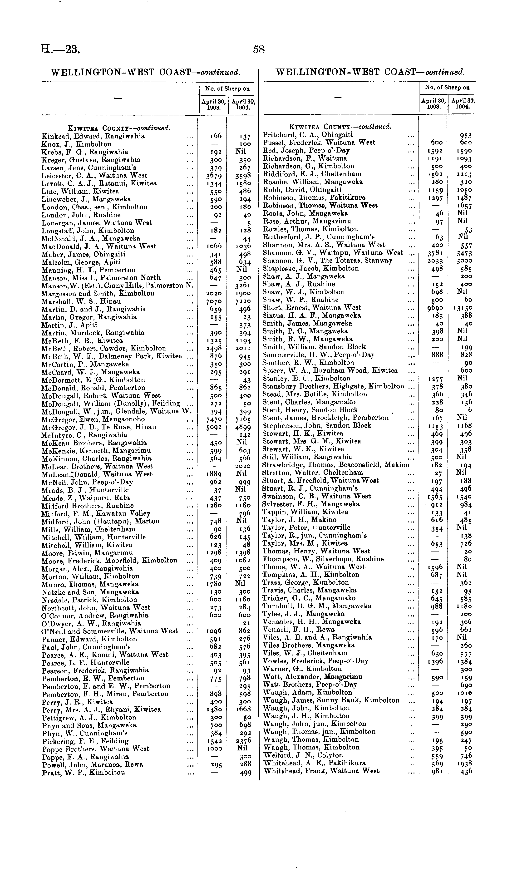 No. of Sheep on April 30, April 30, 1903. 1904. Kiwitea County— continued. Kinkead, Edward, Rangiwahia Knox, J., Kimbolton Krebs, F. G., Rangiwahia Kreger, Gustave, Rangiwahia Larsen, Jens, Cunningham's Leicester, C. A., Waituna West Levett, C. A. J., Ratanui, Kiwitea Line, William, Kiwitea Lineweber, J., Mangaweka London, Chas., sen., Kimbolton London, John, Ruahine Lonergan, James, Waituna West Longstaff, John, Kimbolton McDonald, J. A., Mangaweka MacDonald, J. A., Waituna West Maher, James, Ohingaiti Malcolm, George, Apiti Manning, H. T , Pemberton Manson, Miss I., Palmerston North Manson,W. (Est..),ClunyHills, Palmerston N. Margesson and Smith, Kimbolton Marshall, W. S., Hinau Martin, D. and J., Rangiwahia Martin, Gregor, Rangiwahia Martin, J., Apiti Martin, Murdock, Rangiwahia McBeth, F. B., Kiwitea McBeth, Robert, Cawdor, Kimbolton McBeth, W. F., Dalmeney Park, Kiwitea ... McCartin, P., Mangaweka MeCoard, W. J-, Mangaweka McDermott, Kimbolton McDonald, Ronald, Pemberton McDougall, Robert, Waituna West McDougall, William (Dunolly), Feilding ... McDougall, W., jun., Glendale, Waituna W. McGregor, Ewen, Mangaonoho McGregor, J. D., Te Ruae, Hinau Mclntyre, C, Rangiwahia McKean Brothers, Rangiwahia McKenzie, Kenneth, Mangarimu McKinnon, Charles, Rangiwahia McLean Brothers, Waituna West McLean,"Donald, Waituna West McNeil, John, Peep-o'-Day Meads, B. J., Hunterville Meads, Z , Waipuru, Rata Midford Brothers, Ruahine Mi iford, F. M., Kawatau Valley Midford, John (Hautapu), Marton Mills, William, Cheltenham Mitchell, William, Hunterville Mitchell, William, Kiwitea Moore, Edwin, Mangarimu Moore, Frederick, Moorfield, Kimbolton Morgan, Alex., Rangiwahia Morton, William, Kimbolton Munro, Thomas, Mangaweka Natzke and Son, Mangaweka Nesdale, Patrick, Kimbolton Northcott, John, Waituna West O'Connor, Andrew, Rangiwahia O'Dwyer, A. W., Rangiwahia O'Neill and Sommerville, Waituna West ... Palmer, Edward, Kimbolton Paul, John, Cunningham's Pearce, A. E., Konini, Waituna West Pearce, L. F., Hunterville Pearson, Frederick, Rangiwahia Pemberton, E. W., Pemberton Pemberton, F. and E. W., Pemberton Pemberton, F. H., Mirau, Pemberton Perry, J. R-, Kiwitea Perry, Mrs. A. J., Rhyani, Kiwitea Pettigrew, A. J., Kimbolton Phyn and Sons, Mangaweka Phyn, W., Cunningham's Pickering, F. E., Feilding Poppe Brothers, Waituna West Poppe, F. A., Rangiwahia Powell, John, Maranoa, Rewa Pratt, W. P., Kimbolton 166 192 300 379 3679 '344 55° 590 200 92 182 1066 34' 588 465 647 2020 7070 659 '55 390 1325 2498 876 35° 295 865 500 272 394 747° 5092 45° 599 564 '37 IOO Nil 35° 267 3598 1580 486 294 180 40 5 128 44 1036 498 6.34 Nil 300 3261 1900 7220 496 2.3 373 394 "94 201 1 945 300 291 43 862 400 50 399 7'65 4899 142 Nil 603 566 2020 Nil 999 Nil 750 1180 796 Nil 136 '45 48 '398 1082 500 722 Nil 1889 962 37 4.37 1280 748 90 626 '2.3 1298 409 400 739 1780 '3° 600 273 600 300 1180 284 600 1096 59' 682 4°3 5°5 92 775 898 400 1480 300 700 384 '542 IOOO 21 862 276 576 395 56. 9.3 798 295 598 300 1668 50 698 292 2376 Nil 295 300 288 499