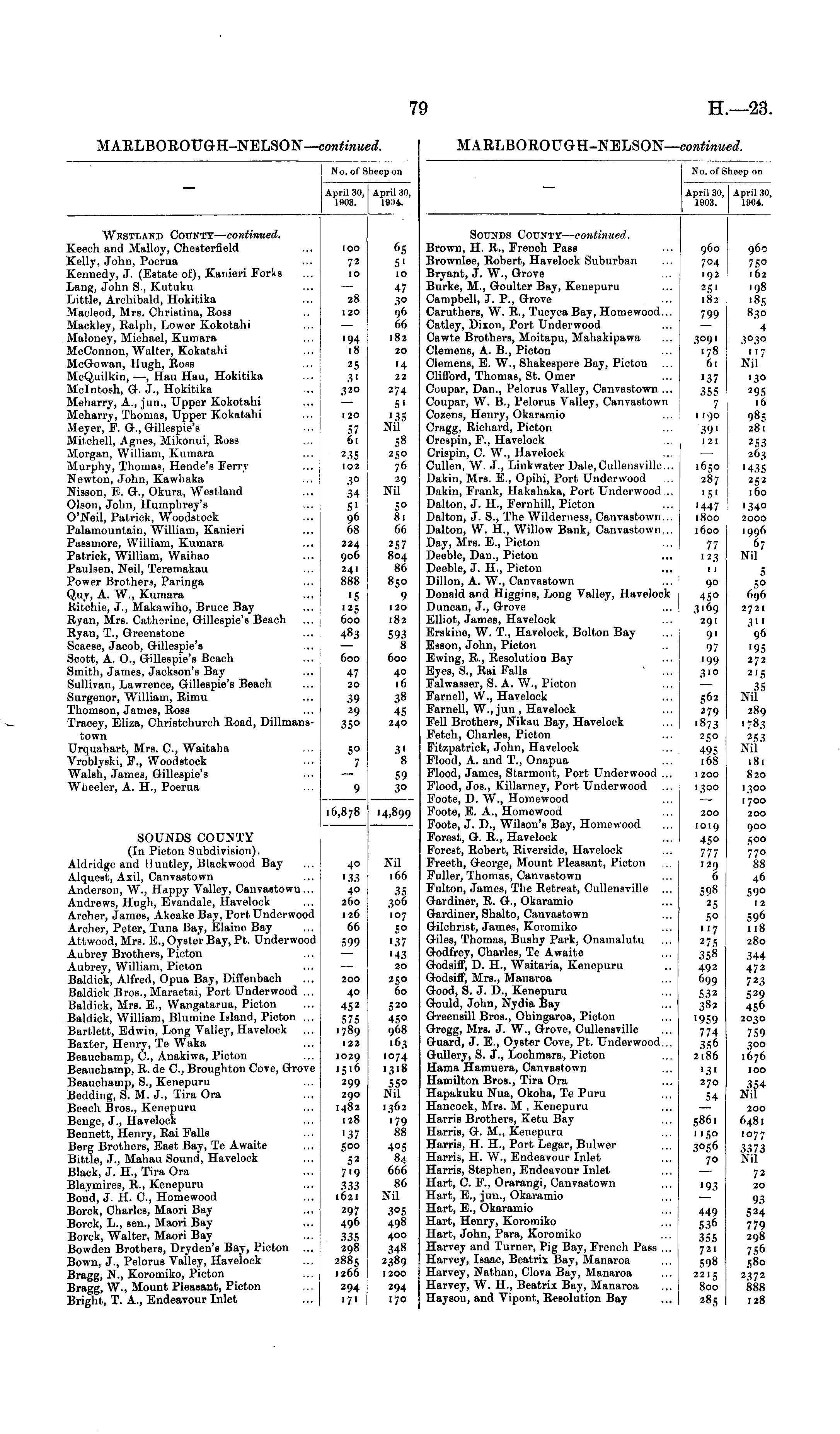 No. of Sheep on April 30, April 30, 1903. 191)4. Westland County— continued. Keech and Malloy, Chesterfield Kelly, John, Poerua Kennedy, J. (Estate of), Kanieri Forks Lang, John S., Kutuku Little, Archibald, Hokitika Maeleod, Mrs. Christina, Ross Mackley, Ralph, Lower Kokotahi Maloney, Michael, Kumara McConnon, Walter, Kokatahi McGowan, Hugh, Ross McQuilkin, —, Hau Hau, Hokitika Mcintosh, G. J., Hokitika Meharry, A., jun., Upper Kokotahi Meharry, Thomas, Upper Kokatahi Meyer, F. G., Gillespie's Mitchell, Agnes, Mikonui, Ross Morgan, William, Kumara Murphy, Thomas, Hende's Ferry Newton, John, Kawhaka NiBSon, E. G., Okura, Westland Olson, John, Humphrey's O'Neil, Patrick, Woodstock Palamountain, William, Kanieri Passmore, William, Kumara Patrick, William, Waihao Paulsen, Neil, Teremakau Power Brothers, Paringa Quy, A. W., Kumara Ritchie, J., Makawiho, Bruce Bay Ryan, Mrs. Catherine, Gillespie's Beach Ryan, T., Greenstone Scaese, Jacob, Gillespie's Scott, A. O., Gillespie's Beach Smith, James, Jackson's Bay Sullivan, Lawrence, Gillespie's Beach Surgenor, William, Rimu Thomson, James, Ross Tracey, Eliza, Christehurch Road, Dillmanstown Urquahart, Mrs. C, Waitaha Vroblyski, F., Woodstock Walsh, James, Gillespie's Wheeler, A. H., Poerua IOO 72 IO 28 120 '94 '8 25 3' .32° 120 57 61 2.35 102 .30 34 5' 96 68 65 5' 10 47 3° 96 66 182 20 •4 22 274 5' '35 Nil 58 250 76 29 Nil 5° 81 66 257 804 86 850 9 120 182 593 8 600 224 906 241 888 '5 '25 600 483 600 47 20 39 29 35° 40 16 .38 45 240 50 7 3' 8 9 59 3° SOUNDS COUNTY (In Picton Subdivision). Aldridge and H untley, Blackwood Bay Alquest, Axil, Canvastown Anderson, W., Happy Valley, Canvastown... Andrews, Hugh, Evandale, Havelock Archer, James, Akeake Bay, Port Underwood Archer, Peter, Tuna Bay, Elaine Bay Attwood, Mrs. E., Oyster Bay, Pt. Underwood Aubrey Brothers, Picton Aubrey, William, Picton Baldick, Alfred, Opua Bay, Diffenbach Baldick Bros., Maraetai, Port Underwood ... Baldick, Mrs. E., Wangatarua, Picton Baldick, William, Blumine Island, Picton ... Bartlett, Edwin, Long Valley, Havelock Baxter, Henry, Te Waka Beauchamp, C., Anakiwa, Picton Beauchamp, R. de C, Broughton Cove, Grove Beauchamp, S., Kenepuru Bedding, S. M. J., Tira Ora Beech Bros., Kenepuru Benge, J., Havelock Bennett, Henry, Rai Falls Berg Brothers, East Bay, Te Awaite Bittle, J., Mahau Sound, Havelock Black, J. H., Tira Ora Blaymires, R., Kenepuru Bond, J. H. O, Homewood Borck, Charles, Maori Bay Borck, L., sen., Maori Bay Borck, Walter, Maori Bay Bowden Brothers, Dryden's Bay, Picton ... Bown, J., Pelorus Valley, Havelock Bragg, N., Koromiko, Picton Bragg, W., Mount Pleasant, Picton Bright, T. A., Endeavour Inlet 16,878 14.899 40 '33 40 260 126 66 599 Nil 166 35 306 107 5° '37 '43 20 250 60 200 4° 452 575 1789 122 1029 1516 299 290 1482 128 520 45° 968 163 1074 1318 55° Nil 1362 '79 88 4°5 84 666 86 Nil 3°5 498 400 .348 2389 1200 294 170 '37 500 52 719 333 1621 297 496 335 298 2885 1266 294 171