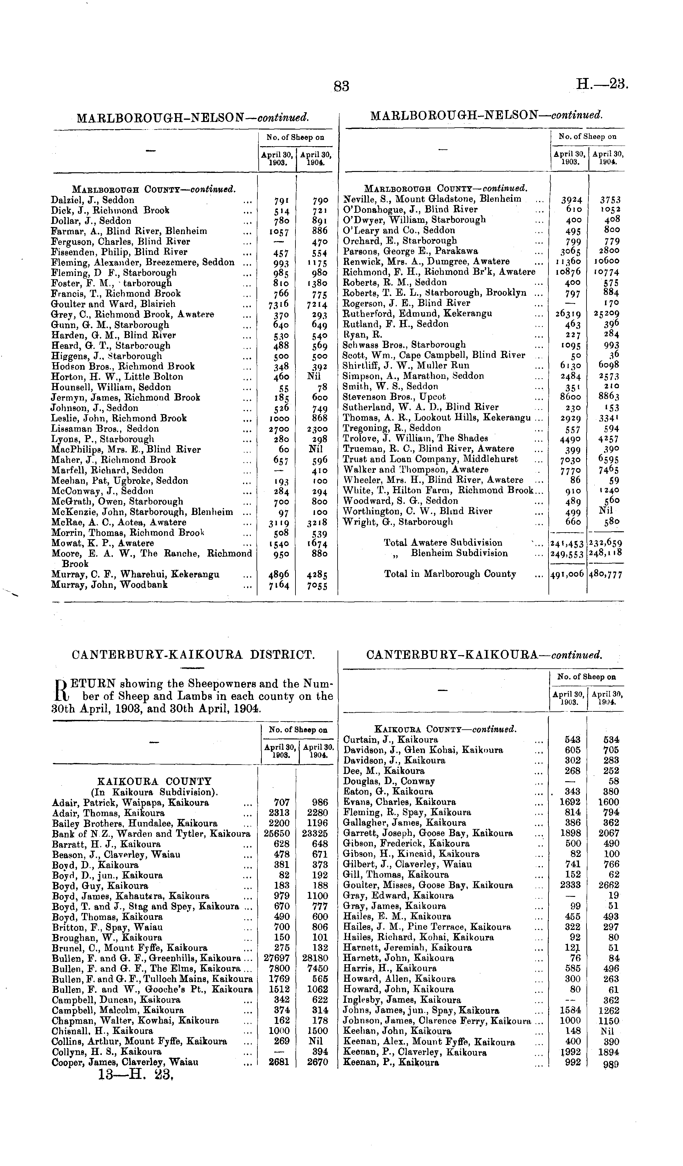 No. of Sheep on April 30, 1903. April 30. 1904. KAIKOURA COUNTY (In Kaikoura Subdivision). Adair, Patrick, Waipapa, Kaikoura Adair, Thomas, Kaikoura Bailey Brothers, Hundalee, Kaikoura Bank of N Z., Warden and Tytler, Kaikoura Barratt, H. J., Kaikoura Beason, J., Claverley, Waiau Boyd, D., Kaikoura Boyd, D., jun., Kaikoura Boyd, Guy, Kaikoura Boyd, James, Kahauttra, Kaikoura Boyd, T. and J., Stag and Spey, Kaikoura ... Boyd, Thomas, Kaikoura Britton, F., Spay, Waiau Broughan, W., Kaikoura Brunei, C, Mount Fyffe, Kaikoura Bullen, F. and G. F., Greenhills, Kaikoura ... Bullen, F. and G. F., The Elms, Kaikoura ... Bullen, F. and G. F., Tulloch Mains, Kaikoura Bullen, F. and W., Gooche's Pt., Kaikoura Campbell, Duncan, Kaikoura Campbell, Malcolm, Kaikoura Chapman, Walter, Kowhai, Kaikoura Chisnall, H., Kaikoura Collins, Arthur, Mount Fyffe, Kaikoura Collyns, H. S., Kaikoura Cooper, James, Claverley, Waiau 707 2313 2200 25650 628 478 381 82 183 979 670 490 700 150 275 27697 7800 1769 1512 342 374 162 1000 269 986 2280 1196 23325 648 671 373 192 188 1100 777 600 806 101 132 28180 7450 565 1062 622 314 178 1500 Nil 394 2670 2681