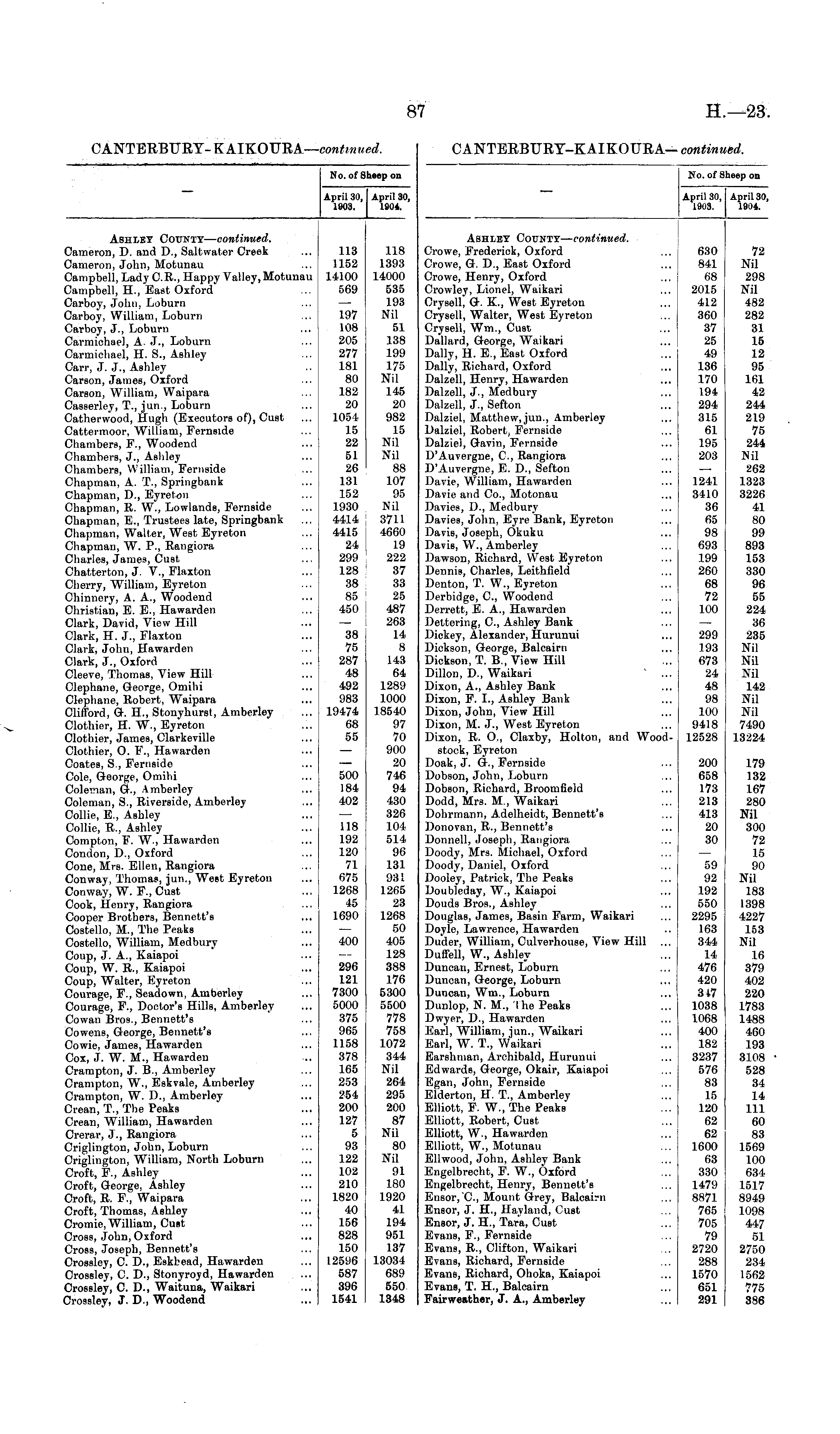 No. of Sheep on April 30, 1803. April 30, 1904. Ashley County— continued. Cameron, D. and D., Saltwater Creek Cameron, John, Motunau Campbell, Lady C.R., Happy Valley, Motunau Campbell, H., East Oxford Carboy, John, Loburn Carboy, William, Loburn Carboy, J., Loburn Carmichael, A. J., Loburn Carmichael, H. S., Ashley Carr, J. J., Ashley Carson, James, Oxford Carson, William, Waipara Casserley, T., jun., Loburn Catherwood, Hugh (Executors of), Cust Cattermoor, William, Fernside Chambers, F., Woodend Chambers, J., Ashley Chambers, William, Fernside ... Chapman, A. T., Springbank Chapman, D., Eyreton Chapman, R. W., Lowlands, Fernside Chapman, E., Trustees late, Springbank Chapman, Walter, West Eyreton Chapman, W. P., Rangiora Charles, James, Cust Chatterton, J. V., Flaxton Cherry, William, Eyreton Chinnery, A. A., Woodend Christian, E. E., Hawarden Clark, David, View Hill Clark, H. J., Flaxton Clark, John, Hawarden Clark, J., Oxford Cleeve, Thomas, View Hill Clephane, George, Omihi Clephane, Robert, Waipara Clifford, G. H., Stonyhurst, Amberley Clothier, H. W., Eyreton Clothier, James, Clarkeville Clothier, O. F., Hawarden Coates, S., FeniBide Cole, George, Omihi Coleman, G., Amberley Coleman, S., Riverside, Amberley Collie, E., Ashley Collie, R., Ashley Compton, F. W., Hawarden Condon, D., Oxford Cone, Mrs. Ellen, Rangiora Conway, Thomas, jun., West Eyreton Conway, W. F., Cust Cook, Henry, Rangiora Cooper Brothers, Bennett's Costello, M., The Peaks Costello, William, Medbury Coup, J. A., Kaiapoi Coup, W. R., Kaiapoi Coup, Walter, Eyreton Courage, F., Seadown, Amberley Courage, F., Doctor's Hills, Amberley Cowan Bros., Bennett's Cowens, George, Bennett's Cowie, James, Hawarden Cox, J. W. M., Hawarden Crampton, J. B, Amberley Crampton, W., Eskvale, Amberley Crampton, W. D., Amberley Crean, T., The Peaks Crean, William, Hawarden Crerar, J., Rangiora Criglington, John, Loburn Criglington, William, North Loburn Croft, F., Ashley Croft, George, Ashley Croft, R. F., Waipara Croft, Thomas, Ashley Cromie, William, Cust Cross, John, Oxford Cross, Joseph, Bennett's Crossley, C. D., Eskbead, Hawarden Crossley, C. D., Stonyroyd, Hawarden Crossley, C. D., Waituna, Waikari Crossley, J. D., Woodend 113 1152 14100 569 197 108 205 277 181 80 182 20 1054 15 22 51 26 131 152 1930 4414 4415 24 299 128 38 85 450 38 75 287 48 492 983 19474 68 55 500 184 402 118 192 120 71 675 1268 45 1690 400 296 121 7300 5000 375 965 1158 378 165 253 254 200 127 5 93 122 102 210 1820 40 156 828 150 12596 587 396 1541 118 1393 14000 535 193 Nil 51 138 199 175 Nil 145 20 982 15 Nil Nil 88 107 95 Nil 3711 4660 19 222 37 33 25 487 263 14 8 143 64 1289 1000 18540 97 70 900 20 746 94 430 326 104 514 96 131 931 1265 23 1268 50 405 128 388 176 5300 5500 778 758 1072 344 Nil 264 295 200 87 Nil 80 Nil 91 180 1920 41 194 951 137 13034 689 550 1348