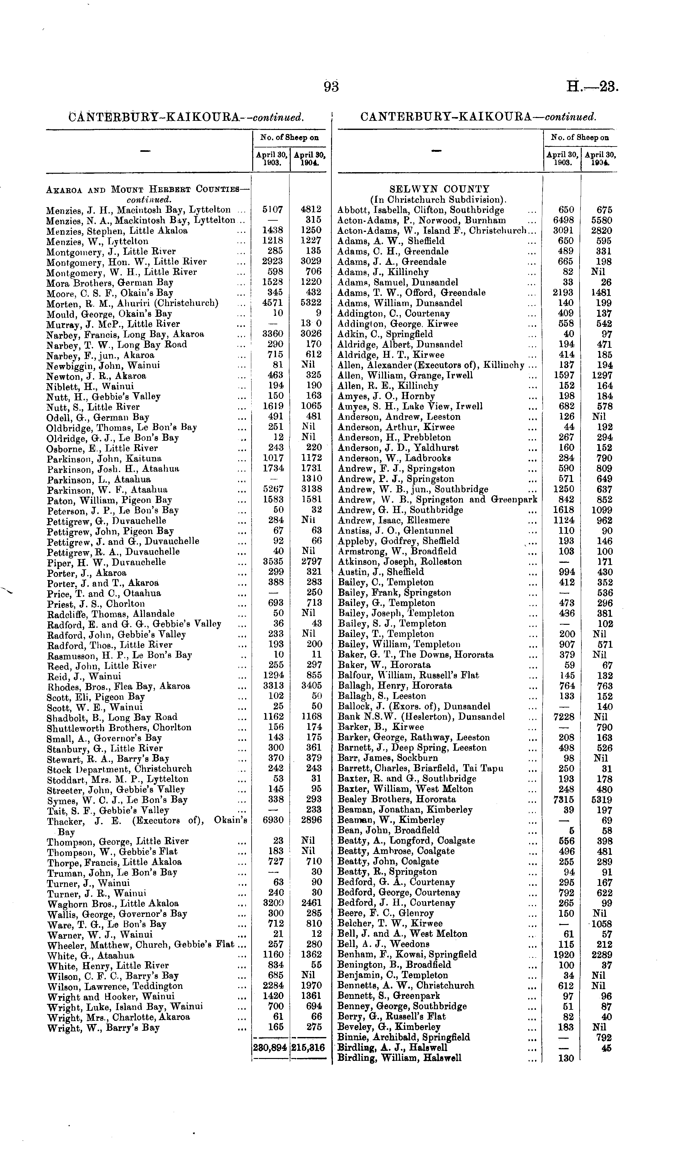No. of Sheep on April 30, April 30, 1903. 1934. SELWYN COUNTY (In Christehurch Subdivision). Abbott, Isabella, Clifton, Southbridge Acton-Adams, P., Norwood, Burnham Acton-Adams, W., Island F., Christehurch... Adams, A. W., Sheffield Adams, C. H., Greendale Adams, J. A., Greendale Adams, J., Killinchy Adams, Samuel, Dunsandel Adams, T. W., Offord, Greendale Adams, William, Dunsandel Addington, C, Courtenay Addington, George. Kirwee Adkin, C, Springfield Aldridge, Albert, Dunsandel Aldridge, H. T., Kirwee Allen, Alexander (Executors of), Killinchy ... Allen, William, Grange, Irwell Allen, R. E., Killinchy Amyes, J. O., Hornby Amyes, S. H., Lake View, Irwell Anderson, Andrew, Leeston Anderson, Arthur, Kirwee Anderson, H., Prebbleton Anderson, J. D., Yaldhurst Anderson, W., Ladbrooks Andrew, F. J., Springston Andrew, P. J., Springston Andrew, W. B., jun., Southbridge Andrew, W. B., Springston and Greenpark Andrew, G. H., Southbridge Andrew, Isaac, Ellesmere Anstiss, J. O., Glentunnel Appleby, Godfrey, Sheffield ... Armstrong, W., Broadfield Atkinson, Joseph, Rolleston Austin, J., Sheffield Bailey, C, Templeton Bailey, Frank, Springston Bailey, G., Templeton Bailey, Joseph, Templeton Bailey, S. J., Templeton Bailey, T., Templeton Bailey, William, Templeton Baker, G. T., The Downs, Hororata Baker, W., Hororata Balfour, William, Russell's Flat Ballagh, Henry, Hororata Ballagh, S., Leeston Ballock, J. (Exors. of), Dunsandel Bank N.S.W. (Heslerton), Dunsandel Barker, B., Kirwee Barker, George, Rath way, Leeston Barnett, J., Deep Spring, Leeston Barr, James, Sockburn Barrett, Charles, Briarfield, Tai Tapu Baxter, R. and G, Southbridge Baxter, William, West Melton Bealey Brothers, Hororata Beaman, Jonathan, Kimberley Beaman, W., Kimberley Bean, John, Broadfield Beatty, A., Longford, Coalgate Beatty, Ambrose, Coalgate Beatty, John, Coalgate Beatty, R., Springston Bedford, G. A., Courtenay Bedford, George, Courtenay Bedford, J. H., Courtenay Beere, F. C, Glenroy Belcher, T. W., Kirwee Bell, J. and A., West Melton Bell, A. J., Weedons Benham, F., Kowai, Springfield Benington, B., Broadfield Benjamin, C, Templeton Bennetts, A. W., Christehurch Bennett, S., Greenpark Benney, George, Southbridge Berry, G., Russell's Flat Beveley, G., Kimberley Binnie, Archibald, Springfield Birdling, A. J., Halswell Birdling, William, Halswell 650 6498 3091 650 489 665 82 33 2193 140 409 558 40 194 414 137 1597 152 198 682 126 44 267 160 284 590 571 1250 842 1618 1124 110 193 103 994 412 473 436 675 5580 2820 595 331 198 Nil 26 1481 199 137 542 97 471 185 194 1297 164 184 578 Nil 192 294 152 790 809 649 637 852 1099 962 90 146 100 171 430 352 536 296 381 102 Nil 571 Nil 67 132 763 152 140 Nil 790 163 526 Nil 31 178 480 5319 197 69 58 398 481 289 91 167 622 99 Nil 1058 57 212 2289 37 Nil Nil 96 87 40 Nil 792 45 200 907 379 59 145 764 133 7228 208 498 98 250 193 248 7315 39 5 556 496 255 94 295 792 265 150 61 115 1920 100 34 612 97 51 82 183 130