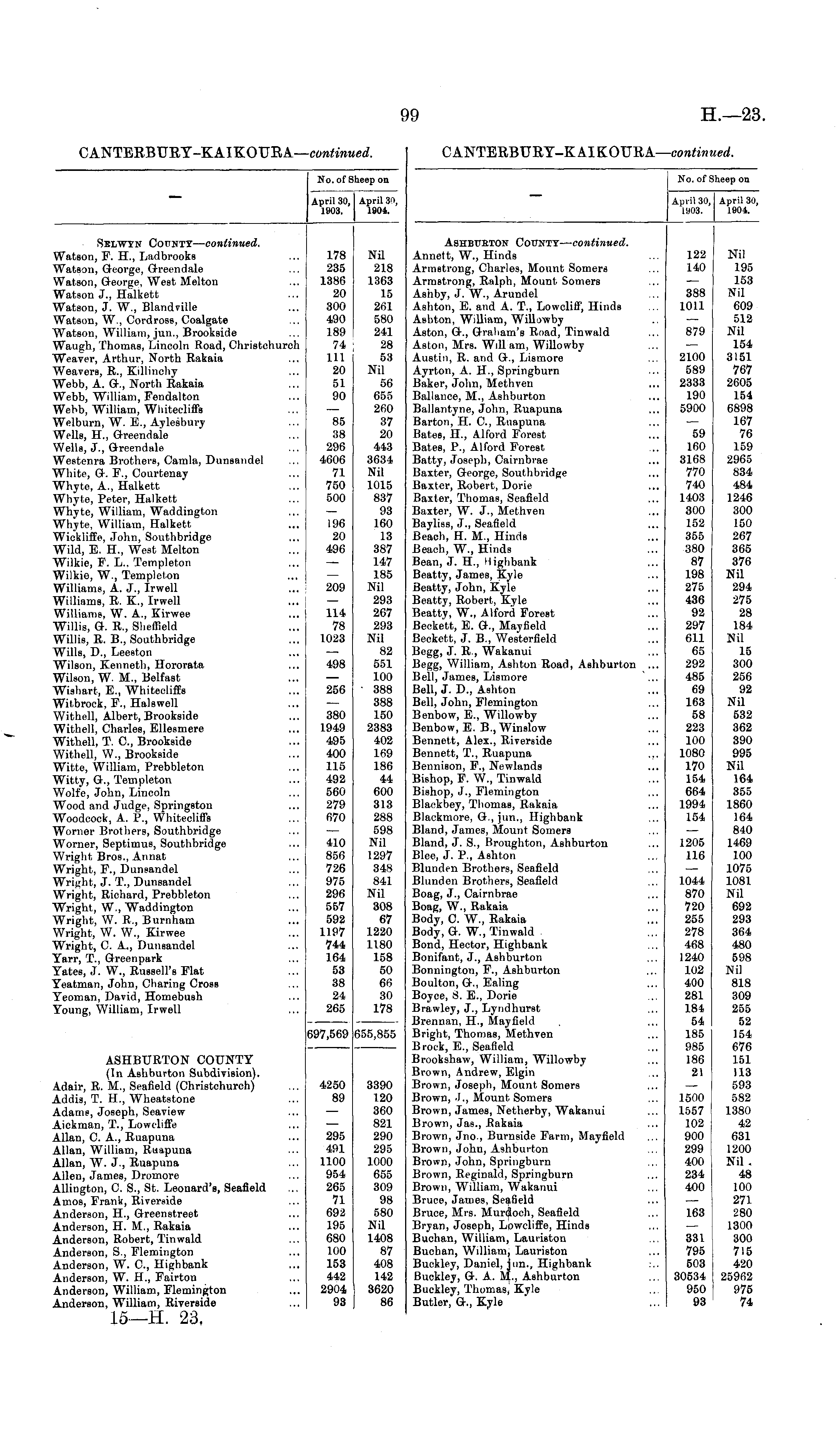 No. of Sheep on April 30, April 30, 1903. 1904. Ashburton County— continued. Annett, W., Hinds Armstrong, Charles, Mount Somers Armstrong, Ralph, Mount Somers Ashby, J. W., Arundel Ashton, E. and A. T., Lowcliff, Hinds Ashton, William, Willowby Aston, G., Graham's Road, Tinwald Aston, Mrs. Will am, Willowby Austin, R. and G., Lismore Ayrton, A. H., Springburn Baker, John, Methven Ballance, M., Ashburton Ballantyne, John, Ruapuna Barton, H. C, Ruapuna Bates, H., Alford Forest Bates, P., Alford Forest Batty, Joseph, Cairnbrae Baxter, George, Southbridge Baxter, Robert, Dorie Baxter, Thomas, Seafield Baxter, W. J., Methven Bayliss, J., Seafield Beach, H. M., Hinds Beach, W., Hinds Bean, J. H., Highbank Beatty, James, Kyle Beatty, John, Kyle Beatty, Robert, Kyle Beatty, W., Alford Forest Beckett, E. G., Mayfield Beckett, J. B., Westerfield Begg, J. R., Wakanui Begg, William, Ashton Road, Ashburton ... Bell, James, Lismore Bell, J. D., Ashton Bell, John, Flemington Benbow, E., Willowby Benbow, E. B., Winslow Bennett, Alex., Riverside Bennett, T., Ruapuna .,, Bennison, F., Newlands Bishop, F. W., Tinwald Bishop, J., Flemington Blaekbey, ThomaB, Rakaia Blackmore, G., jun., Highbank Bland, James, Mount Somers Bland, J. S., Broughton, Ashburton Blee, J. P., Ashton Blunden Brothers, Seafield Blunden Brothers, Seafield Boag, J., Cairnbrae Boag, W., Rakaia Body, C. W., Rakaia Body, G. W., Tinwald Bond, Hector, Highbank Bonifant, J., Ashburton Bonnington, F., Ashburton Boulton, G., Ealing Boyce, S. E., Dorie Brawley, J., Lyndhurst Brennan, H., Mayfield Bright, Thomas, Methven Brock, E., Seafield Brookshaw, William, Willowby Brown, Andrew, Elgin Brown, Joseph, Mount Somers Brown, J., Mount Somers Brown, James, Netherby, Wakanui Brown, Jas., Rakaia Brown, Jno., Burnside Farm, Mayfield Brown, John, Ashburton Brown, John, Springburn Brown, Reginald, Springburn Brown, William, Wakanui Bruce, James, Seafield Bruce, Mrs. Murdoch, Seafield Bryan, Joseph, Lowcliffe, Hinds Buchan, William, Lauriston Bucban, William, Lauriston Buckley, Daniel, jun., Highbank Buckley, G. A. M., Ashburton Buckley, Thomas, Kyle Butler, G., Kyle 122 140 388 1011 879 2100 589 2333 190 5900 59 160 3168 770 740 1403 300 152 355 380 87 198 275 436 92 297 611 65 292 485 69 163 58 223 100 1080 170 154 664 1994 154 Nil 195 153 Nil 609 512 Nil 154 3151 767 2605 154 6898 167 76 159 2965 834 484 1246 300 150 267 365 376 Nil 294 275 28 184 Nil 15 300 256 92 Nil 532 362 390 995 Nil 164 355 1860 164 840 1469 100 1075 1081 Nil 692 293 364 480 598 Nil 818 309 255 52 154 676 151 113 593 582 1380 42 631 1200 Nil . 48 100 271 280 1300 300 715 420 25962 975 74 1205 116 1044 870 720 255 278 468 1240 102 400 281 184 54 185 985 186 21 1500 1557 102 900 299 400 234 400 163 331 795 503 30534 950 93