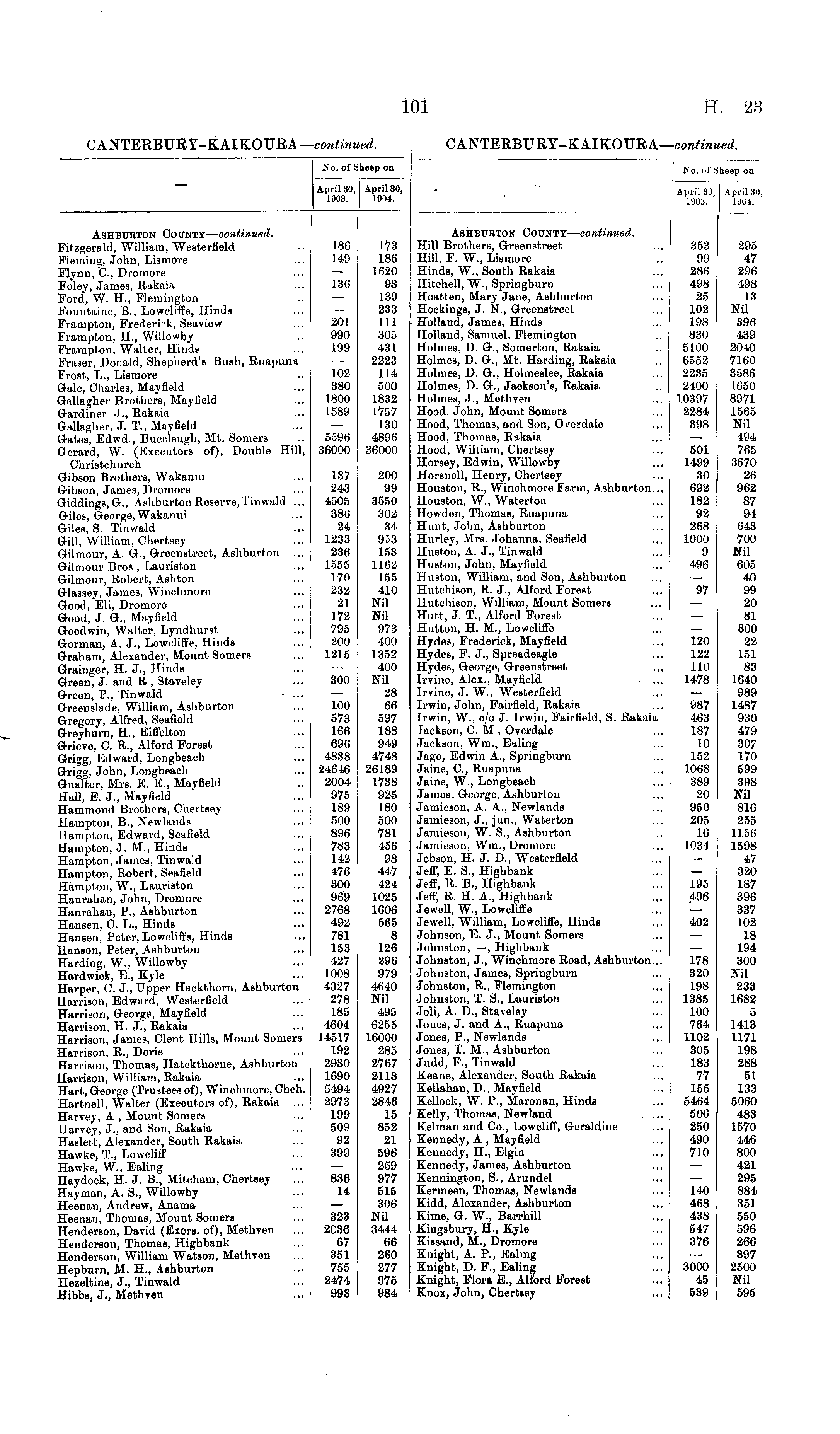 No. of Sheep on April 30, April 30, 1903. 1904. Ashburton County— continued. Fitzgerald, William, Westerfield Fleming, John, Lismore Flynn, C, Dromore S'oley, James, Rakaia Ford, W. H., Flemington Fountaine, B., Lowcliffe, Hinds Frampton, Frederick, Seaview Frampton, H., Willowby Frampton, Walter, Hinds Fraser, Donald, Shepherd's Bush, Ruapuna Frost, L., Lismore Gale, Charles, Mayfield Gallagher Brothers, Mayfield Gardiner J., Rakaia Gallagher, J. T., Mayfield GateB, Edwd., Buccleugh, Mt. Somers Gerard, W. (Executors of), Double Hill, Christehurch Gibson Brothers, Wakanui Gibson, James, Dromore Giddings, G., Ashburton Reserve,Tinwald ... Giles, George, Wakanui Giles, S. Tinwald Gill, William, Chertsey Gilmour, A. G , Greenstreet, Ashburton ... Gilmour Bros , Lauriston Gilmour, Robert, Ashton Glassey, James, Winchmore Good, Eli, Dromore Good, J G., Mayfield Goodwin, Walter, Lyndhurst Gorman, A. J., Lowcliffe, Hinds Graham, Alexander, Mount Somers Grainger, H. J., Hinds Green, J. and R , Staveley Green, P., Tinwald Greenslade, William, Ashburton Gregory, Alfred, Seafield Greyburn, H., Eiffelton Grieve, C. R., Alford Forest Grigg, Edward, Longbeach Grigg, John, Longbeach Gualter, Mrs. E. E., Mayfield Hall, E. J., Mayfield Hammond Brothers, Chertsey Hampton, B., Newlands Hampton, Edward, Seafield Hampton, J. M., Hinds Hampton, James, Tinwald Hampton, Robert, Seafield Hampton, W., Lauriston Hanrahan, John, Dromore Hanrahan, P., Ashburton Hansen, C. L., Hinds Hansen, Peter, Lowcliffs, Hinds Hanson, Peter, Ashburton Harding, W., Willowby Hardwick, E., Kyle Harper, C. J., Upper Hackthorn, Ashburton Harrison, Edward, Westerfield Harrison, George, Mayfield Harrison, H. J., Rakaia Harrison, James, Clent Hills, Mount Somers Harrison, R., Dorie Harrison, Thomas, Halckthorne, Ashburton Harrison, William, Rakaia Hart, George (Trustees of), Winchmore, Cheh. Hartnell, Walter (Executors of), Rakaia ... Harvey, A., Mount Somers Harvey, J., and Son, Rakaia Haslett, Alexander, South Rakaia Hawke, T., Lowcliff Hawke, W., Ealing Haydock, H. J. B., Mitcham, Chertsey Hayman, A. S., Willowby Heenan, Andrew, Anama Heenan, Thomas, Mount Somers Henderson, David (Exors. of), Methven Henderson, Thomas, Highbank Henderson, William Watson, Methven Hepburn, M. H., Ashburton Hezeltine, J., Tinwald Hibbs, J., Methven 186 149 136 201 990 199 102 380 1800 1589 5596 36000 137 243 4505 386 24 1233 236 1555 170 232 21 172 795 200 1215 300 100 573 166 696 4838 24616 2004 975 189 500 896 783 142 476 300 969 2768 492 781 153 427 1008 4327 278 185 4604 14517 192 2930 1690 5494 2973 199 509 92 399 173 186 1620 93 139 233 111 305 431 2223 114 500 1832 1757 130 4896 36000 200 99 3550 302 34 953 153 1162 155 410 Nil Nil 973 400 1352 400 Nil 28 66 597 188 949 4748 26189 1738 925 180 500 781 456 98 447 424 1025 1606 565 8 126 296 979 4640 Nil 495 6255 16000 285 2767 2113 4927 2846 15 852 21 596 259 977 515 306 Nil 3444 66 260 277 975 984 836 14 323 2C36 67 351 755 2474 993
