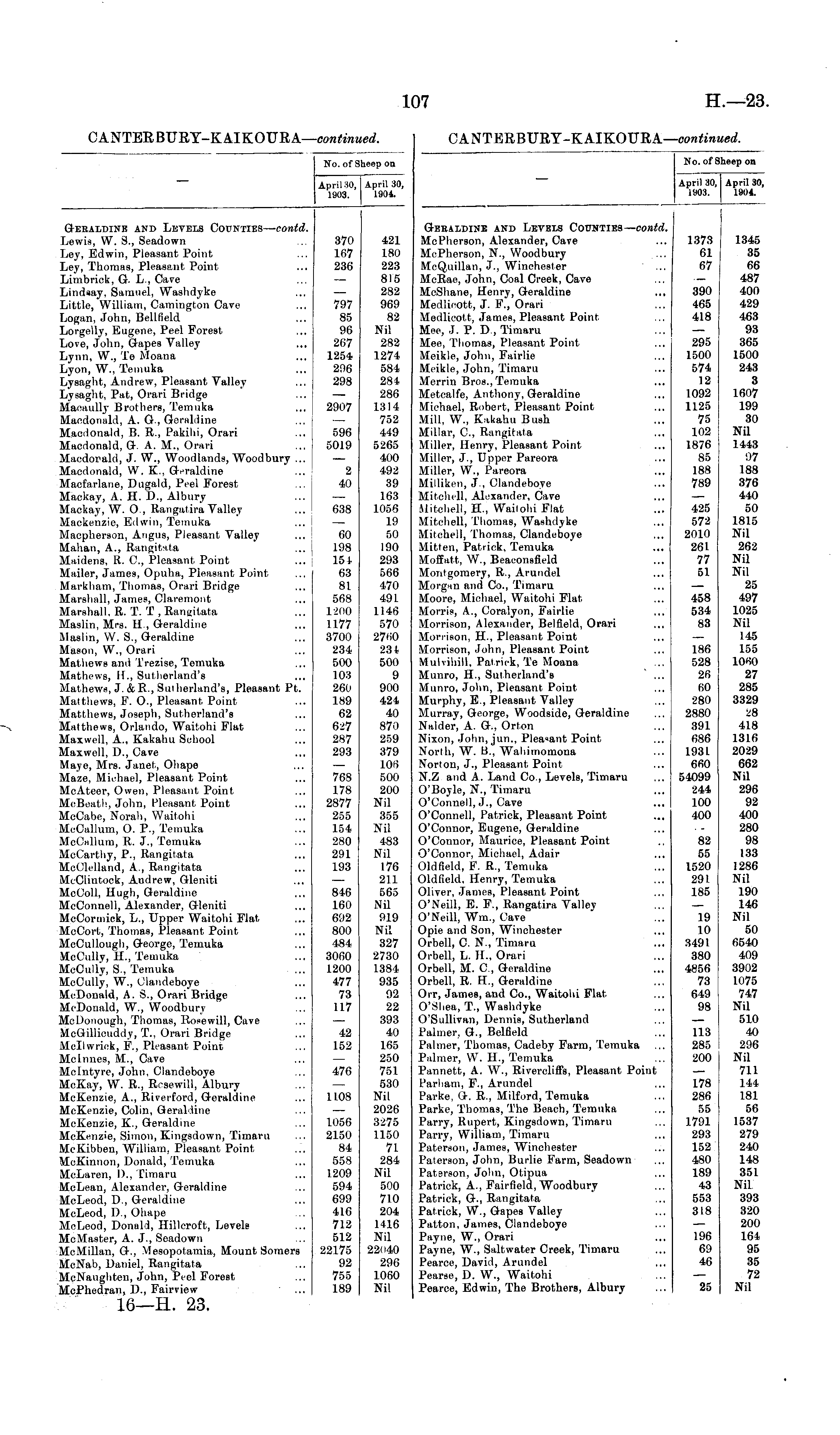 No. of Sheep on April 30, April 30, 1903. 1904. Geraldine and Levels Counties — contd. Lewis, W. S., Seadown Ley, Edwin, Pleasant Point Ley, Thomas, Pleasant Point Limbrick, G. L., Cave Lindsay, Samuel, Washdyke Little, William, Camington Cave Logan, John, Bellfield Lorgelly, Eugene, Peel Forest Love, John, Gapes Valley Lynn, W., Te Moana Lyon, W., Temuka Lysaght, Andrew, Pleasant Valley Lysaght, Pat, Orari Bridge Maeaully Brothers, Temuka Macdonald, A. G, Geraldine Macdonald, B. R., Pakihi, Orari Macdonald, G. A. M., Orari Macdorald, J. W., Woodlands, Woodbury ... Macdonald, W. K, Geraldine Maefarlane, Dugald, Peel Forest Mackay, A. H. D., Albury Mackay, W. O, Rangatira Valley Mackenzie, Edwin, Temuka Macpherson, Angus, Pleasant Valley Mahan, A., Rangitata Maidens, R. O, Pleasant Point Mailer, James, Opuha, Pleasant Point Markham, Thomas, Orari Bridge Marshall, James, Claremont Marshall. R. T. T , Rangitata Maslin, Mrs. II., Geraldine Maslin, W. S., Geraldine Mason, W., Orari Mathews and Trezise, Temuka Mathews, H., Sutherland's Mathews, J. &R., Sutherland's, Pleasant Pt. Matthews, F. O., Pleasant Point Matthews, Joseph, Sutherland's Matthews, Orlando, Waitohi Flat Maxwell, A., Kakahu School Maxwell, D., Cave Maye, Mrs. Janet, Ohape Maze, Michael, Pleasant Point McAteer, Owen, Pleasant Point McBeath, John, Pleasant Point McCabe, Norah, Waitohi McCallum, O. P., Temuka McCallum, R. J., Temuka McCarthy, P., Rangitata McClelland, A., Rangitata McClintock, Andrew, Gleniti McColl, Hugh, Geraldine McConnell, Alexander, Gleniti McCormick, L., Upper Waitohi Flat McCort, Thomas, Pleasant Point McCullough, George, Temuka McCully, H., Temuka McCully, S., Temuka McCully, W., Clandeboye McDonald, A. S., Orari Bridge McDonald, W., Woodbury McDonough, Thomas, Rosewill, Cave McGillicuddy, T\, Orari Bridge Mcllwrick, F., Pleasant Point Mclnnes, M., Cave Mclntyre, John, Clandeboye McKay, W. R., Rosewill, Albury McKenzie, A., Riverford, Geraldine McKenzie, Colin, Geraldine McKenzie, K, Geraldine McKenzie, Simon, Kingsdown, Timaru McKibben, William, Pleasant Point McKinnon, Donald, Temuka McLaren, I)., Timaru McLean, Alexander, Geraldine McLeod, D., Geraldine McLeod, D., Ohape McLeod, Donald, Hillcroft, Levels McMaster, A. J., Seadown McMillan, G., Mesopotamia, Mount Somers McNab, Daniel, Rangitata McNaughten, John, Peel Forest McPhedran, D., Fairview 370 167 236 797 85 96 267 1254 296 298 2907 596 5019 2 40 638 60 198 154 63 81 568 1200 1177 3700 234 500 103 260 189 62 627 287 293 421 180 223 815 282 969 82 Nil 282 1274 584 284 286 1314 752 449 5265 400 492 39 163 1056 19 50 190 293 566 470 491 1146 570 2760 231 500 9 900 424 40 870 259 379 106 500 200 Nil 355 Nil 483 Nil 176 211 565 Nil 919 Nil 327 2730 1384 935 92 22 393 40 165 250 751 530 Nil 2026 3275 1150 71 284 Nil 500 710 204 1416 Nil 22040 296 1060 Nil 768 178 2877 255 154 280 291 193 846 160 692 800 484 3060 1200 477 73 117 42 152 476 1108 1056 2150 84 558 1209 594 699 416 712 512 22175 92 755 189