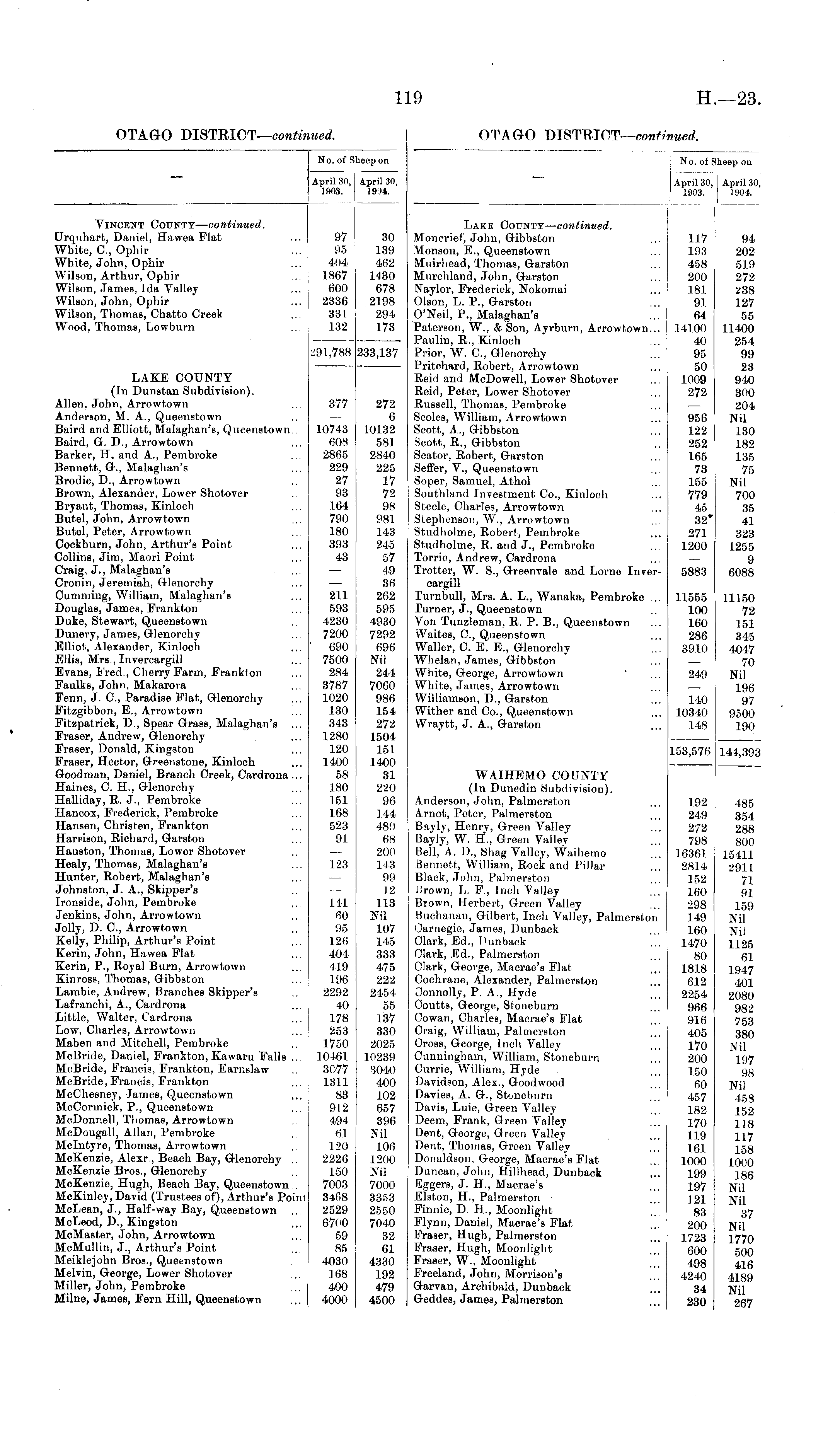 No. of F April 30, 1903. Iheep on I April 30, 1904. Lake County— continued. Moncrief, John, Gibbston Monson, E., Queenstown Muirhead, Thomas, Garston Murchland, John, Garston Naylor, Frederick, Nokomai Olson, L. P., Garston O'Neil, P., Malaghan's Paterson, W., & Son, Ayrburn, Arrowtown... Paulin, R., Kinloch Prior, W. C, Glenorchy Pritchard, Robert, Arrowtown Reid and McDowell, Lower Shotover Reid, Peter, Lower Shotover Russell, Thomas, Pembroke Scoles, William, Arrowtown Scott, A., Gibbston Scott, R., Gibbston Seator, Robert, Garston Seffer, V., Queenstown Soper, Samuel, Athol Southland Investment Co., Kinloch Steele, Charles, Arrowtown Stephenson, W., Arrowtown Studholme, Robert, Pembroke Studholme, R. and J., Pembroke Torrie, Andrew, Cardrona Trotter, W. S., Greenvale and Lome Invercargill Turnbull, Mrs. A. L., Wanaka, Pembroke ... Turner, J., Queenstown Von Tunzleman, R. P. B., Queenstown iVaites, C, Queenstown Waller, C. E. E., Glenorchy Whelan, James, Gibbston White, George, Arrowtown White, James, Arrowtown Williamson, D., Garston Wither and Co., Queenstown Wraytt, J. A., Garston 117 103 458 200 181 91 64 14100 40 95 50 1009 272 956 122 252 165 73 155 779 45 32* 271 1200 94 202 519 272 238 127 55 11400 254 99 23 940 300 204 Nil 130 182 135 75 Nil 700 35 4.1 323 1255 9 6088 5883 11555 100 160 286 3910 11150 72 151 345 4047 70 Nil 196 97 9500 190 249 140 10340 148 153,576 144,393 WAIHEMO COUNTY (In Dunedin Subdivision). Anderson, John, Palmerston Arnot, Peter, Palmerston Bayly, Henry, Green Valley Bayly, W. H., Green Valley Bell, A. D., Shag Valley, Waihemo Bennett, William, Rock and Pillar Black, John, Palmerston Brown, L. F., Inch Valley Brown, Herbert, Green Valley Buchanan, Gilbert, Inch Valley, Palmerston Carnegie, James, Dunback Clark, Ed., Dunback Clark, Ed., Palmerston Clark, George, Macrae's Flat Cochrane, Alexander, Palmerston Connolly, P. A., Hyde Coutts, George, Stoneburn Cowan, Charles, Macrae's Flat Craig, William, Palmerston Cross, George, Inch Valley Cunningham, William, Stoneburn Currie, William, Hyde Davidson, Alex., Goodwood DavieB, A. G., Stoneburn Davis, Luie, Green Valley Deem, Frank, Green Valley Dent, George, Green Valley Dent, Thomas, Green Valley Donaldson, George, Macrae's Flat Duncan, John, Billhead, Dunback Eggers, J. H., Macrae's Elston, H., Palmerston Finnie, D. H., Moonlight Flynn, Daniel, Macrae's Flat Fraser, Hugh, Palmerston Fraser, Hugh, Moonlight Fraser, W., Moonlight Freeland, John, Morrison's Garvan, Archibald, Dunback Geddes, James, Palmerston 192 249 272 798 16361 2811 152 160 298 149 160 1470 80 1818 612 2254 966 916 405 170 200 150 60 457 182 170 119 161 1000 199 197 121 83 200 1723 600 498 4240 34 230 485 354 288 800 15411 2911 71 91 159 Nil Nil 1125 61 1947 401 2080 982 753 380 Nil 197 98 Nil 45S 152 118 117 158 1000 186 Nil Nil 37 Nil 1770 500 416 4189 Nil 267
