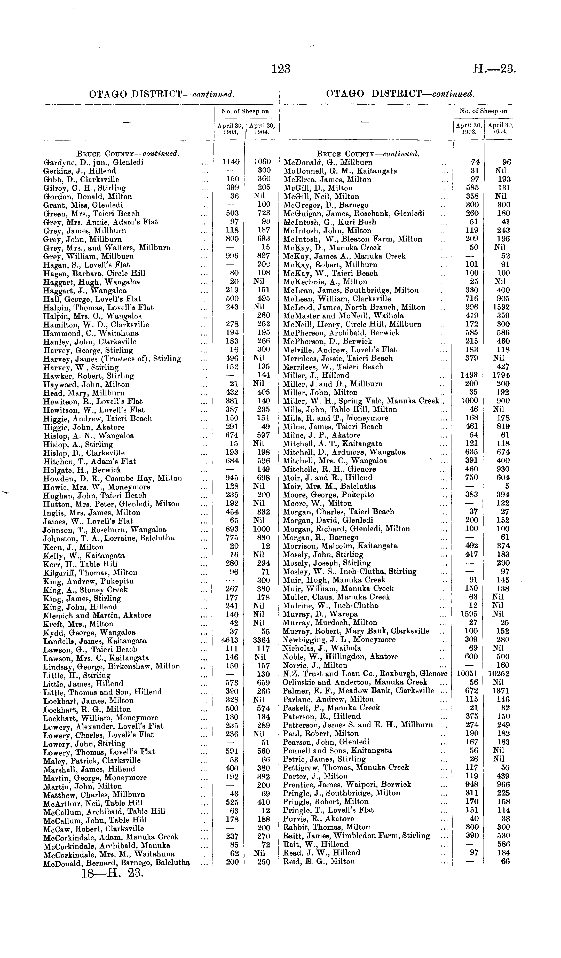 No. of Sheep on April 30, April 30, 1903. 1904. Bruce County— continued-. Gardyne, D., jun., Glenledi Gerkins, J., Hillend Gibb, D., Clarksville Gilroy, G. H., Stirling Gordon, Donald, Milton Grant, Miss, Glenledi Green, Mrs., Taieri Beach Grey, Mrs. Annie, Adam's Flat Grey, James, Millburn Grey, John, Millburn Grey, Mrs., and Walters, Millburn Grey, William, Millburn Hagan, S., Lovell's Flat Hagen, Barbara, Circle Hill Haggart, Hugh, Wangaloa Haggart, J., Wangaloa Hall, George, Lovell's Flat Halpin, Thomas, Lovell's Flat Halpin, Mrs. C, Wangaloa Hamilton, W. D., Clarksville Hammond, C, Waitahuna Hanley, John, Clarksville Harvey, George, Stirling Harvey, James (Trustees of), Stirling Harvey, W., Stirling Hawker, Robert, Stirling Hayward, John, Milton Head, Mary, Millburn Hewitson, R., Lovell's Flat Hewitson, W., Lovell's Flat Higgie, Andrew, Taieri Beach Higgie, John, Akatore Hislop, A. N., Wangaloa Hislop, A., Stirling Hislop, D., Clarksville Hitchen, T., Adam's Flat Holgate, H., Berwick Howden, D. R., Coombe Hay, Milton Howie, Mrs. W., Moneymore Hughan, John, Taieri Beach Hutton, Mrs. Peter, Glenledi, Milton Inglis, Mrs. James, Milton James, W., Lovell's Flat Johnson, T., Roseburn, Wangaloa Johnston, T. A., Lorraine, Balclutha Keen, J., Milton Kelly, W, Kaitangata Kerr, H., Table H ill Kilgariff, Thomas, Milton King, Andrew, Pukepitu King, A., Stoney Creek King, James, Stirling King, John, Hillend Klemich and Martin, Akatore Kreft, Mrs., Milton Kydd, George, Wangaloa Landells, James, Kaitangata Lawson, G., Taieri Beach Lawson, Mrs. C, Kaitangata Lindsay, George, Birkenshaw, Milton Little, H., Stirling Little, James, Hillend Little, Thomas and Son, Hillend Lockhart, James, Milton Lockhart, R. G., Milton Lockhart, William, Moneymore Lowery, Alexander, Lovell's Flat Lowery, Charles, Lovell's Flat Lowery, John, Stirling Lowery, Thomas, Lovell's Flat Maley, Patrick, Clarksville Marshall, James, Hillend Martin, George, Moneymore Martin, John, Milton Matthew, Charles, Millburn McArthur, Neil, Table Hill McCallum, Archibald, Table Hill McCallum, John, Table Hill McCaw, Robert, Clarksville MeCorkindale, Adam, Manuka Creek MeCorkindale, Archibald, Manuka MeCorkindale, Mrs. M., Waitahuna McDonald, Bernard, Barnego, Balclutha 1140 150 399 36 503 97 118 800 996 80 20 210 500 243 278 194 183 16 496 152 21 432 381 387 150 291 674 15 193 684 945 128 235 192 454 65 893 775 20 16 280 96 1060 300 360 205 Nil 100 723 90 187 693 15 897 200 108 Nil 151 495 Nil 260 252 195 266 300 Nil 135 144 Nil 405 140 235 151 49 597 Nil 198 596 149 698 Nil 200 Nil 332 Nil 1000 880 12 Nil 294 71 300 380 178 Nil Nil Nil 55 3364 117 Nil 157 130 659 266 Nil 574 134 289 Nil 51 560 66 380 382 200 69 410 12 188 200 270 72 Nil 250 267 177 241 1 10 42 37 4613 111 146 150 573 3H0 328 500 130 235 236 591 53 400 192 43 525 63 178 237 85 62 200