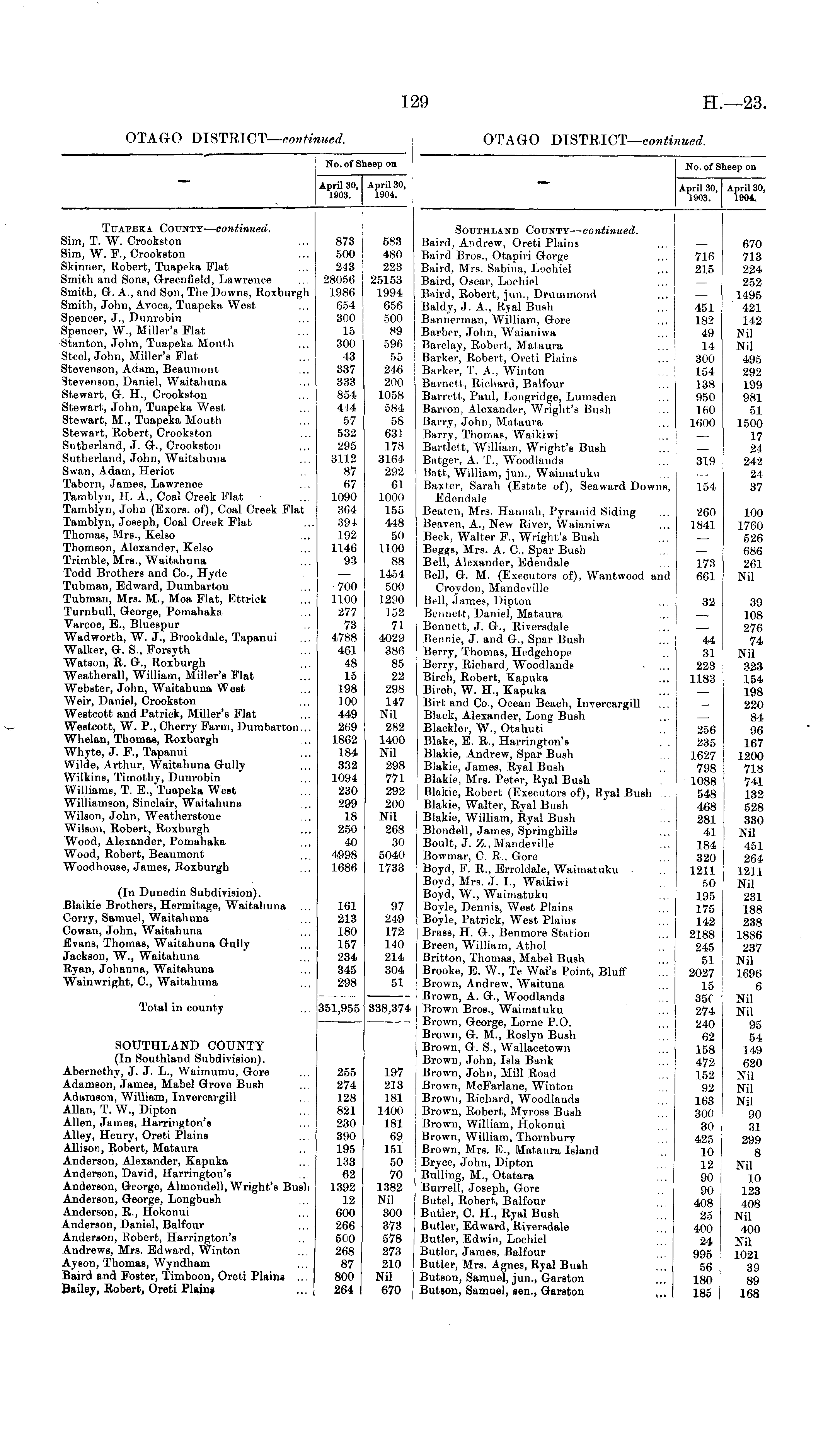 No. of Sheep on April 30, April 30, 1903. 1904. Southland County— continued. Baird, Andrew, Oreti Plains Baird Bros., Otapiri Gorge Baird, Mrs. Sabina, Lochiel Baird, Oscar, Lochiel Baird, Robert, jun., Drummond Baldy, J. A., Ryal Bush Banuermai], William, Gore Barber, John, Waianiwa Barclay, Robert, Mataura Barker, Robert, Oreti Plains Barker, T. A., Winton Barnett, Richard, Balfour Barrett, Paul, Longridge, Lumsden Barron, Alexander, Wright's Bush Barry, John, Mataura Barry, Thomas, Waikiwi Bartlett, William, Wright's Bush Batger, A. T., Woodlands Batt, William, jun., Waimatuku Baxter, Sarah (Estate of), Seaward Downs, Edendale Beaten, Mrs. Hannah, Pyramid Siding Beaven, A., New River, Waianiwa Beck, Walter F., Wright's Bush Beggs, Mrs. A. C., Spar Bush Bell, Alexander, Edendale Bell, G. M. (Executors of), Wantwood and Croydon, Mandeville Bell, James, Dipton Bennett, Daniel, Mataura Bennett, J. G., Riversdale Bennie, J. and G., Spar Bush Berry, Thomas, Hedgehope Berry, Richard, Woodlands , ... Birch, Robert, Kapuka Birch, W. H., Kapuka Birt and Co., Ocean Beach, Invercargill Black, Alexander, Long Bush Blackler, W., Otahuti Blake, E. R., Harrington's Blakie, Andrew, Spar Bush Blakie, James, Ryal Bush Blakie, Mrs. Peter, Ryal Bush Blakie, Robert (Executors of), Ryal Bush ... Blakie, Walter, Ryal Bush Blakie, William, Ryal Bush Bloiidell, James, Springhills Boult, J. Z., Mandeville Bowmar, C. R., Gore Boyd, F. R., Erroldale, Waimatuku . Boyd, Mrs. J. I., Waikiwi Boyd, W., Waimatuku Boyle, Dennis, West Plains Boyle, Patrick, West Plains Brass, H. G., Benmore Station Breen, William, Athol Britton, Thomas, Mabel Bush Brooke, E. W., Te Wai's Point, Bluff Brown, Andrew, Waituna Brown, A. G., Woodlands Brown Bros., Waimatuku Brown, George, Lome P.O. Brown, G. M., Roslyn Bush Brown, G. S., Wallaeetown Brown, John, Isla Bank Brown, John, Mill Road Brown, McFarlane, Winton Brown, Richard, Woodlands Brown, Robert, Myross Bush Brown, William, Hokonui Brown, William, Thornbury Brown, Mrs. E., Mataura Island Bryce, John, Dipton Bulling, M., Otatara Burrell, Joseph, Gore Butel, Robert, Balfour Butler, C. H., Ryal Bush Butler, Edward, Riversdale Butler, Fjdwin, Lochiel Butler, James, Balfour Butler, Mrs. Agnes, Ryal Bush Butson, Samuel, jun., Garston Butson, Samuel, sen., Garston ,,, 716 215 451 182 49 14 300 154 138 950 160 1600 319 154 260 1841 173 661 32 44 31 223 1183 256 235 1627 798 1088 548 468 281 41 184 320 1211 50 195 175 142 2188 245 51 2027 15 35f 274 240 62 158 472 152 92 163 300 30 425 10 12 90 90 408 25 400 24 995 56 180 185 670 713 224 252 1495 421 142 Nil Nil 495 292 199 981 51 1500 17 24 242 24 37 100 1760 526 686 261 Nil 39 108 276 74 Nil 323 154 198 220 84 96 167 1200 718 741 132 528 330 Nil 451 264 1211 Nil 231 188 238 1886 237 Nil 1696 6 Nil Nil 95 54 149 620 Nil Nil Nil 90 31 299 8 Nil 10 123 408 Nil 400 Nil 1021 39 89 168