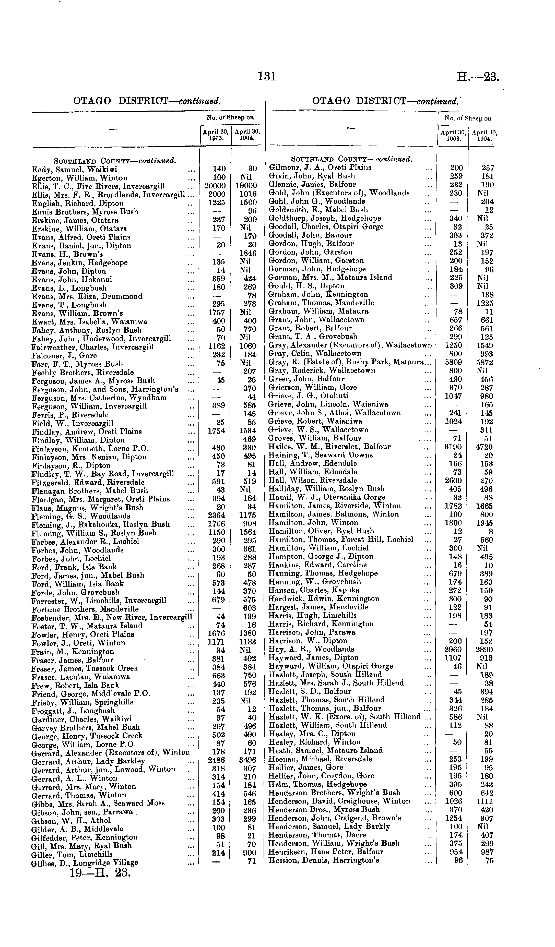 No. of Sheep on April 30, 1903. April 30, 1904. Southland County— continued. Gilmour, J. A., Oreti Plains Givin, John, Ryal Bush Glennie, James, Balfour Gobi, John (Executors of), Woodlands Gohl, John G., Woodlands Goldsmith, E., Mabel Bush Goldthorp, Joseph, Hedgehope Goodall, Charles, Otapiri Gorge Goodall, John, Balfour Gordon, Hugh, Balfour Gordon, John, Garston Gordon, William, Garston Gorman, John, Hedgehope Gorman, Mrs. M., Mataura Island Gould, H. S., Dipton Graham, John, Kennington Graham, Thomas, Mandeville Graham, William, Mataura Grant, John, Wallaeetown Grant, Robert, Balfour Grant, T. A , Grovebush Gray, Alexander (Executors of), Wallaeetown Gray, Colin, Wallaeetown Gray, R. (Estate of), Bushy Park, Mataura... Gray, Roderick, Wallaeetown Greer, John, Balfour Grierson, William, Gore Grieve, J. G, Otahuti Grieve, John, Lincoln, Waianiwa Grieve, John 8., Athol, Wallaeetown Grieve, Robert, Waianiwa Grieve, W. S., Wallaeetown Groves, William, Balfour , ... Hailes, W. M., Riverslea, Balfour Haining, T., Seaward Downs Hall, Andrew, Edendale Hall, William, Edendale Hall, Wilson, Riversdale Halliday, William, Roslyn Bush Hamil, W. J., Oteramika Gorge Hamilton, James, Riverside, Winton Hamilton, James, Balmona, Winton Hamilton, John, Winton Hamilton, Oliver, Ryal Bush Hamilton, Thomas, Forest Hill, Lochiel Hamilton, William, Lochiel Hampton, George J., Dipton Hankins, Edward, Caroline Hanning, Thomas, Hedgehope Hanning, W., Grovebush Hansen, Charles, Kapuka Hardwick, Edwin, Kennington Hargest, James, Mandeville Harris, Hugh, Limehills Harris, Richard, Kennington Harrison, John, Parawa Harrison, W., Dipton Hay, A. R., Woodlands Hayward, James, Dipton Hayward, William, Otapiri Gorge Hazlett, Joseph, South Hillend Hazlett, Mrs. Sarah J., South Hillend Hazlett, S. D., Balfour Hazlett, Thomas, South Hillend Hazlett, Thomas, jun., Balfour Hazlett, W. K. (Exors. of), South Hillend ... Hazlett, William, South Hillend Healey, Mrs. C, Dipton Healey, Richard, Winton Heath, Samuel, Mataura Island Heenan, Michael, Riversdale Hellier, James, Gore Hellier, John, Croydon, Gore Helm, Thomas, Hedgehope Henderson Brothers, Wright's Bush Henderson, David, Craighouse, Winton Henderson Bros., Myross Bush Henderson, John, Craigend, Brown's Henderson, Samuel, Lady Barkly Henderson, Thomas, Dacre Henderson, William, Wright's Bush Henriksen, Hans Peter, Balfour Hession, Dennis, Harrington's 200 259 232 230 340 32 393 13 252 200 184 225 309 78 657 266 299 1250 800 5809 800 490 370 1047 241 1024 71 3190 24 166 73 2600 405 32 1782 100 1800 12 27 300 148 16 679 174 272 300 122 198 257 181 190 Nil 204 12 Nil 25 372 Nil 197 152 96 Nil Nil 138 1225 11 661 561 125 1549 993 5872 Nil 456 287 980 165 145 192 311 51 4720 20 153 59 270 496 88 1665 800 1945 8 560 Nil 495 10 389 163 150 90 91 183 54 197 152 2890 913 Nil 189 38 394 285 184 Nil 88 20 81 55 199 95 180 243 642 1111 420 907 Nil 407 299 987 75 200 2960 1107 46 45 344 326 586 112 50 253 195 195 395 600 1026 370 1254 100 174 375 954 96