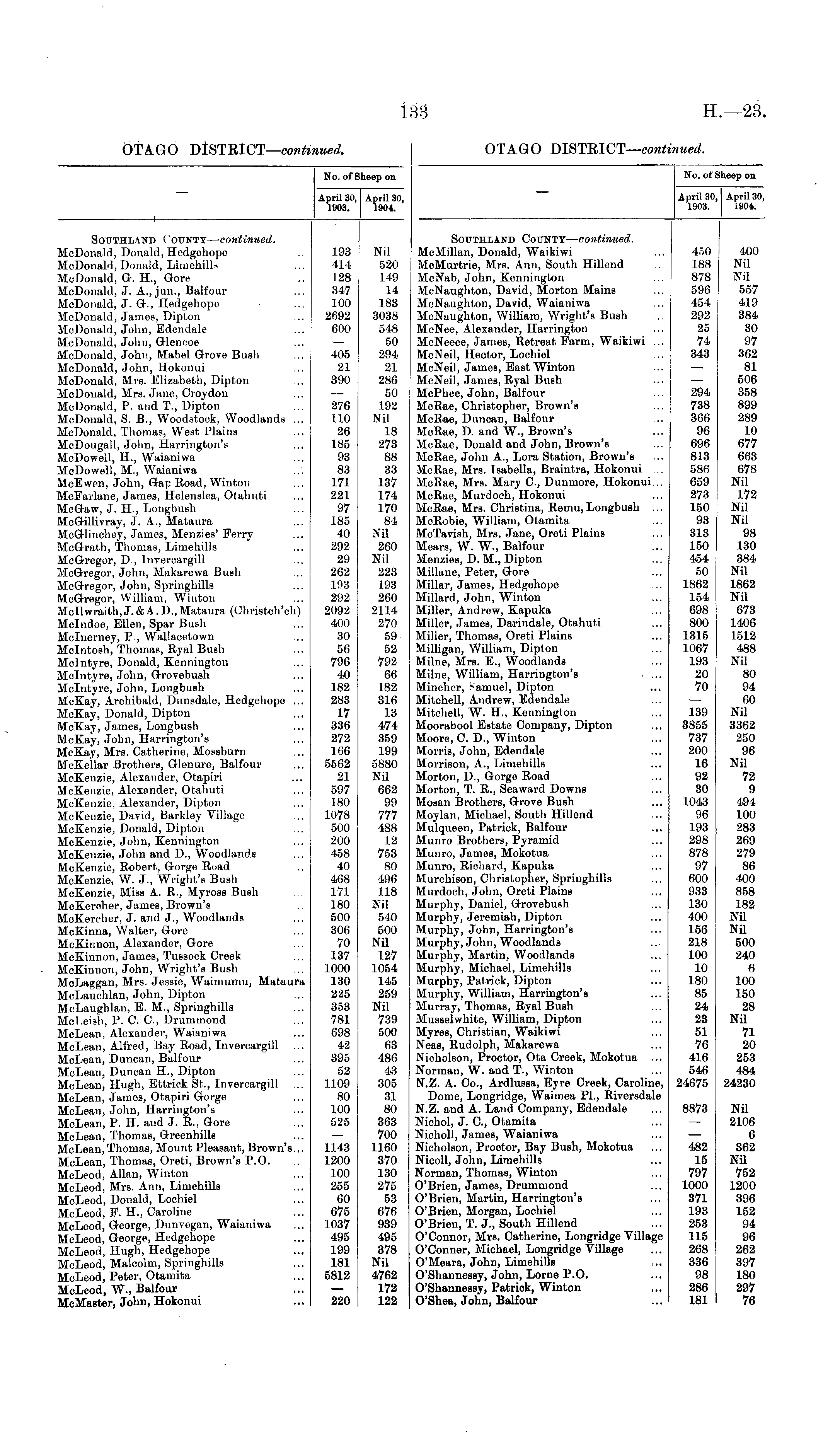 No. of Sheep on April 30, April 30, 1903. 1904. Southland County— continued. McMillan, Donald, Waikiwi McMurtrie, Mrs. Ann, South Hillend McNab, John, Kennington McNaughton, David, Morton Mains McNaughton, David, Waianiwa McNaughton, William, Wright's Bush MeNee, Alexander, Harrington McNeece, James, Retreat Farm, Waikiwi ... McNeil, Hector, Lochiel McNeil, James, East Winton McNeil, James, Ryal Bush McPhee, John, Balfour McRae, Christopher, Brown's McRae, Duncan, Balfour McRae, D. and W., Brown's McRae, Donald and John, Brown's McRae, John A., Lora Station, Brown's McRae, Mrs. Isabella, Braintra, Hokonui ... McRae, Mrs. Mary C, Dunmore, Hokonui... McRae, Murdoch, Hokonui McRae, Mrs. Christina, Remu,Longbush ... McRobie, William, Otamita McTavish, Mrs. Jane, Oreti Plains Mears, W. W., Balfour Menzies, D. M., Dipton Millane, Peter, Gore Millar, James, Hedgehope Millard, John, Winton Miller, Andrew, Kapuka Miller, James, Darindale, Otahuti Miller, Thomas, Oreti Plains Milligan, William, Dipton Milne, Mrs. E., Woodlands Milne, William, Harrington's . ... Mincher, Samuel, Dipton Mitchell, Andrew, Edendale Mitchell, W. H., Kennington Moorabool Estate Company, Dipton Moore, C. D., Winton Morris, John, Edendale Morrison, A., Limehills Morton, D, Gorge Road Morton, T. R., Seaward Downs Mosan Brothers, Grove Bush Moylan, Michael, South Hillend Mulqueen, Patrick, Balfour Munro Brothers, Pyramid Munro, James, Mokotua Munro, Richard, Kapuka Murchison, Christopher, Springhills Murdoch, John, Oreti Plains Murphy, Daniel, Grovebush Murphy, Jeremiah, Dipton Murphy, John, Harrington's Murphy, John, Woodlands Murphy, Martin, Woodlands Murphy, Michael, Limehills Murphy, Patrick, Dipton Murphy, William, Harrington's Murray, Thomas, Ryal Bush Mussel white, William, Dipton Myres, Christian, Waikiwi Neas, Rudolph, Makarewa Nicholson, Proctor, Ota Creek, Mokotua ... Norman, W. and T., Winton N.Z. A. Co., Ardlussa, Byre Creek, Caroline, Dome, Longridge, Waimea PL, Riversdale N.Z. and A. Land Company, Edendale Nichol, J. C, Otamita Nicholl, James, Waianiwa Nicholson, Proctor, Bay Bush, Mokotua Nicoll, John, Limehills Norman, Thomas, Winton O'Brien, James, Drummond O'Brien, Martin, Harrington's O'Brien, Morgan, Lochiel O'Brien, T. J., South Hillend O'Connor, Mrs. Catherine, Longridge Village O'Connor, Michael, Longridge Village O'Meara, John, Limehills O'Shannessy, John, Lome P.O. O'Shannessy, Patrick, Winton O'Shea, John, Balfour 450 188 878 596 454 292 25 74 343 294 738 366 96 696 813 586 659 273 150 93 313 150 454 50 1862 154 698 800 1315 1067 193 20 70 139 3855 737 200 16 92 30 1043 96 193 298 878 97 600 933 130 400 156 218 100 10 180 85 24 23 51 76 416 546 24675 400 Nil Nil 557 419 384 30 97 362 81 506 358 899 289 10 677 663 678 Nil 172 Nil Nil 98 130 384 Nil 1862 Nil 673 1406 1512 488 Nil 80 94 60 Nil 3362 250 96 Nil 72 9 494 100 283 269 279 86 400 858 182 Nil Nil 500 240 6 100 150 28 Nil 71 20 253 484 24230 8873 Nil 2106 6 362 Nil 752 1200 396 152 94 96 262 397 180 297 76 482 15 797 1000 371 193 253 115 268 336 98 286 181