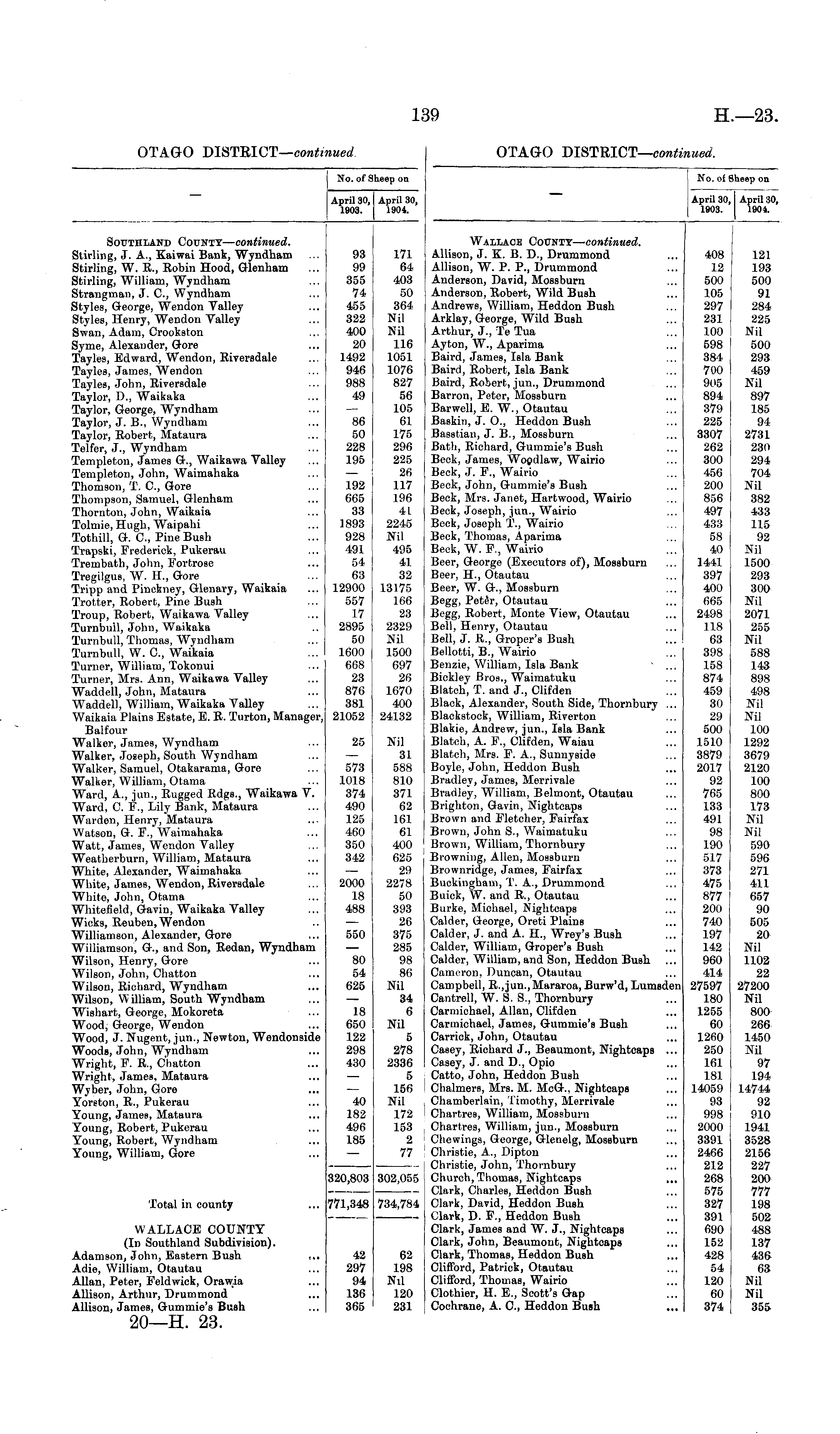 No. of Sheep on April 30, April 30, 1903. 1904. Wallace County— continued. Allison, J. K. B. D., Drummond Allison, W. P. P., Drummond Anderson, David, Mossburn Anderson, Robert, Wild Bush Andrews, William, Heddon Bush Arklay, George, Wild Bush Arthur, J., Te Tua Ayton, W., Aparima Baird, James, Isla Bank Baird, Robert, Isla Bank Baird, Robert, jun., Drummond Barron, Peter, Mossburn Barwell, E. W., Otautau Baskin, J. O., Heddon Bush Basstian, J. B., Mossburn Bath, Richard, Gummie's Bush Beck, James, Woodlaw, Wairio Beck, J. F., Wairio Beck, John, Gummie's Bush Beck, Mrs. Janet, Hartwood, Wairio Beck, Joseph, jun., Wairio Beck, Joseph T., Wairio Beck, Thomas, Aparima Beck, W. F., Wairio Beer, George (Executors of), Mossburn Beer, H., Otautau Beer, W. G., Mossburn Begg, Peter, Otautau Begg, Robert, Monte View, Otautau Bell, Henry, Otautau Bell, J. R., Groper's Bush Bellotti, B., Wairio Benzie, William, Isla Bank ' ... Bickley Bros., Waimatuku Blatch, T. and J., Clifden Black, Alexander, South Side, Thombury ... Blackstock, William, Riverton Blakie, Andrew, jun., Isla Bank Blatch, A. F., Clifden, Waiau Blatch, Mrs. F. A., Sunnyside Boyle, John, Heddon Bush Bradley, James, Merrivale Bradley, William, Belmont, Otautau Brighton, Gavin, Nightcaps Brown and Fletcher, Fairfax Brown, John S., Waimatuku Brown, William, Thornbury Browning, Allen, Mossburn Brownridge, James, Fairfax Buckingham, T. A., Drummond Buick, W. and R., Otautau Burke, Michael, Nightcaps Calder, George, Oreti Plains Calder, J. and A. H., Wrey's Bush Calder, William, Groper's Bush Calder, William, and Son, Heddon Bush Cameron, Duncan, Otautau Campbell, R.,jun.,Mararoa, Burw'd, Lumsden Cantrell, W. S. S., Thornbury Carmichael, Allan, Clifden Carmichael, James, Gummie's Bush Carrick, John, Otautau Casey, Richard J., Beaumont, Nightcaps ... Casey, J. and D., Opio Catto, John, Heddon Bush Chalmers, Mrs. M. McG., Nightcaps Chamberlain, Timothy, Merrivale Chartres, William, Mossburn Chartres, William, jun., Mossburn Chewings, George, Glenelg, Mossburn Christie, A., Dipton Christie, John, Thornbury Church, Thomas, Nightcaps Clark, Charles, Heddon Bush Clark, David, Heddon Bush Clark, D. F., Heddon Bush Clark, James and W. J., Nightcaps Clark, John, Beaumont, Nightcaps Clark, Thomas, Heddon Bush Clifford, Patrick, Otautau Clifford, Thomas, Wairio Clothier, H. E., Scott's Gap Cochrane, A. C, Heddon Bush 408 12 500 105 297 231 100 598 384 700 905 894 379 225 3307 262 300 456 200 856 497 433 58 40 1441 397 400 665 2498 118 63 398 158 874 459 30 29 500 1510 3879 2017 92 765 133 491 98 190 517 373 475 877 200 740 197 142 960 414 27597 180 1255 60 1260 250 161 181 14059 93 998 2000 3391 2466 212 268 575 327 391 690 152 428 54 120 60 374 121 193 500 91 284 225 Nil 500 293 459 Nil 897 185 94 2731 230 294 704 Nil 382 433 115 92 Nil 1500 293 300 Nil 2071 255 Nil 588 143 898 498 Nil Nil 100 1292 3679 2120 100 800 173 Nil Nil 590 596 271 411 657 90 505 20 Nil 1102 22 27200 Nil 800 266 1450 Nil 97 194 14744 92 910 1941 3528 2156 227 200 777 198 502 488 137 436 63 Nil Nil 355