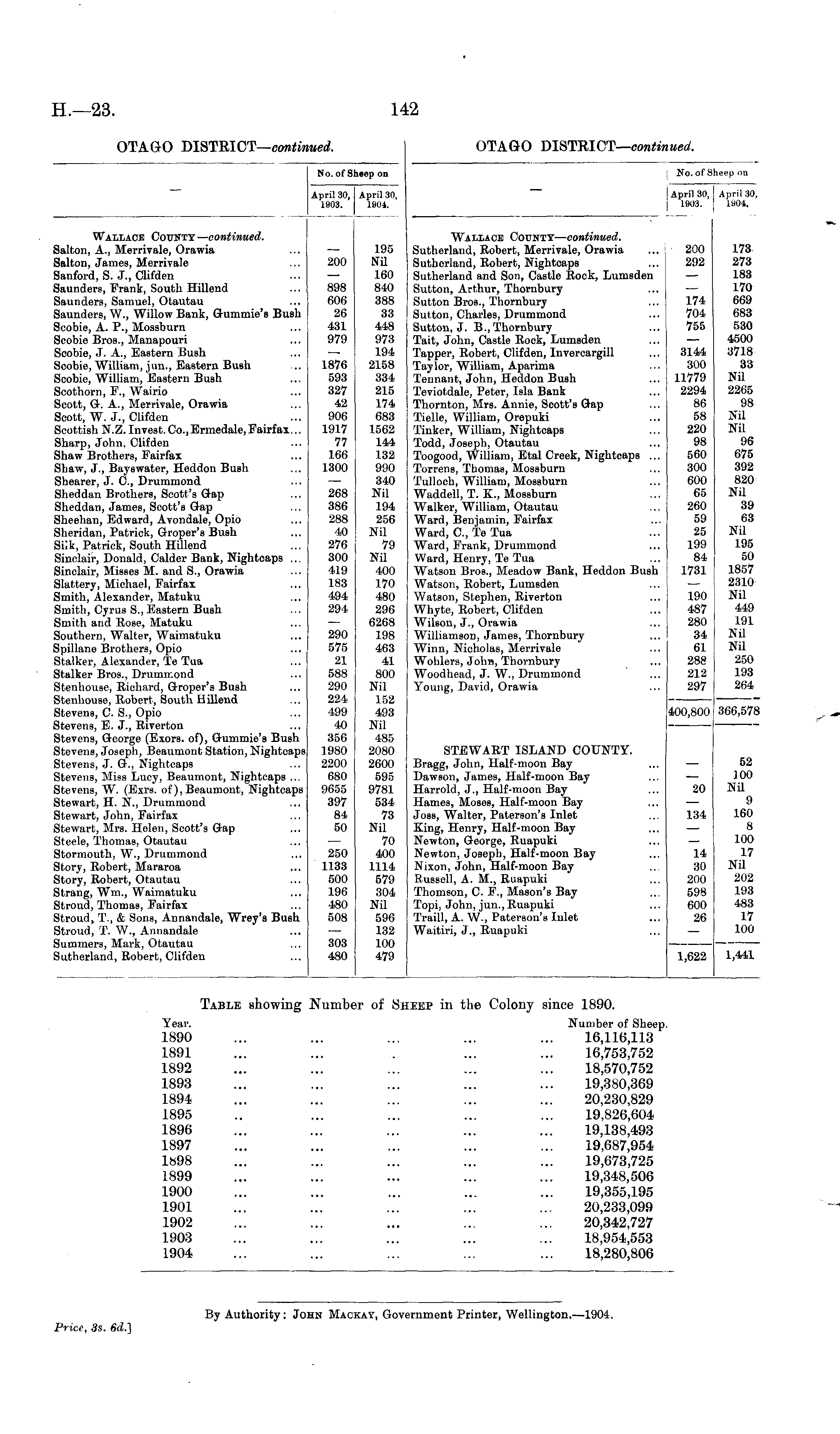 No. of Sheep on April 30, i 1903. April 30, | 1904. Wallace County— continued. Sutherland, Robert, Merrivale, Orawia Sutherland, Robert, Nightcaps Sutherland and Son, Castle Rock, Lumsden Sutton, Arthur, Thornbury Sutton Bros., Thornbury Sutton, Charles, Drummond Sutton, J. B., Thornbury Tait, John, Castle Rock, Lumsden Tapper, Robert, Clifden, Invercargill Taylor, William, Aparima Tennant, John, Heddon Bush Teviotdale, Peter, Isla Bank Thornton, Mrs. Annie, Scott's Gap Tielle, William, Orepuki Tinker, William, Nightcaps Todd, Joseph, Otautau Toogood, William, Etal Creek, Nightcaps ... Torrens, Thomas, Mossburn Tulloch, William, Mossburn Waddell, T. K., Mossburn Walker, William, Otautau Ward, Benjamin, Fairfax Ward, C, Te Tua Ward, Frank, Drummond Ward, Henry, Te Tua Watson Bros., Meadow Bank, Heddon Bush Watson, Robert, Lumsden Watson, Stephen, Riverton Whyte, Robert, Clifden Wilson, J., Orawia Williamson, James, Thornbury Winn, Nicholas, Merrivale Wohlers, John, Thornbury Woodhead, J. W., Drummond Young, David, Orawia 200 292 174 704 755 3144 300 11779 2294 86 58 220 98 560 300 600 65 260 59 25 199 84 1731 173 273 183 170 669 683 530 4500 3718 33 Nil 2265 98 Nil Nil 96 675 392 820 Nil 39 63 Nil 195 50 1857 2310 Nil 449 191 Nil Nil 250 193 264 190 487 280 34 61 288 212 297 400,800 366,578 STEWART ISLAND COUNTY. Bragg, John, Half-moon Bay Dawson, James, Half-moon Bay Harrold, J., Half-moon Bay Hames, Moses, Half-moon Bay Joss, Walter, Paterson's Inlet King, Henry, Half-moon Bay Newton, George, Ruapuki Newton, Joseph, Half-moon Bay Nixon, John, Half-moon Bay Russell, A. M., Ruapuki Thomson, C. F., Mason's Bay Topi, John, jun., Ruapuki Traill, A. W., Paterson's Inlet Waitiri, J., Ruapuki 20 134 52 100 Nil 9 160 8 100 17 Nil 202 193 483 17 100 14 30 200 598 600 26 1,622 1,441