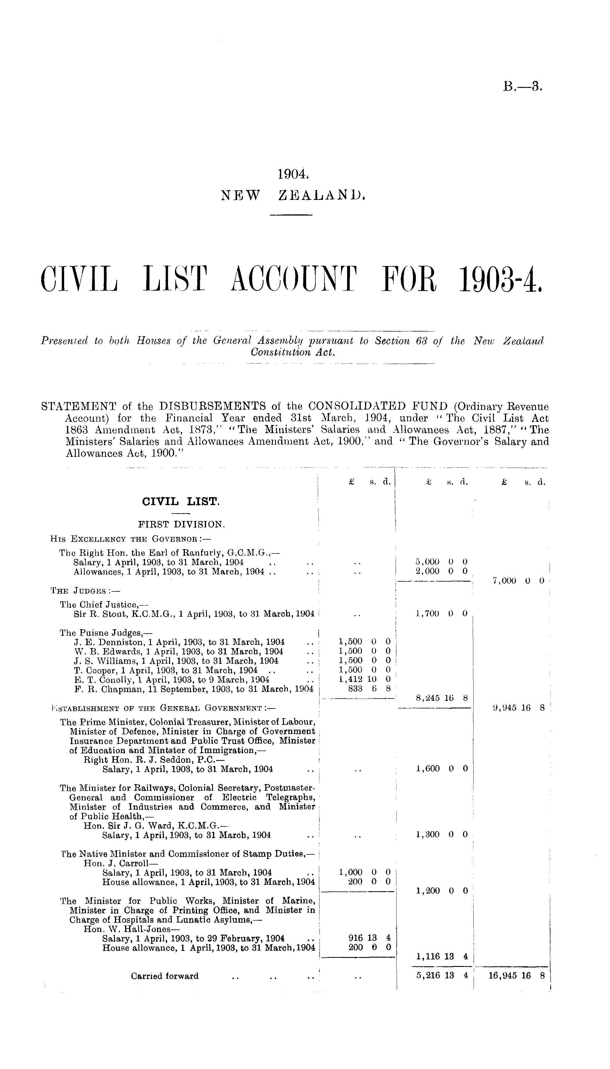 £ s. d. £ s. d. £ s. d. CIVIL LIST. FIRST DIVISION. His Excellency the Governor: — The Bight Hon. the Earl of Ranfurly, G.C.M.G.,— Salary, 1 April, 1903, to 31 Maroh, 1904 Allowances, 1 April, 1903, to 31 March, 1904 5,000 0 0 2,000 0 0 7,000 0 0 The Judges:— The Chief Justice, — Sir R. Stout, K.C.M.G., 1 April, 1903, to 31 Maroh, 1904 The Puisne Judges,— J. E. Denniston, 1 April, 1903, to 31 March, 1904 .. 1,500 0 0 W. B. Edwards, 1 April, 1903, to 31 March, 1904 .. 1,500 0 0 J. S. Williams, 1 April, 1903, to 31 March, 1904 .. 1,500 0 0 T. Cooper, 1 April, 1903, to 31 March, 1904 .. .. 1,500 0 0 E. T. Conolly, 1 April, 1903, to 9 March, 1904 .. 1,412 10 0 F. R. Chapman, 11 September, 1903, to 31 March, 1904 833 6 8 1,700 0 0 8,245 16 8 KSTABLISHMENT OF THE GENERAL GOVERNMENT :— — 9,945 16 8 The Prime Minister, Colonial Treasurer, Minister of Labour, Minister of Defenoe, Minister in Charge of Government Insurance Department and Public Trust Office, Minister of Education and Mintster of Immigration,— Right Hon. R. J. Seddon, P.O.— Salary, 1 April, 1903, to 31 March, 1904 .. ... 1,600 0 0 The Minister for Railways, Colonial Secretary, PostmasterGeneral and Commissioner of Electric Telegraphs, Minister of Industries and Commerce, and Minister of Public Health, — Hon. Sir J. G. Ward, K.C.M.G.— Salary, 1 April, 1903, to 31 March, 1904 1,300 0 0 The Native Minister and Commissioner of Stamp Duties, — Hon. J. Carroll— Salary, 1 April, 1903, to 31 March, 1904 .. 1,000 0 0 House allowance, 1 April, 1903, to 31 Maroh, 1904 200 0 0 The Minister for Public Works, Minister of Marine, Minister in Charge of Printing Office, and Minister in Charge of Hospitals and Lunatic Asylums,— Hon. W. Hall-Jones— Salary, 1 April, 1903, to 29 February, 1904 .. 916 13 4 House allowance, 1 April, 1903, to 31 March, 1904 200 0 0 1,200 0 0 1,116 18 4 Carried forward .. .. .. 5,216 13 4 I 5,216 13 4 1 16,945 16 8 16,945 16 8