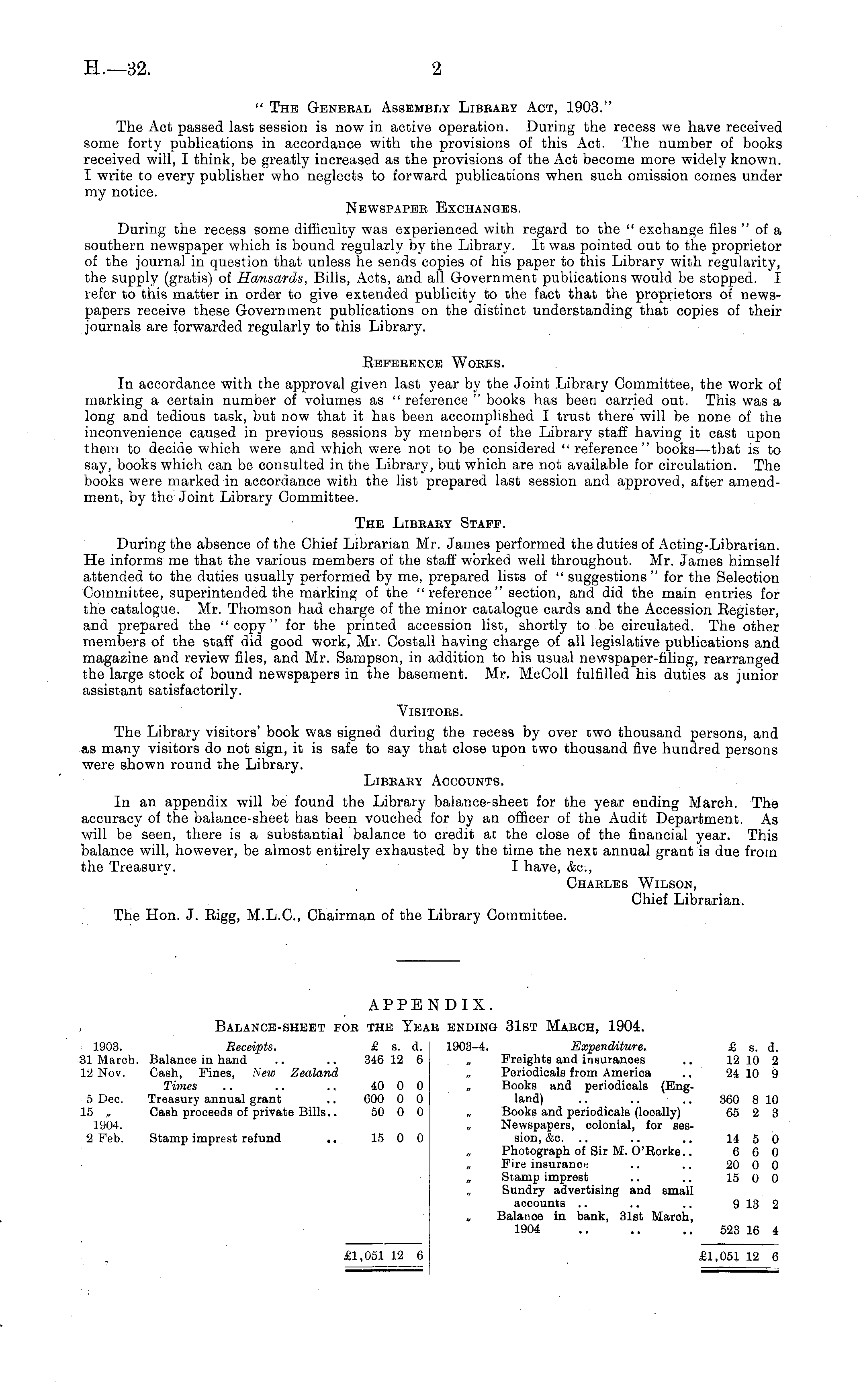 " The Genebal Assembly Libeaby Act, 1903." The Act passed last session is now in active operation. During the recess we have received some forty publications in accordance with the provisions of this Act. The number of books received will, I think, be greatly increased as the provisions of the Act become more widely known. I write to every publisher who neglects to forward publications when such omission comes under my notice. Newspapee Exchanges. During the recess some difficulty was experienced with regard to the " exchange files " of a southern newspaper which is bound regularly by the Library. It was pointed out to the proprietor of the journal in question that unless he sends copies of his paper to this Library with regularity, the supply (gratis) of Hansards, Bills, Acts, and all Government publications would be stopped. I refer to this matter in order to give extended publicity to the fact that the proprietors of newspapers receive these Government publications on the distinct understanding that copies of their journals are forwarded regularly to this Library. Refeeence Wobks. In accordance with the approval given last year by the Joint Library Committee, the work of marking a certain number of volumes as " reference " books has been carried out. This was a long and tedious task, but now that it has been accomplished I trust there will be none of the inconvenience caused in previous sessions by members of the Library staff having it cast upon them to decide which were and which were not to be considered "reference" books—that is to say, books which can be consulted in the Library, but which are not available for circulation. The books were marked in accordance with the list prepared last session and approved, after amendment, by the Joint Library Committee. The Libeaby Staff. During the absence of the Chief Librarian Mr. James performed the duties of Acting-Librarian. He informs me that the various members of the staff worked well throughout. Mr. James himself attended to the duties usually performed by me, prepared lists of " suggestions " for the Selection Committee, superintended the marking of the "reference" section, and did the main entries for the catalogue. Mr. Thomson had charge of the minor catalogue cards and the Accession Register, and prepared the "copy" for the printed accession list, shortly to be circulated. The other members of the staff did good work, Mr. Costall having charge of all legislative publications and magazine and review files, and Mr. Sampson, in addition to his usual newspaper-filing, rearranged the large stock of bound newspapers in the basement. Mr. McColl fulfilled his duties as junior assistant satisfactorily. Visitors. The Library visitors' book was signed during the recess by over two thousand persons, and as many visitors do not sign, it is safe to say that close upon two thousand five hundred persons were shown round the Library. Libbaby Accounts. In an appendix will be found the Library balance-sheet for the year ending March. The accuracy of the balance-sheet has been vouched for by an officer of the Audit Department. As will be seen, there is a substantial balance to credit at the close of the financial year. This balance will, however, be almost entirely exhausted by the time the next annual grant is due from the Treasury. I have, &c;, Charles Wilson, Chief Librarian. The Hon. J. Rigg, M.L.C, Chairman of the Library Committee.