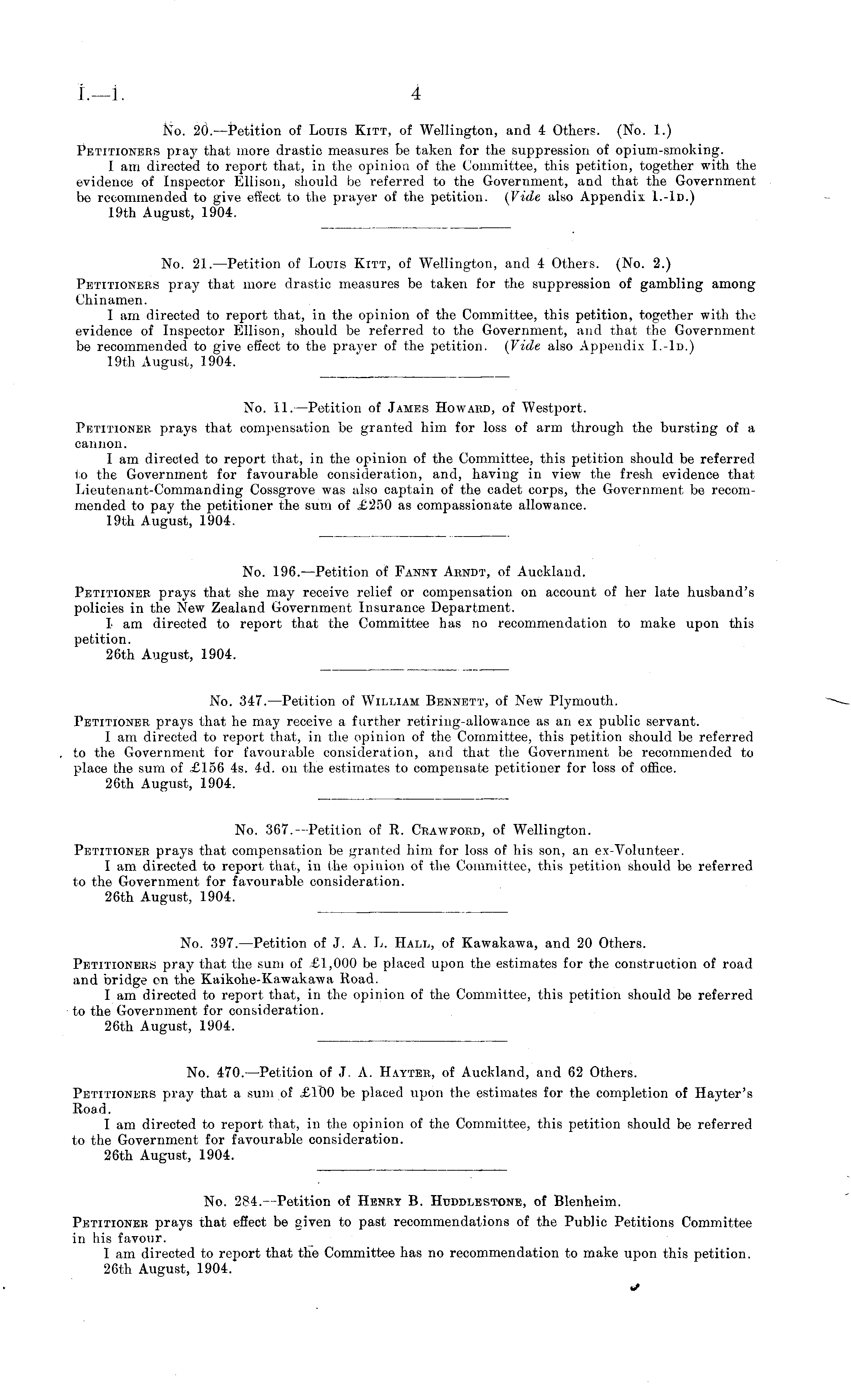 No. 21. —Petition of Louis Kitt, of Wellington, and 4 Others. (No. 2.) Petitioners pray that more drastic measures be taken for the suppression of gambling among Chinamen. I am directed to report that, in the opinion of the Committee, this petition, together with the evidence of Inspector Ellison, should be referred to the Government, and that the Government be recommended to give effect to the prayer of the petition. (Vide also Appendix 1.-Id.) 19th August, 1904.
