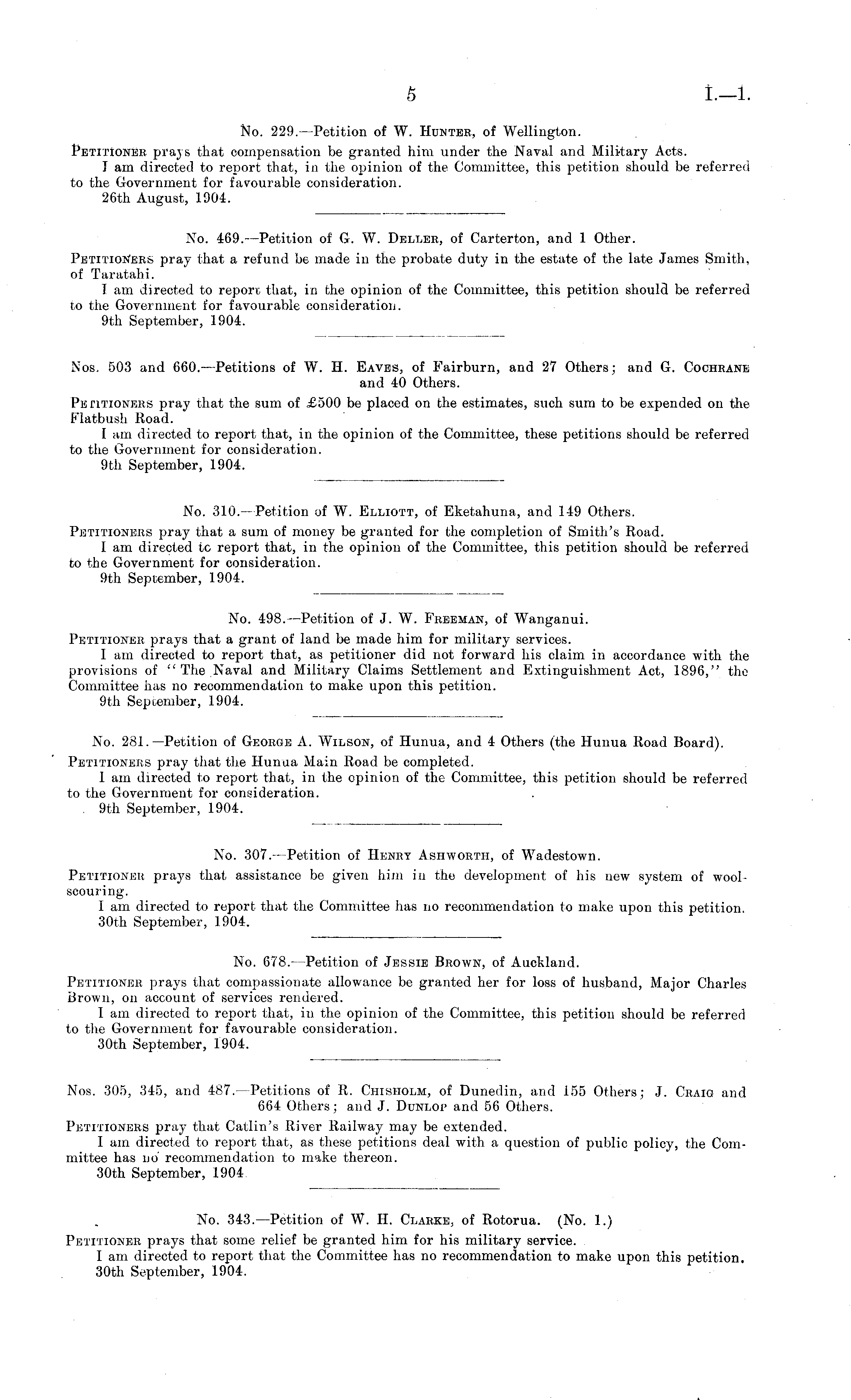 No. 229. —Petition of W. Hunter, of Wellington. Petitioner prays that compensation be granted him under the Naval and Military Acts. I am directed to report that, in the opinion of the Committee, this petition should be referred to the Government for favourable consideration. 26th August, 1904.