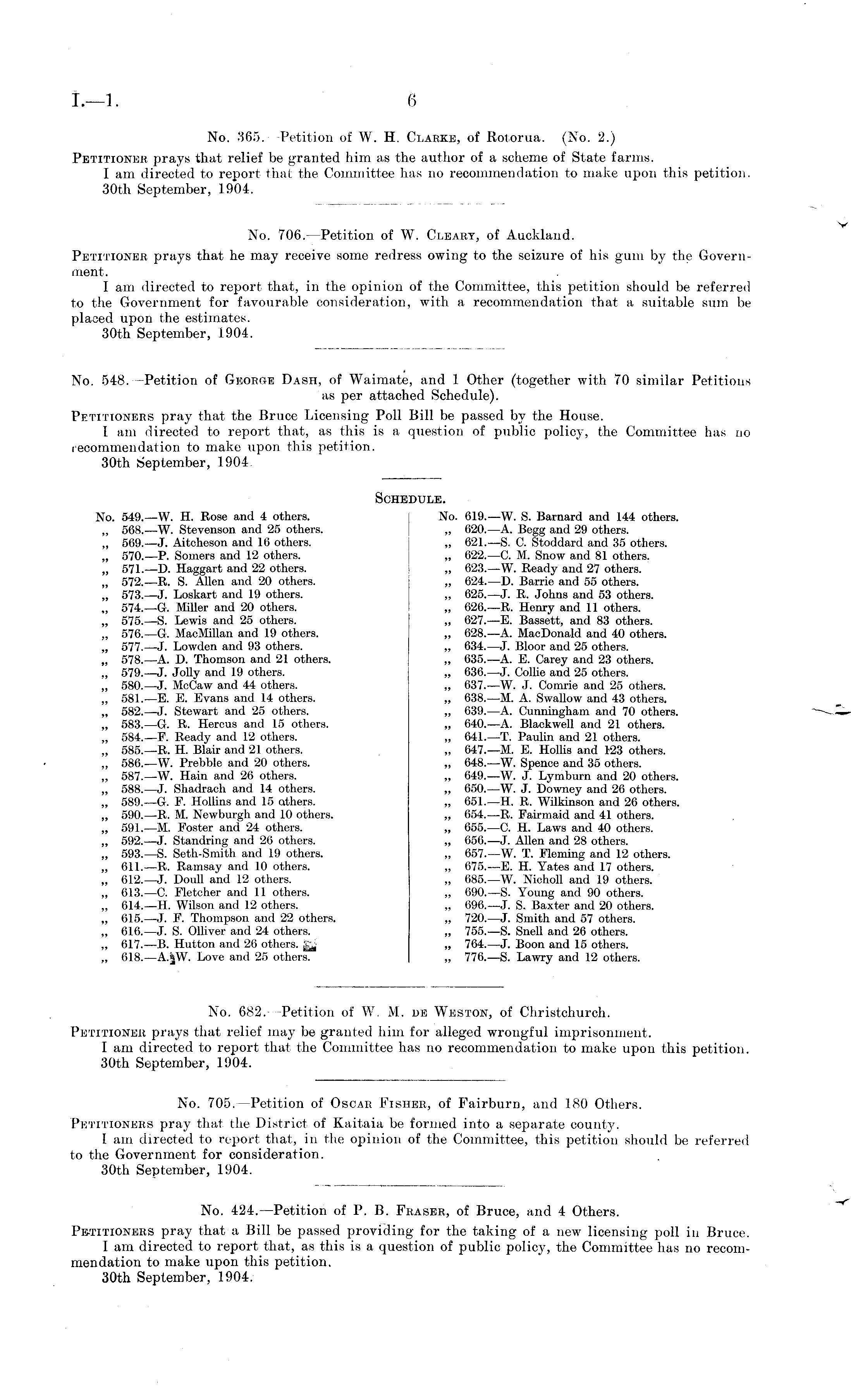 No. 365. Petition of W. H. Clarke, of Botorua. (No. 2.) Petitioner prays that relief be granted him as the author of a scheme of State farms. I am directed to report that the Committee has no recommendation to make upon this petition 30th September, 1904.