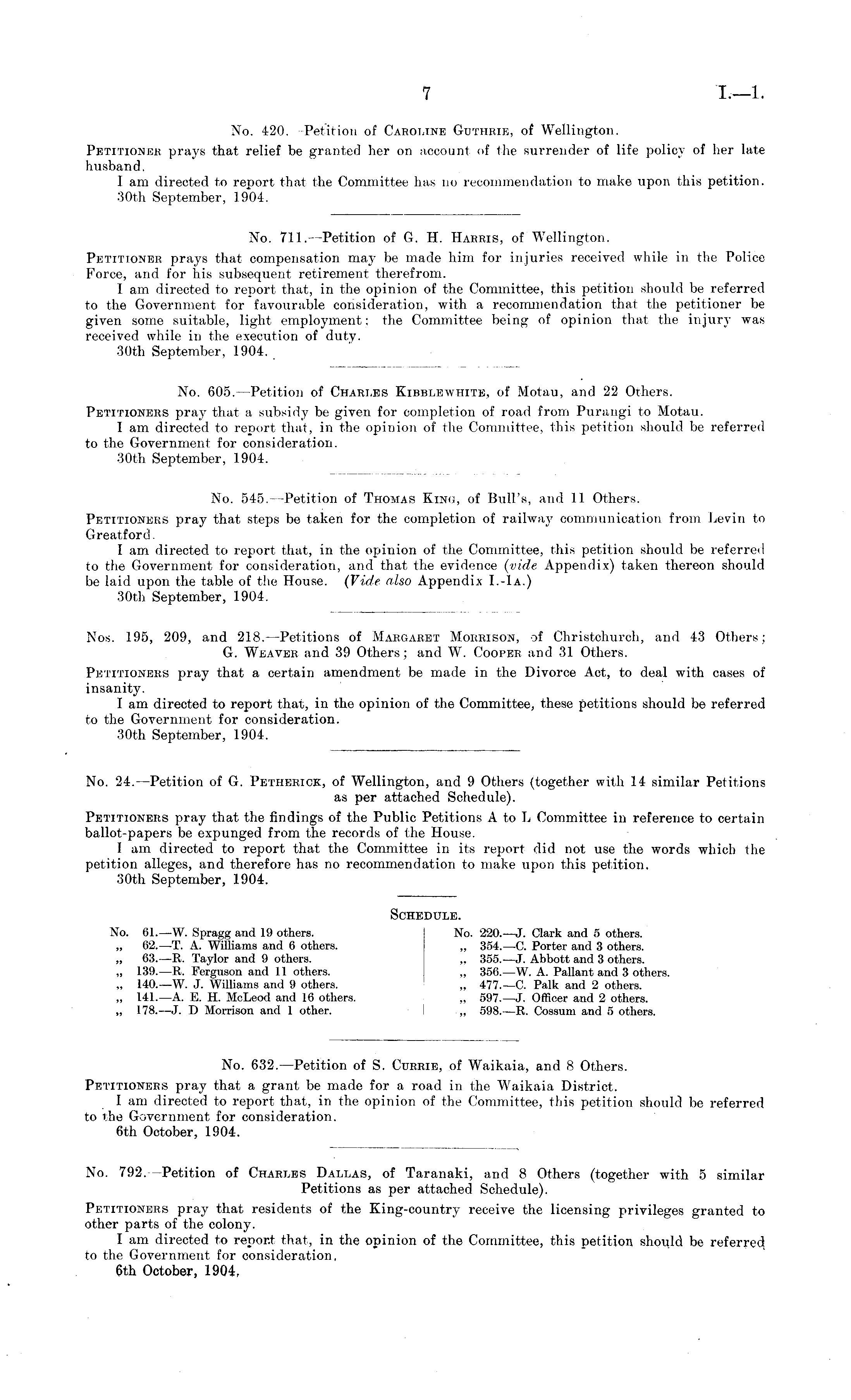 No. 24. —Petition of G. Petherick, of Wellington, and 9 Others (together with 14 similar Petitions as per attached Schedule). Petitioners pray that the findings of the Public Petitions A to L Committee in reference to certain ballot-papers be expunged from the records of the House. I am directed to report that the Committee in its report did not use the words which the petition alleges, and therefore has no recommendation to make upon this petition. 30th September, 1904.
