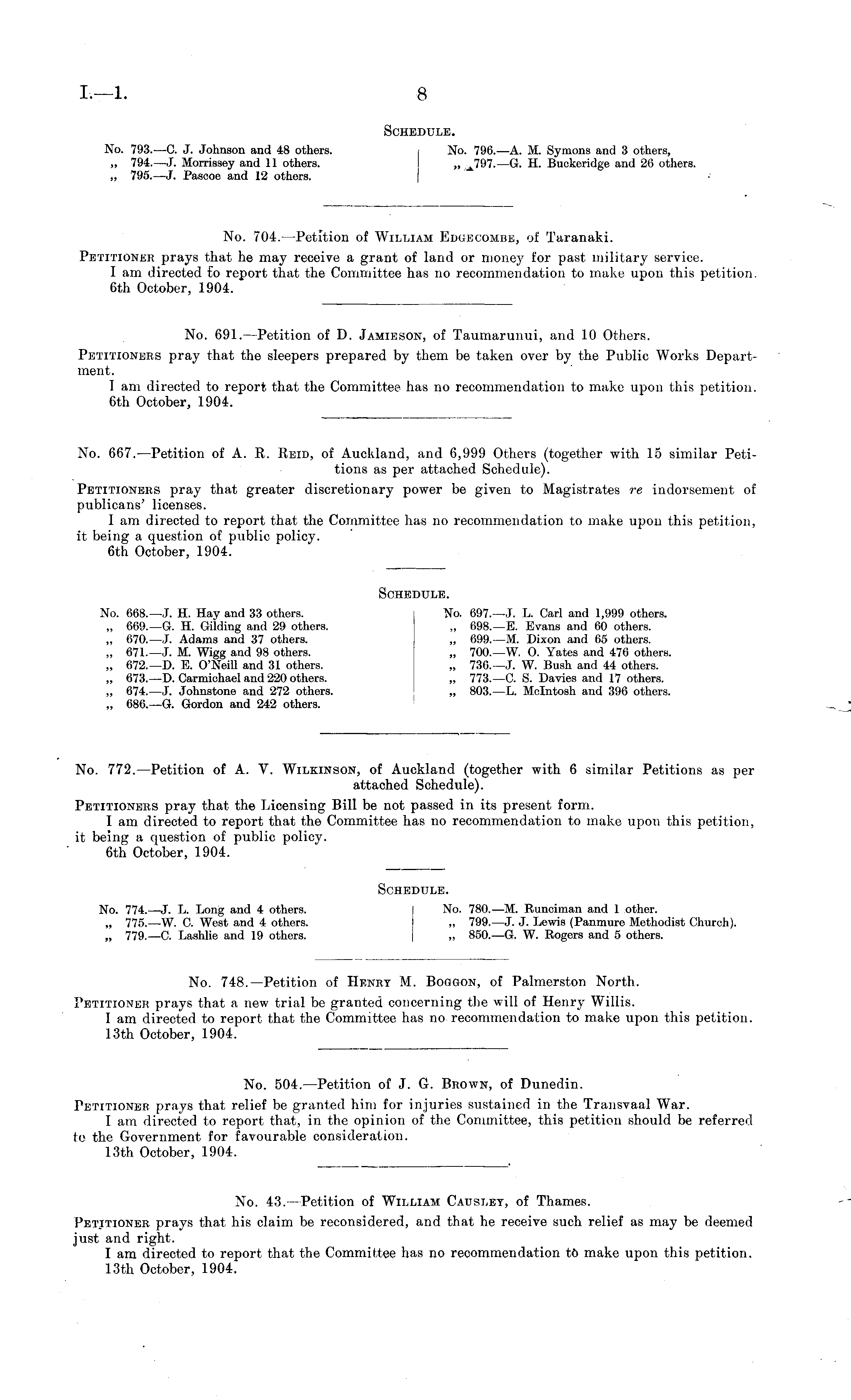No. 704. —Petition of William Eduecom.be, of Taranaki. Petitioner prays that he may receive a grant of land or money for past military service. I am directed £o report that the Committee has no recommendation to make upon this petition. 6th October, 1904.
