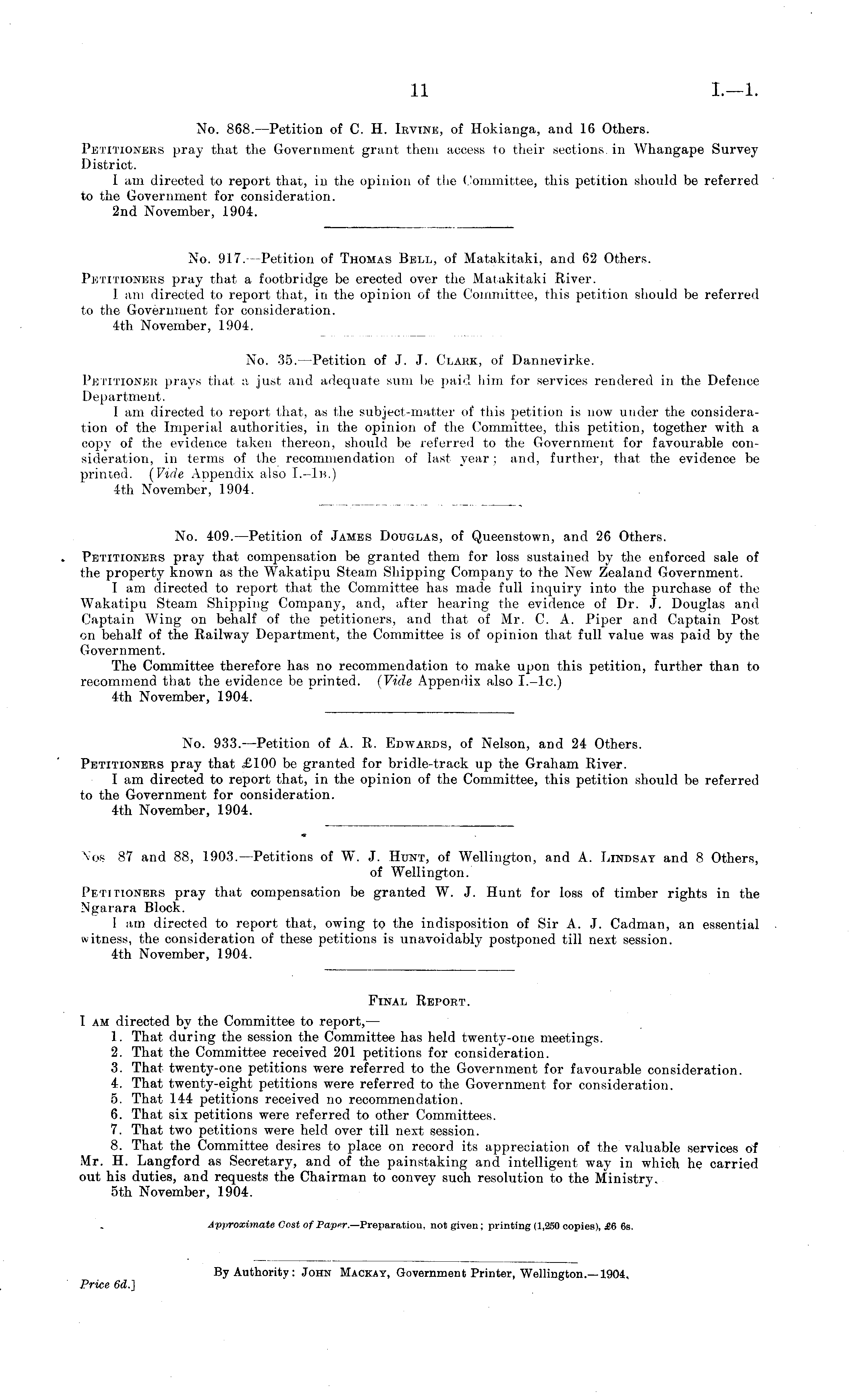 Final Report. I am directed by the Committee to report, — 1. That during the session the Committee has held twenty-one meetings. 2. That the Committee received 201 petitions for consideration. 3. That twenty-one petitions were referred to the Government for favourable consideration. 4. That twenty-eight petitions were referred to the Government for consideration. 5. That 144 petitions received no recommendation. 6. That six petitions were referred to other Committees. 7. That two petitions were held over till next session. 8. That the Committee desires to place on record its appreciation of the valuable services of Mr. H. Langford as Secretary, and of the painstaking and intelligent way in which he carried out his duties, and requests the Chairman to convey such resolution to the Ministry. sth November, 1904. Apfrroximate Cost of Paper.— Preparation, not given ; printing (1,250 copies), i>6 6s.