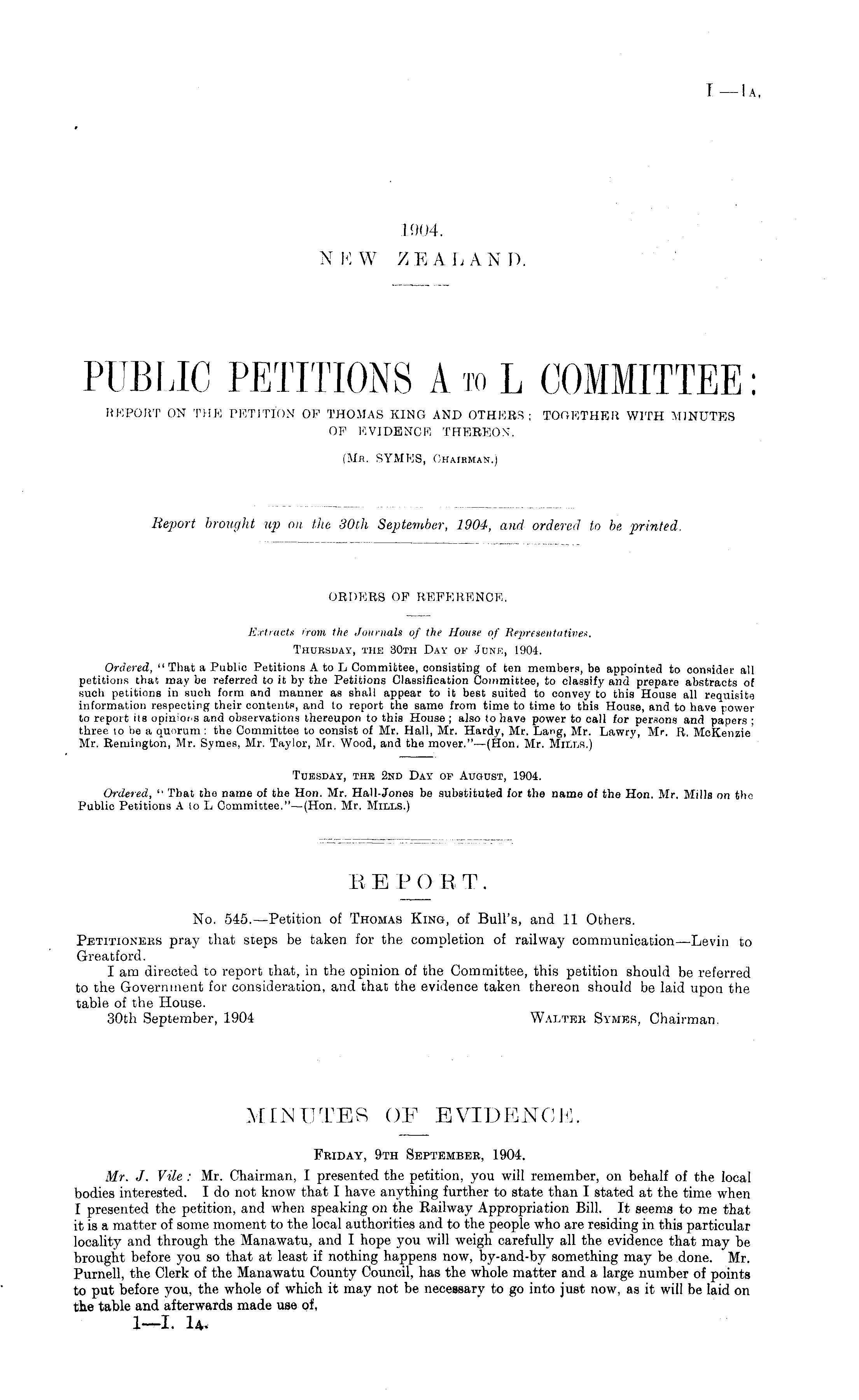 E E P OBT. No. 545. —Petition of Thomas King, of Bull's, and 11 Others. Petitioners pray that steps be taken for the completion of railway communication—Levin to Greatford. I am directed to report chat, in the opinion of the Committee, this petition should be referred to the Government for consideration, and that the evidence taken thereon should be laid upon the table of the House. 30th September, 1904 Walter Symes, Chairman.