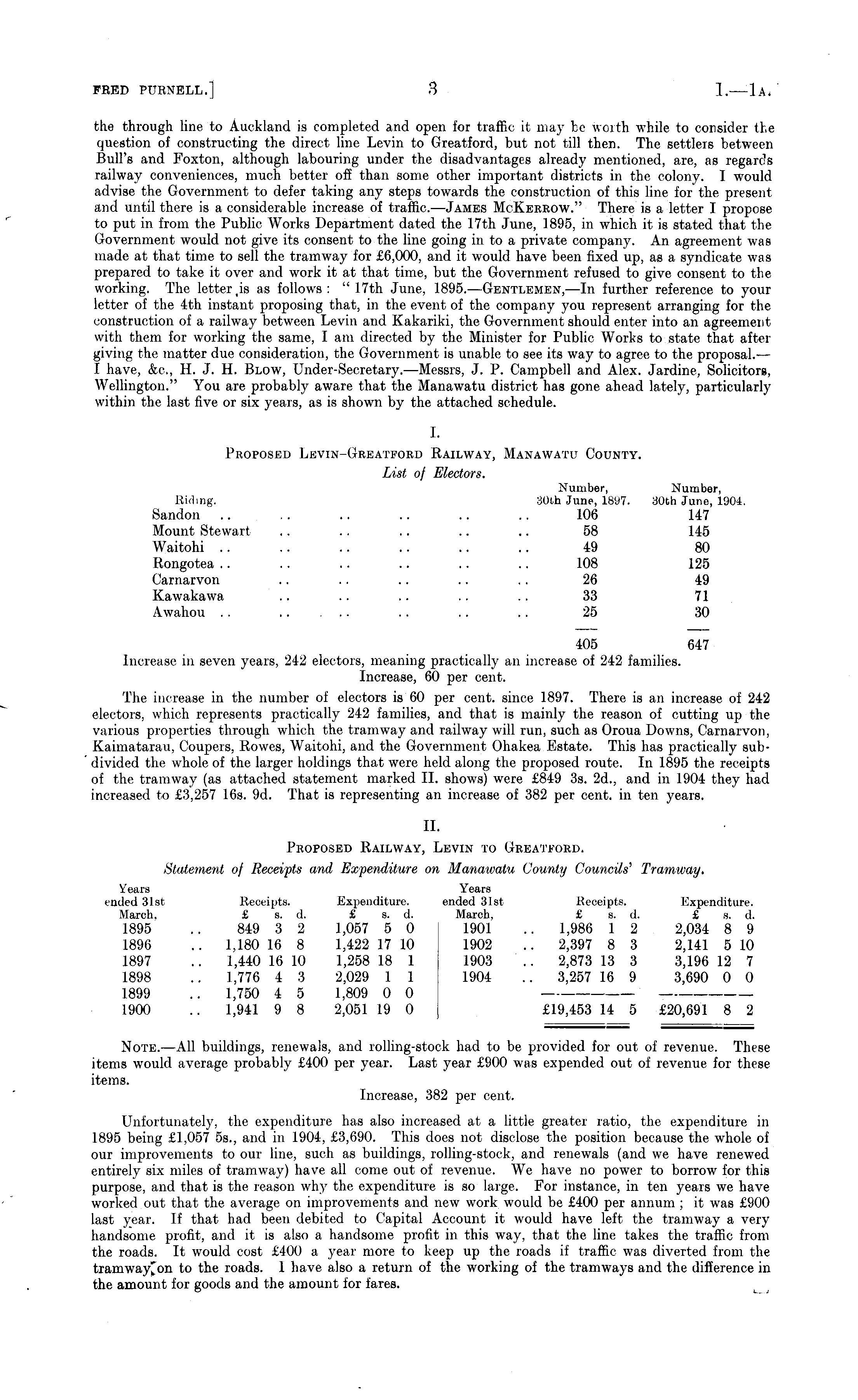 the through line to Auckland is completed and open for traffic it may be worth while to consider the question of constructing the direct line Levin to Greatford, but not till then. The settlers between Bull's and Foxton, although labouring under the disadvantages already mentioned, are, as regards railway conveniences, much better off than some other important districts in the colony. I would advise the Government to defer taking any steps towards the construction of this line for the present and until there is a considerable increase of traffic. —James McKbrrow." There is a letter I propose to put in from the Public Works Department dated the 17th June, 1895, in which it is stated that the Government would not give its consent to the line going in to a private company. An agreement was made at that time to sell the tramway for £6,000, and it would have been fixed up, as a syndicate was prepared to take it over and work it at that time, but the Government refused to give consent to the working. The letter ,is as follows: " 17th June, 1895. —Gentlemen,—ln further reference to your letter of the 4th instant proposing that, in the event of the company you represent arranging for the construction of a railway between Levin and Kakariki, the Government should enter into an agreement with them for working the same, I am directed by the Minister for Public Works to state that after giving the matter due consideration, the Government is unable to see its way to agree to the proposal. — I have, &c, H. J. H. Blow, Under-Seeretary.—Messrs, J. P. Campbell and Alex. Jardine, Solicitors, Wellington." You are probably aware that the Manawatu district has gone ahead lately, particularly within the last five or six years, as is shown by the attached schedule. I. Proposed Levin-Greatford Railway, Manawatu County. List of Electors. Number, Number, Hiding. 30lh June, 1897. 30th June, 1904. Sandon .. .. .. .. .. .. 106 147 Mount Stewart .. .. .. .. .. 58 145 Waitohi .. .. .. .. .. .. 49 80 Rongotea .. .. .. .. .. .. 108 125 Carnarvon .. .. .. .. .. 26 49 Kawakawa .. .. .. .. .. 33 71 Awahou .. ..... .. .. .. 25 30 405 647 Increase in seven years, 242 electors, meaning practically an increase of 242 families. Increase, 60 per cent. The increase in the number of electors is 60 per cent, since 1897. There is an increase of 242 electors, which represents practically 242 families, and that is mainly the reason of cutting up the various properties through which the tramway and railway will run, such as Oroua Downs, Carnarvon, Kaimatarau, Coupers, Rowes, Waitohi, and the Government Ohakea Estate. This has practically subdivided the whole of the larger holdings that were held along the proposed route. In 1895 the receipts of the tramway (as attached statement marked 11. shows) were £849 3s. 2d., and in 1904 they had increased to £3,257 16s. 9d. That is representing an increase of 382 per cent, in ten years. 11. Proposed Railway, Levin to Greatford. Statement of Receipts and Expenditure on Manawatu County Councils' Tramway. Years Years ended 31st -Receipts. Expenditure. ended 31st Receipts. Expenditure. March. £ s. d. £ s. d. March, £ s. d. £ g, d. 1895 .. 849 3 2 1,057 5 0 1901 .. 1,986 1 2 2,034 8 9 1896 .. 1,180 16 8 1,422 17 10 1902 .. 2,397 8 3 2,141 510 1897 .. 1,440 16 10 1,258 18 1 1903 .. 2,873 13 3 3,196 12 7 1898 .. 1,776 4 3 2,029 1 1 1904 .. 3,257 16 9 3,690 0 0 1899 .. 1,750 4 5 1,809 0 0 1900 .. 1,941 9 8 2,051 19 0 £19,453 14 5 £20,691 8 2 Note. —All buildings, renewals, and rolling-stock had to be provided for out of revenue. These items would average probably £400 per year. Last year £900 was expended out of revenue for these items. Increase, 382 per cent. Unfortunately, the expenditure has also increased at a little greater ratio, the expenditure in 1895 being £1,057 55., and in 1904, £3,690. This does not disclose the position because the whole of our improvements to our line, such as buildings, rolling-stock, and renewals (and we have renewed entirely six miles of tramway) have all come out of revenue. We have no power to borrow for this purpose, and that is the reason why the expenditure is so large. For instance, in ten years we have worked out that the average on improvements and new work would be £400 per annum ; it was £900 last year. If that had been debited to Capital Account it would have left the tramway a very handsome profit, and it is also a handsome profit in this way, that the line takes the traffic from the roads. It would cost £400 a year more to keep up the roads if traffic was diverted from the tramway^on to the roads. 1 have also a return of the working of the tramways and the difference in the amount for goods and the amount for fares.