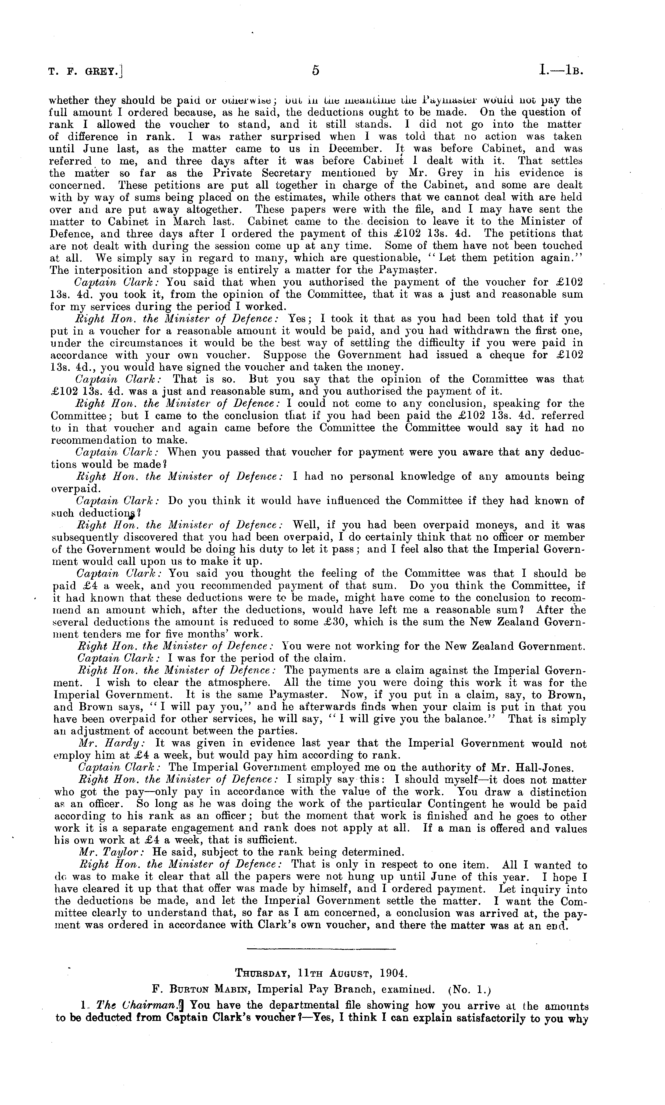 Thursday, 11th Aouust, 1904. F. Burton Mabin, Imperial Pay Branch, examined. (No. 1.) 1. The You have the departmental file showing how you arrive at the amounts to be deducted from Captain Clark's voucher? —Yes, I think I can explain satisfactorily to you why
