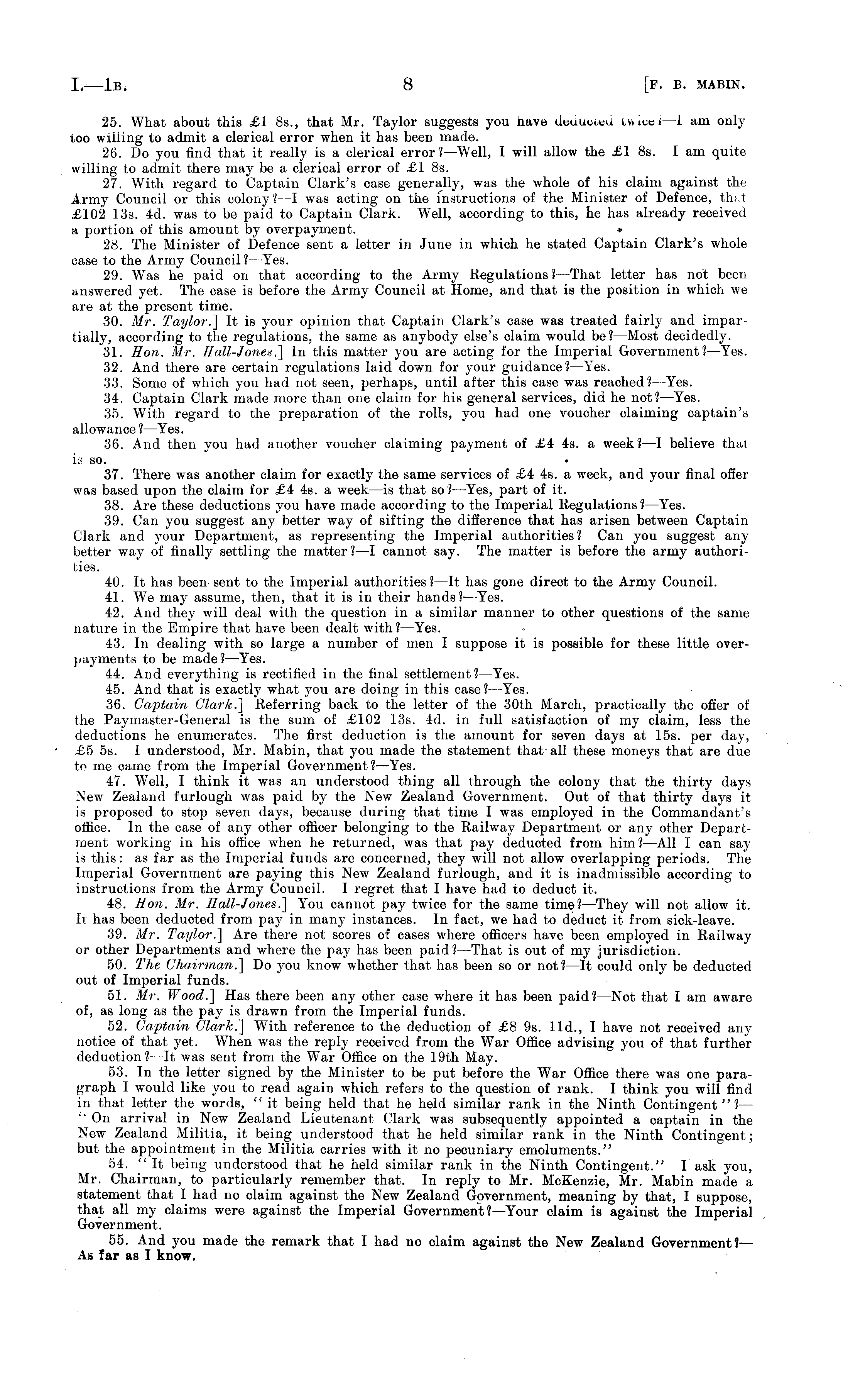 25. What about this £1 Bs., that Mr. Taylor suggests you have deducted twice* —1 am only too willing to admit a clerical error when it has been made. 26. Do you find that it really is a clerical error? —Well, I will allow the £1 Bs. lam quite willing to admit there may be a clerical error of £1 Bs. 27. With regard to Captain Clark's case generally, was the whole of his claim against the Army Council or this colony? —I was acting on the instructions of the Minister of Defence, ths.t £102 13s. 4d. was to be paid to Captain Clark. Well, according to this, he has already received a portion of this amount by overpayment. • 28. The Minister of Defence sent a letter in June in which he stated Captain Clark's whole case to the Army Council? —Yes. 29. Was he paid on that according to the Army Regulations? —That letter has not been answered yet. The case is before the Army Council at Home, and that is the position in which we are at the present time. 30. Mr. Taylor.] It is your opinion that Captain Clark's case was treated fairly and impartially, according to the regulations, the same as anybody else's claim would be? —Most decidedly. 31. Hon. Mr. Hall-Jones.] In this matter you are acting for the Imperial Government? —Yes. 32. And there are certain regulations laid down for your guidance? —Yes. 33. Some of which you had not seen, perhaps, until after this case was reached? —Yes. 34. Captain Clark made more than one claim for his general services, did he not? —Yes. 35. With regard to the preparation of the rolls, you had one voucher claiming captain's allowance ? —Yes. 36. And then you had another voucher claiming payment of £4 4s. a week? —I believe that is so. 37. There was another claim for exactly the same services of £4 4s. a week, and your final offer was based upon the claim for £4 4s. a week —is that so? —Yes, part of it. 38. Are these deductions you have made according to the Imperial Regulations? —Yes. 39. Can you suggest any better way of sifting the difference that has arisen between Captain Clark and your Department, as representing the Imperial authorities? Can you suggest any better way of finally settling the matter? —I cannot say. The matter is before the army authorities. 40. It has been sent to the Imperial authorities? —It has gone direct to the Army Council. 41. We may assume, then, that it is in their hands? —Yes. 42. And they will deal with the question in a similar manner to other questions of the same nature in the Empire that have been dealt with? —Yes. 43. In dealing with so large a number of men I suppose it is possible for these little overpayments to be made? —Yes. 44. And everything is rectified in the final settlement? —Yes. 45. And that is exactly what you are doing in this case? —Yes. 36. Captain Clark.] Referring back to the letter of the 30th March, practically the offer of the Paymaster-General is the sum of £102 13s. 4d. in full satisfaction of my claim, less the deductions he enumerates. The first deduction is the amount for seven days at 15s. per day, £5 ss. I understood, Mr. Mabin, that you made the statement that- all these moneys that are due to me came from the Imperial Government? —Yes. 47. Well, I think it was an understood thing all through, the colony that the thirty days New Zealand furlough was paid by the New Zealand Government. Out of that thirty days it is proposed to stop seven days, because during that time I was employed in the Commandant's office. In the case of any other officer belonging to the Railway Department or any other Department working in his office when he returned, was that pay deducted from him? —All I can say is this: as far as the Imperial funds are concerned, they will not allow overlapping periods. The Imperial Government are paying this New Zealand furlough, and it is inadmissible according to instructions from the Army Council. I regret that I have had to deduct it. 48. Hon. Mr. Hall-Jones.] You cannot pay twice for the same time? —They will not allow it. It has been deducted from pay in many instances. In fact, we had to deduct it from sick-leave. 39. Mr. Taylor.] Are there not scores of cases where officers have been employed in Railway or other Departments and where the pay has been paid? —That is out of my jurisdiction. 50. The Chairman.] Do you know whether that has been so or not? —It could only be deducted out of Imperial funds. 51. Mr. Wood.] Has there been any other case where it has been paid? —Not that I am aware of, as long as the pay is drawn from the Imperial funds. 52. Captain Clark.] With reference to the deduction of £8 9s. lid., I have not received any notice of that yet. When was the reply received from the War Office advising you of that further deduction? —It was sent from the War Office on the 19th May. 53. In the letter signed by the Minister to be put before the War Office there was one paragraph I would like you to read again which refers to the question of rank. I think you will find in that letter the words, " it being held that he held similar rank in the Ninth Contingent"? — " On arrival in New Zealand Lieutenant Clark was subsequently appointed a captain in the New Zealand Militia, it being understood that he held similar rank in the Ninth Contingent; but the appointment in the Militia carries with it no pecuniary emoluments." 54. "It being understood that he held similar rank in the Ninth Contingent." I ask you, Mr. Chairman, to particularly remember that. In reply to Mr. McKenzie, Mr. Mabin made a statement that I had no claim against the New Zealand Government, meaning by that, I suppose, that all my claims were against the Imperial Government ?—Your claim is against the Imperial Government. 55. And you made the remark that I had no claim against the New Zealand Government? — As far as I know.