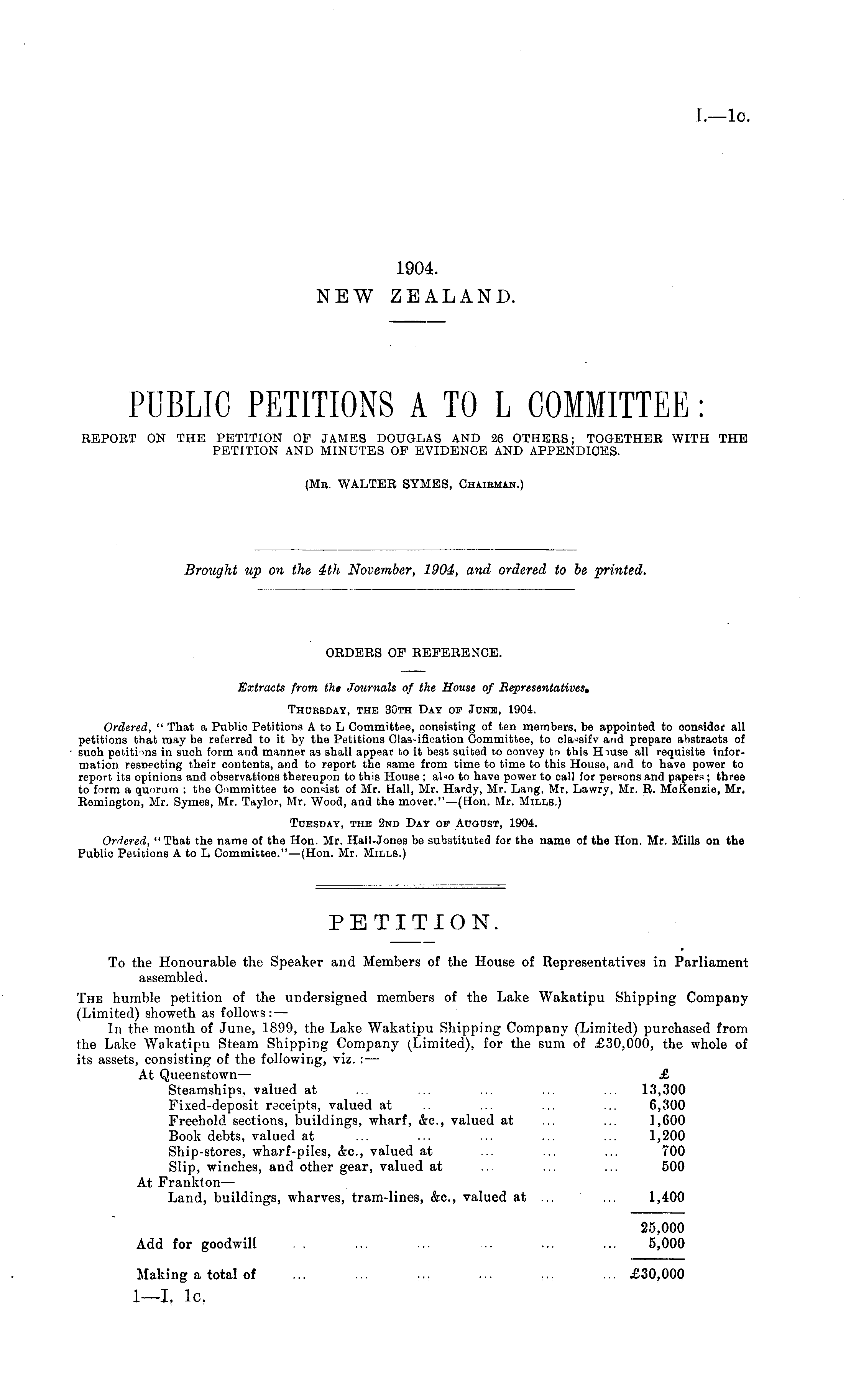 To the Honourable the Speaker and Members of the House of Representatives in Parliament assembled. The humble petition of the undersigned members of the Lake Wakatipu Shipping Company (Limited) showeth as follows: — In the month of June, 1899, the Lake Wakatipu Shipping Company (Limited) purchased from the Lake Wakatipu Steam Shipping Company (Limited), for the sum of £30,000, the whole of its assets, consisting of the following, viz.:— At Queenstown — £ Steamships, valued at ... ... ... ... ... 13,300 Fixed-deposit receipts, valued at ... ... ... 6,300 Freehold sections, buildings, wharf, &c, valued at ... ... 1,600 Book debts, valued at ... ... ... ... 1,200 Ship-stores, wharf-piles, &c, valued at ... ... ... 700 Slip, winches, and other gear, valued at .. ... ... 500 At Frankton — Land, buildings, wharves, tram-lines, &c, valued at ... ... 1,400 25,000 Add for goodwill . . ... ... .... ... ... 5,000 Making a total of ... ... ... £30,000 I—l. lc.