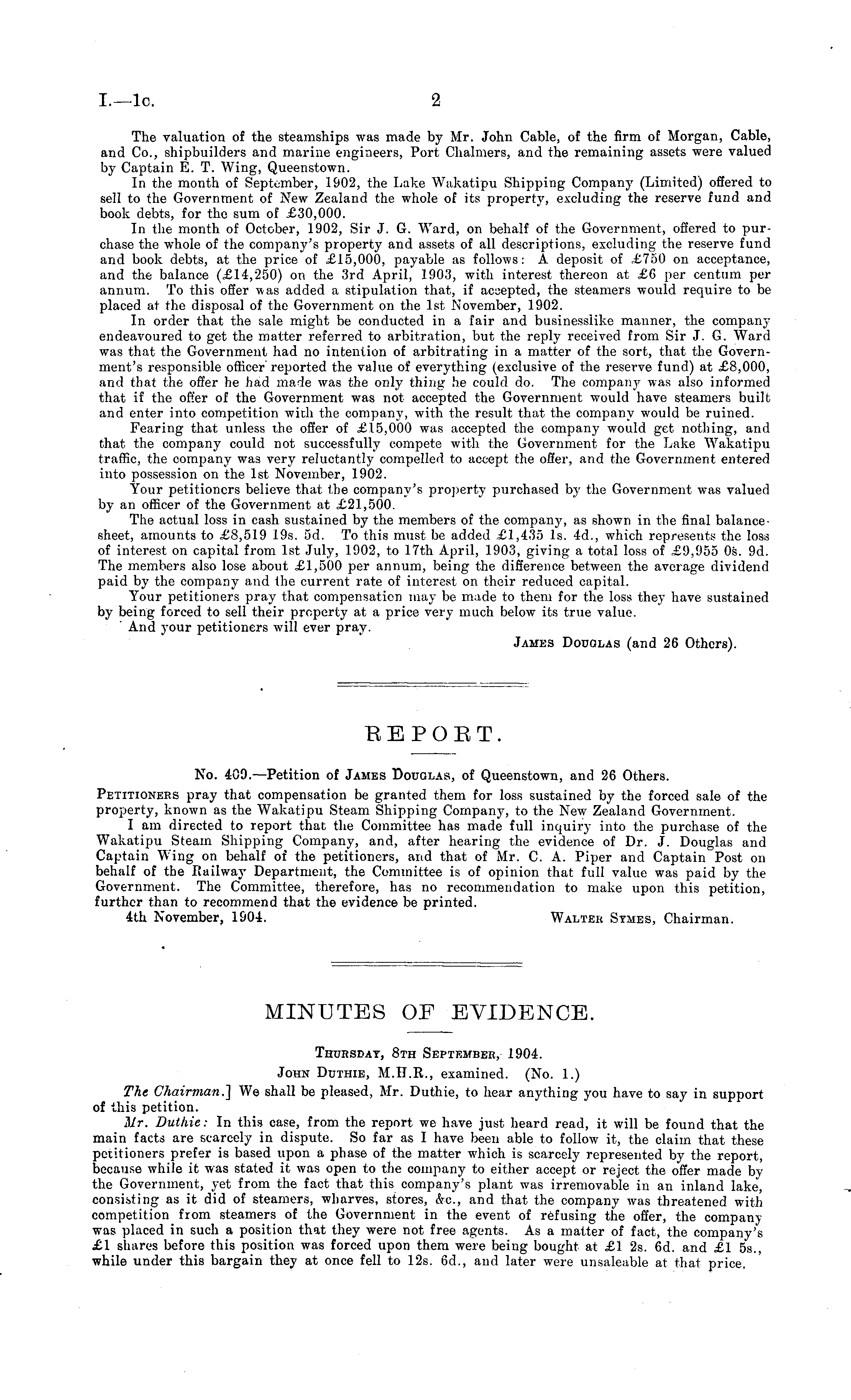 No. 409. —Petition of James Douglas, of Queenstown, and 26 Others. Petitionees pray that compensation be granted them for loss sustained by the forced sale of the property, known as the Wakatipu Steam Shipping Company, to the New Zealand Government. I am directed to report that the Committee has made full inquiry into the purchase of the Wakatipu Steam Shipping Company, and, after hearing the evidence of Dr. J. Douglas and Captain Wing on behalf of the petitioners, and that of Mr. C. A. Piper and Captain Post on behalf of the Railway Department, the Committee is of opinion that full value was paid by the Government. The Committee, therefore, has no recommendation to make upon this petition, further than to recommend that the evidence be printed. 4th November, 1904. Walter Stmes, Chairman.