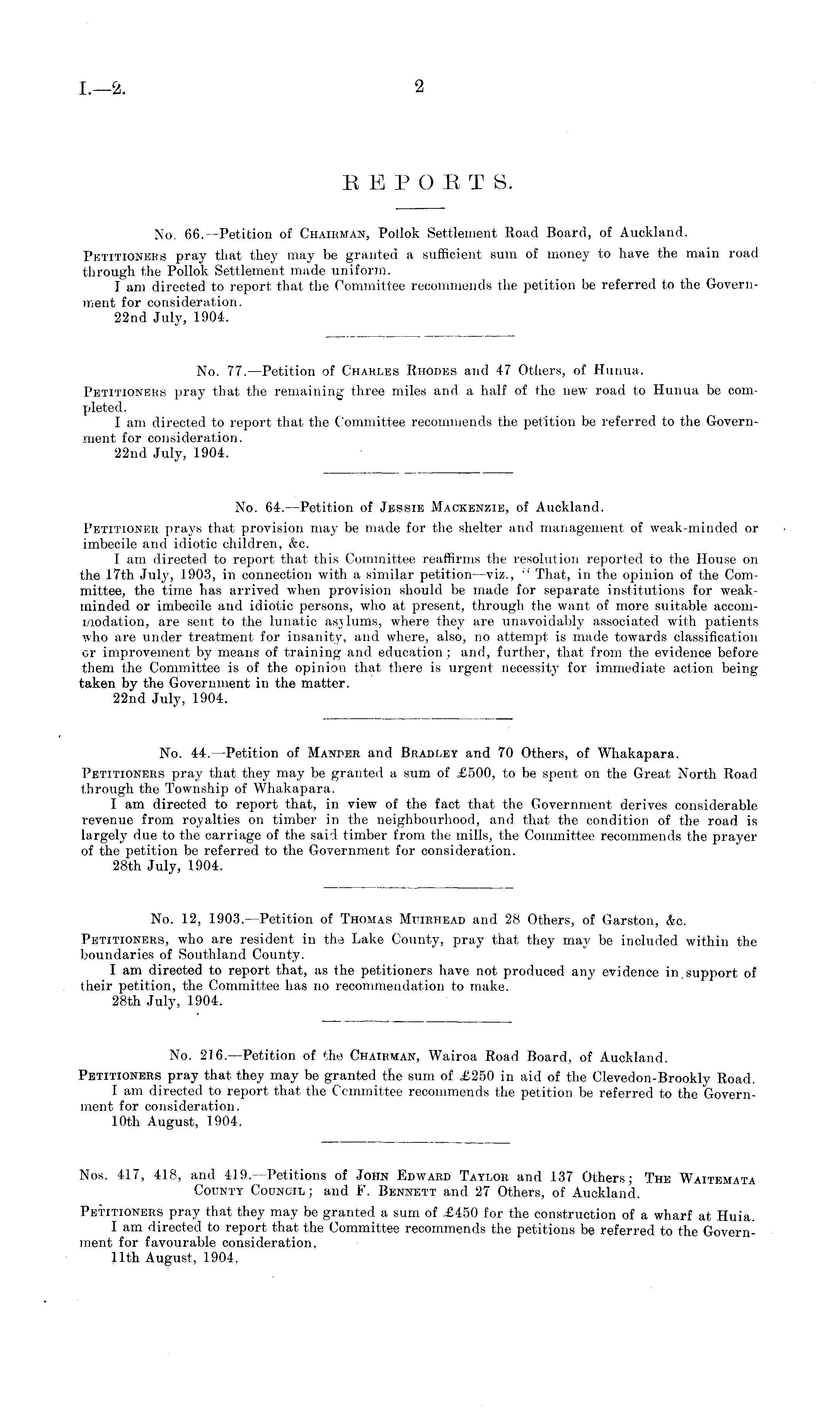 No. 216. —Petition of the Chairman, Wairoa Road Board, of Auckland. Petitioners pray that they may be granted the sum of £250 in aid of the Clevedon-Brookly Road. I am directed to report that the Committee recommends the petition be referred to the Government for consideration. 10th August, 1904.