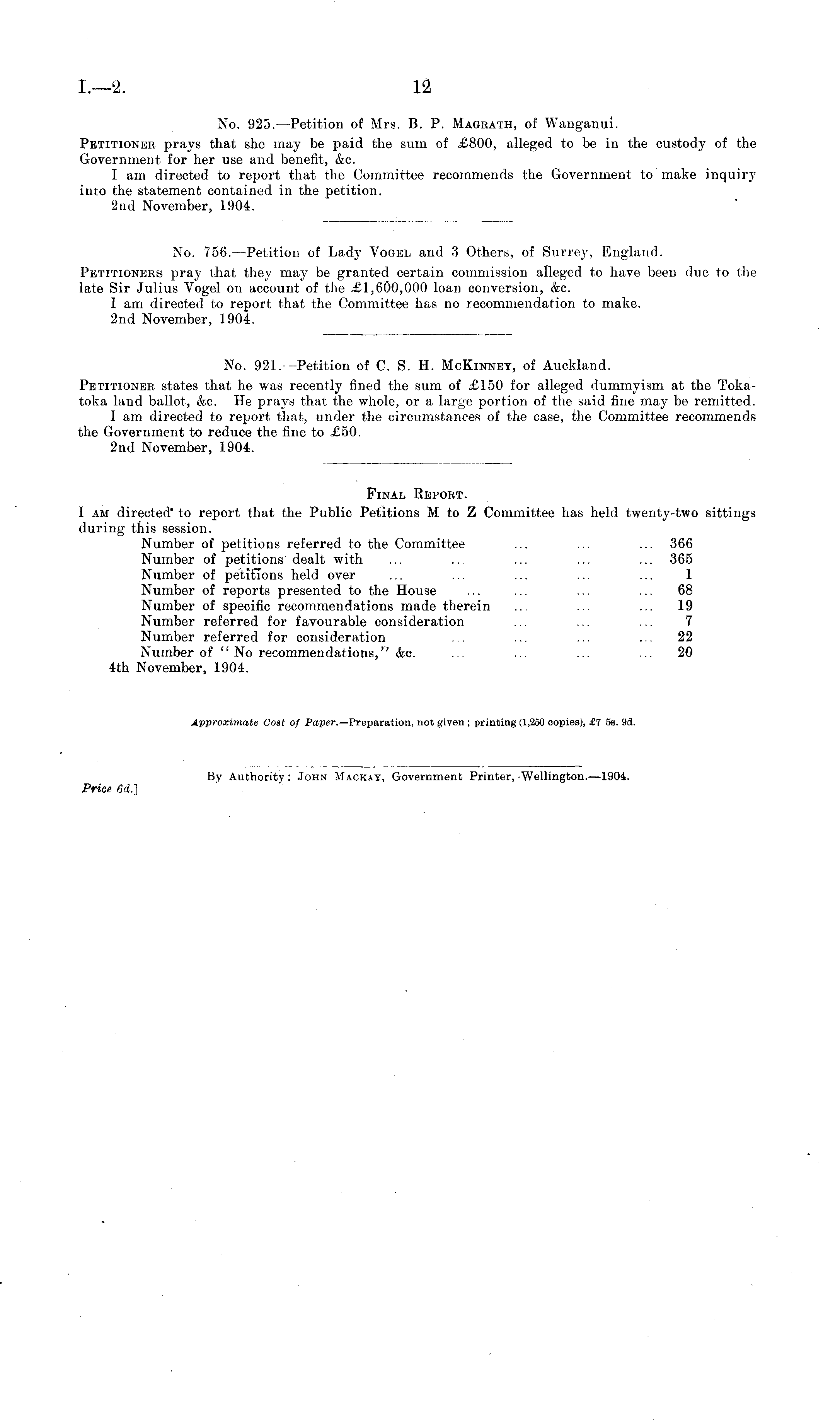 Final Report. I am directed' to report that the Public Petitions M to Z Committee has held twenty-two sittings during this session. Number of petitions referred to the Committee ... ... ... 366 Number of petitions dealt with ... .. ... ... ... 365 Number of petitions held over ... ... ... ... ... 1 Number of reports presented to the House ... ... ... ... 68 Number of specific recommendations made therein ... ... ... 19 Number referred for favourable consideration ... ... ... 7 Number referred for consideration ... ... ... ... 22 Number of " No recommendations," &c. ... ... ... ... 20 4th November, 1904. Approximate Cost of Paper.— Preparation, not given ; printing (1,250 copies), £7 ss. 9d.