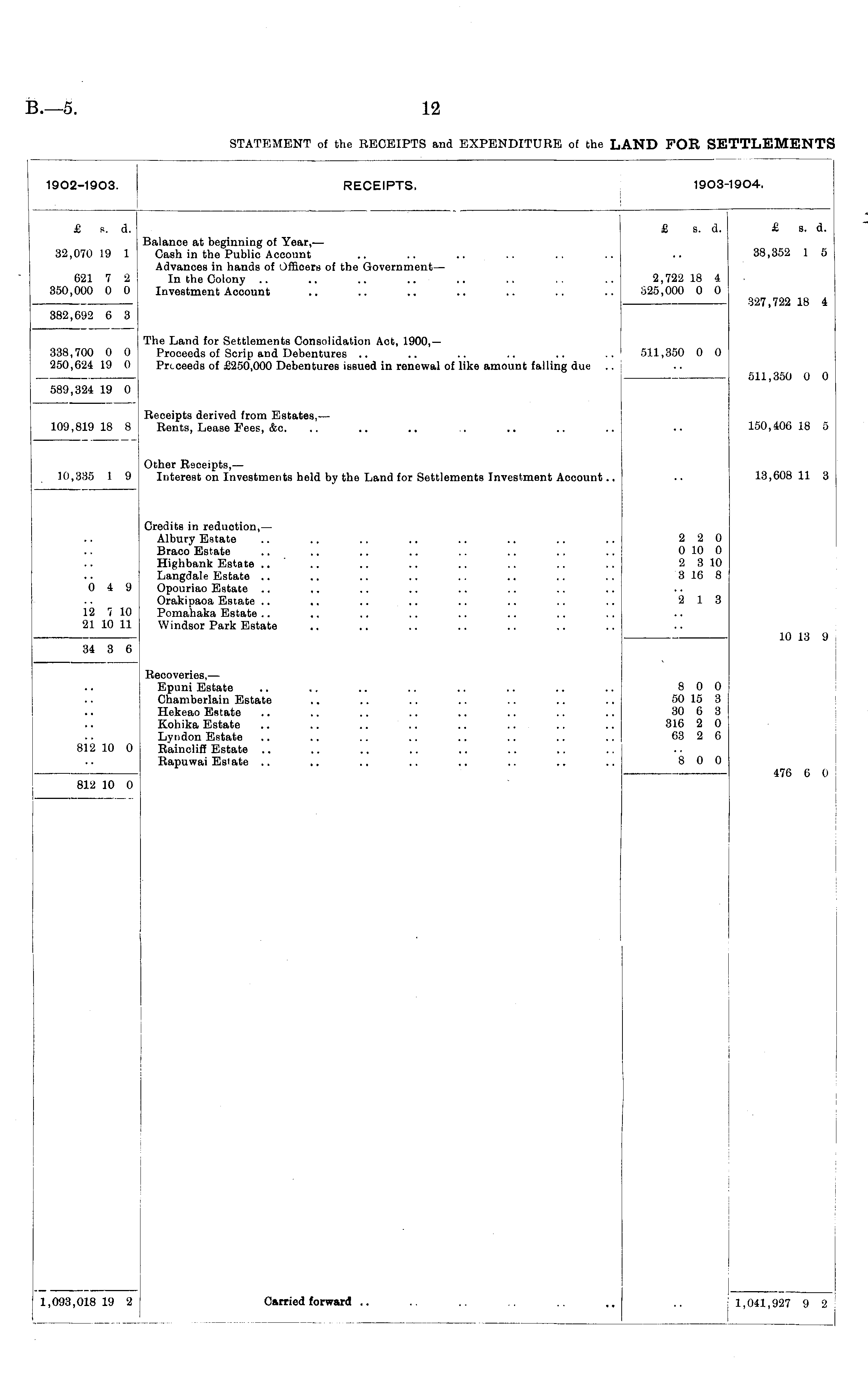 19O2-19O3. 19O3-19O4. RECEIPTS. £ s. d. £ s. d. £ s. d. 32,070 19 1 621 7 2 350,000 0 0 Balance at beginning of Year, — Cash in the Public Account Advances in hands of Officers of the Government — In the Colony Investment Account 2,722 18 4 825,000 0 0 38,352 1 5 382,692 6 3 327,722 18 i 338,700 0 0 250,624 19 0 The Land for Settlements Consolidation Act, 1900,— Proceeds of Scrip and Debentures .. Prcceeds of £250,000 Debentures issued in renewal of like amount falling due .. 511,350 0 0 511,350 0 0 589,324 19 0 Receipts derived from Estates, — Rents, Lease Pees, &c. 109,819 18 8 150,406 18 5 10,335 1 9 Other Receipts,— Interest on Investments held by the Land for Settlements Investment Account.. 13,608 11 3 0 4 9 Credits in reduotion, — Albury Estate Braco Estate Highbank Estate .. Langdale Estate Opouriao Estate Orakipaoa Estate .. Pomahaka Estate Windsor Park Estate 2 2 0 0 10 0 2 3 10 3 16 8 10 13 9 12 7 10 21 10 11 2 13 34 3 6 Recoveries, — Epuni Estate Chamberlain Estate Hekeao Estate Kohika Estate Lyndon Estate Raincliff Estate Rapuwai Estate .. 8 0 0 50 15 3 30 6 3 316 2 0 63 2 6 476 6 0 812 10 0 8 0 0 812 10 0 Carried forward ,093,018 19 2 1,041,927 9 2