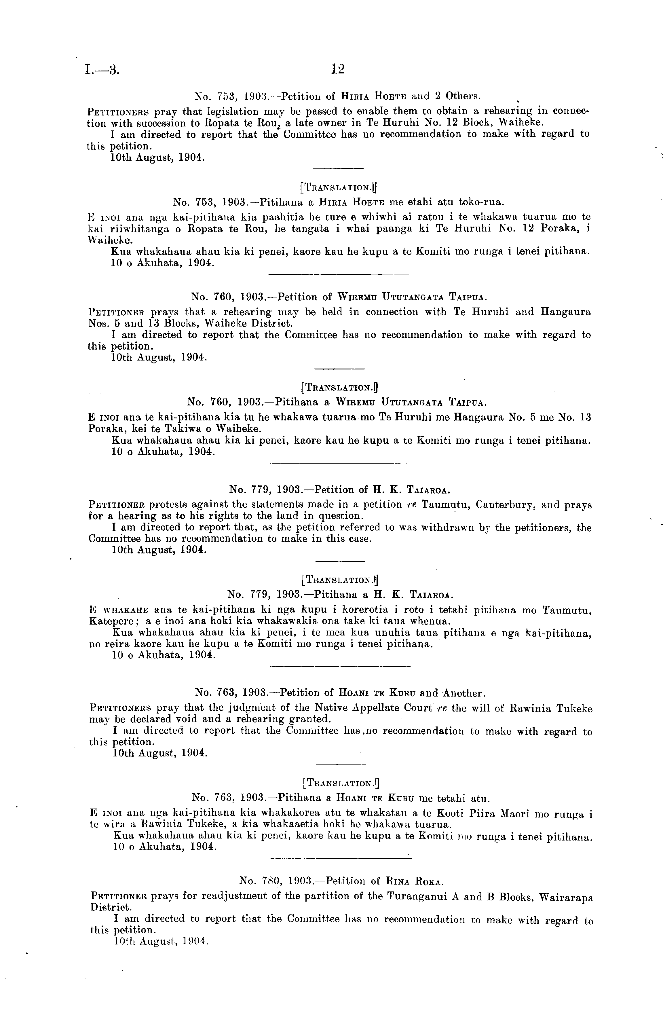 [Translation.fj No. 760, 1903. —Pitihana a Wiremu Ututangata Taipua. E inoi ana te kai-pitihana kia tv he whakawa tuarua mo Te Huruhi me Hangaura No. 5 me No. 13 Poraka, kei te Takiwa o Waiheke. Kua whakahaua ahau kia ki penei, kaore kau he kupu a te Komiti mo runga i tenei pitihana. 10 o Akuhata, 1904.