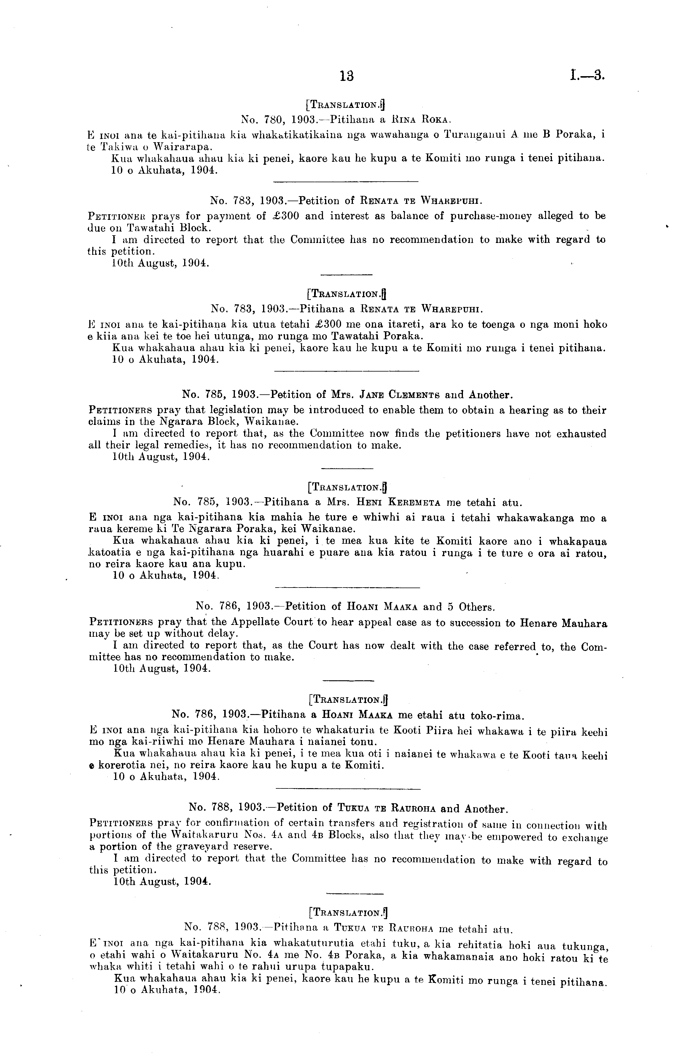 [Translation.!] No. 780, 1903.—Pitihana a Rina Roka. E inoi ana te kai-pitihana kia whakatikatikaina nga wawahauga o Turanganui A me B Poraka, i te Takiwa o Wairarapa. Kua whakahaua ahau kia ki penei, kaore kau he kupu a te Komiti mo runga i tenei pitihana. 10 o Akuhata, 1904.