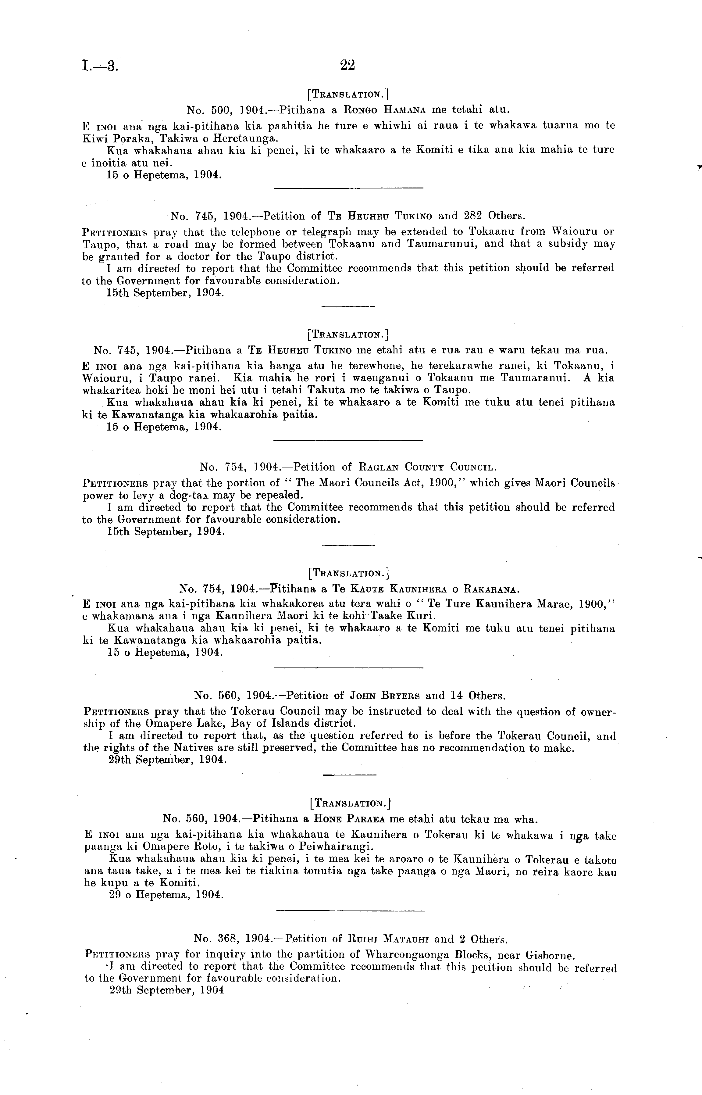 [Translation.] No. 560, 1904. —Pitihana a Hone Paraea me etahi atu tekau ma wha. E inoi ana nga kai-pitihana kia whakahaua te Kaunihera o Tokerau kite whakawa i nga take paanga ki Omapere Roto, i te takiwa o Peiwhairangi. Kua whakahaua ahau kia ki penei, i te mea kei te aroaro o te Kaunihera o Tokerau c takoto ana taua take, a i te mea kei te tiakina tonutia nga take paanga o nga Maori, no reira kaore kau he kupu a te Komiti. 29 o Hepetema, 1904.