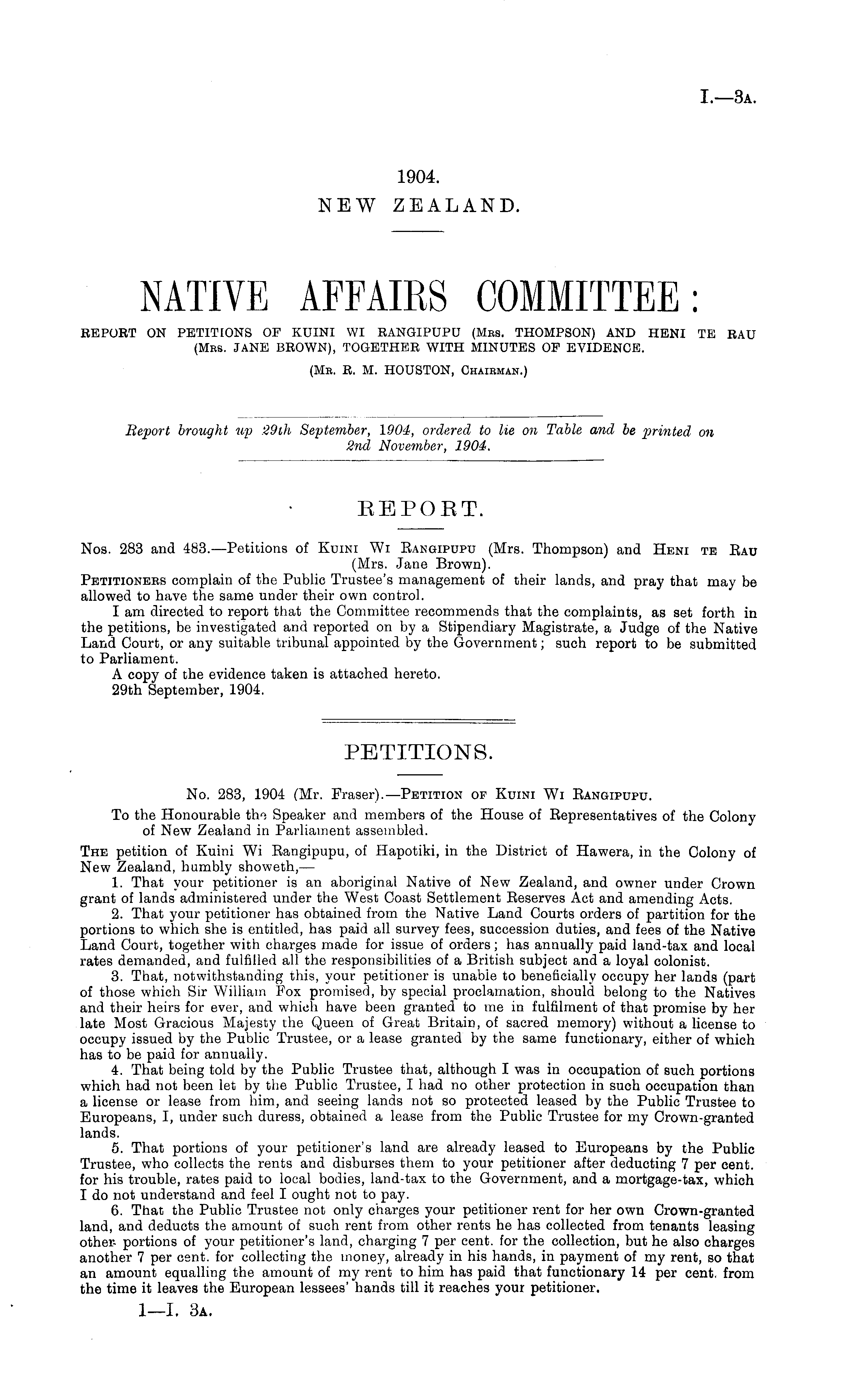 NATIVE AFFAIRS COMMITTEE: REPORT ON PETITIONS OF KUINI WI RANGIPUPU (Mrs. THOMPSON) AND HENI TE RAU (Mrs. JANE BROWN), TOGETHER WITH MINUTES OF EVIDENCE. (Mr. R.M. HOUSTON, Chairman.)