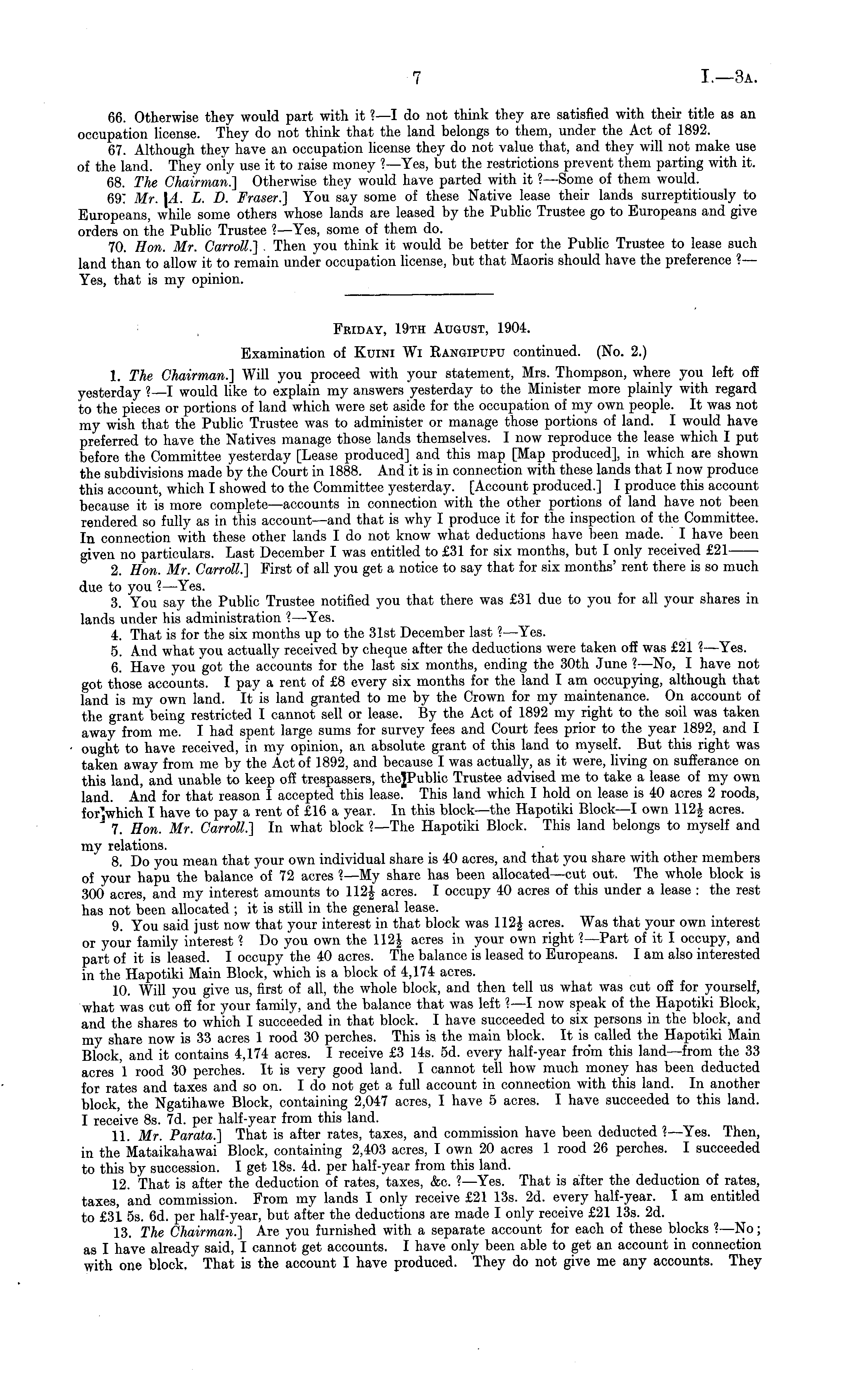 Friday, 19th August, 1904. Examination of Kuini Wi Rangipupu continued. (No. 2.) 1. The Chairman.] Will you proceed with your statement, Mrs. Thompson, where you left off yesterday ? I would like to explain my answers yesterday to the Minister more plainly with regard to the pieces or portions of land which were set aside for the occupation of my own people. It was not my wish that the Public Trustee was to administer or manage those portions of land. I would have preferred to have the Natives manage those lands themselves. I now reproduce the lease which I put before the Committee yesterday [Lease produced] and this map [Map produced], in which are shown the subdivisions made by the Court in 1888. And it is in connection with these lands that I now produce this account, which I showed to the Committee yesterday. [Account produced.] I produce this account because it is more complete —accounts in connection with the other portions of land have not been rendered so fully as in this account —and that is why I produce it for the inspection of the Committee. In connection with these other lands Ido not know what deductions have been made. I have been given no particulars. Last December I was entitled to £31 for six months, but I only received £21 2. Hon. Mr. Carroll.] First of all you get a notice to say that for six months' rent there is so much due to you ? —Yes. 3. You say the Public Trustee notified you that there was £31 due to you for all your shares in lands under his administration I—Yes.1 —Yes. 4. That is for the six months up to the 31st December last % —Yes. 5. And what you actually received by cheque after the deductions were taken off was £21 ? —Yes. 6. Have you got the accounts for the last six months, ending the 30th June ? —No, I have not got those accounts. I pay a rent of £8 every six months for the land lam occupying, although that land is my own land. It is land granted to me by the Crown for my maintenance. On account of the grant being restricted I cannot sell or lease. By the Act of 1892 my right to the soil was taken away from me. I had spent large sums for survey fees and Court fees prior to the year 1892, and I ought to have received, in my opinion, an absolute grant of this land to myself. But this right was taken away from me by the Act of 1892, and because I was actually, as it were, living on sufferance on this land, and unable to keep off trespassers, theJPublic Trustee advised me to take a lease of my own land. And for that reason I accepted this lease. This land which I hold on lease is 40 acres 2 roods, for'which I have to pay a rent of £16 a year. In this block —the Hapotiki Block —I own 112J acres. "7. Hon. Mr. Carroll.] In what block ?—The Hapotiki Block. This land belongs to myself and mv relations. 8. Do you mean that your own individual share is 40 acres, and that you share with other members of your hapu the balance of 72 acres ? —My share has been allocated —cut out. The whole block is 300 acres, and my interest amounts to 112 _ acres. I occupy 40 acres of this under a lease : the rest has not been allocated ; it is still in the general lease. 9. You said just now that your interest in that block was 112J acres. Was that your own interest or your family interest"? Do you own the 112J acres in your own right ?—Part of it I occupy, and part of it is leased. I occupy the 40 acres. The balance is leased to Europeans. lam also interested in the Hapotiki Main Block, which is a block of 4,174 acres. 10. Will you give us, first of all, the whole block, and then tell us what was cut off for yourself, what was cut off for your family, and the balance that was left ? —I now speak of the Hapotiki Block, and the shares to which I succeeded in that block. I have succeeded to six persons in the block, and my share now is 33 acres 1 rood 30 perches. This is the main block. It is called the Hapotiki Main Block, and it contains 4,174 acres. I receive £3 14s. sd. every half-year from this land—from the 33 acres 1 rood 30 perches. It is very good land. I cannot tell how much money has been deducted for rates and taxes and so on. Ido not get a full account in connection with this land. In another block, the Ngatihawe Block, containing 2,047 acres, I have 5 acres. I have succeeded to this land. I receive Bs. 7d. per half-year from this land. 11. Mr. Parata.] That is after rates, taxes, and commission have been deducted ?—Yes. Then, in the Mataikahawai Block, containing 2,403 acres, I own 20 acres 1 rood 26 perches. I succeeded to this by succession. I get 18s. 4d. per half-year from this land. 12. That is after the deduction of rates, taxes, &c. ?—Yes. That is after the deduction of rates, taxes, and commission. From my lands I only receive £21 13s. 2d. every half-year. lam entitled to £31 ss. 6d. per half-year, but after the deductions are made I only receive £21 13s. 2d. 13. The Chairman.] Are you furnished with a separate account for each of these blocks ?—No; as I have already said, I cannot get accounts. I have only been able to get an account in connection with one block, That is the account I have produced. They do not give me any accounts. They